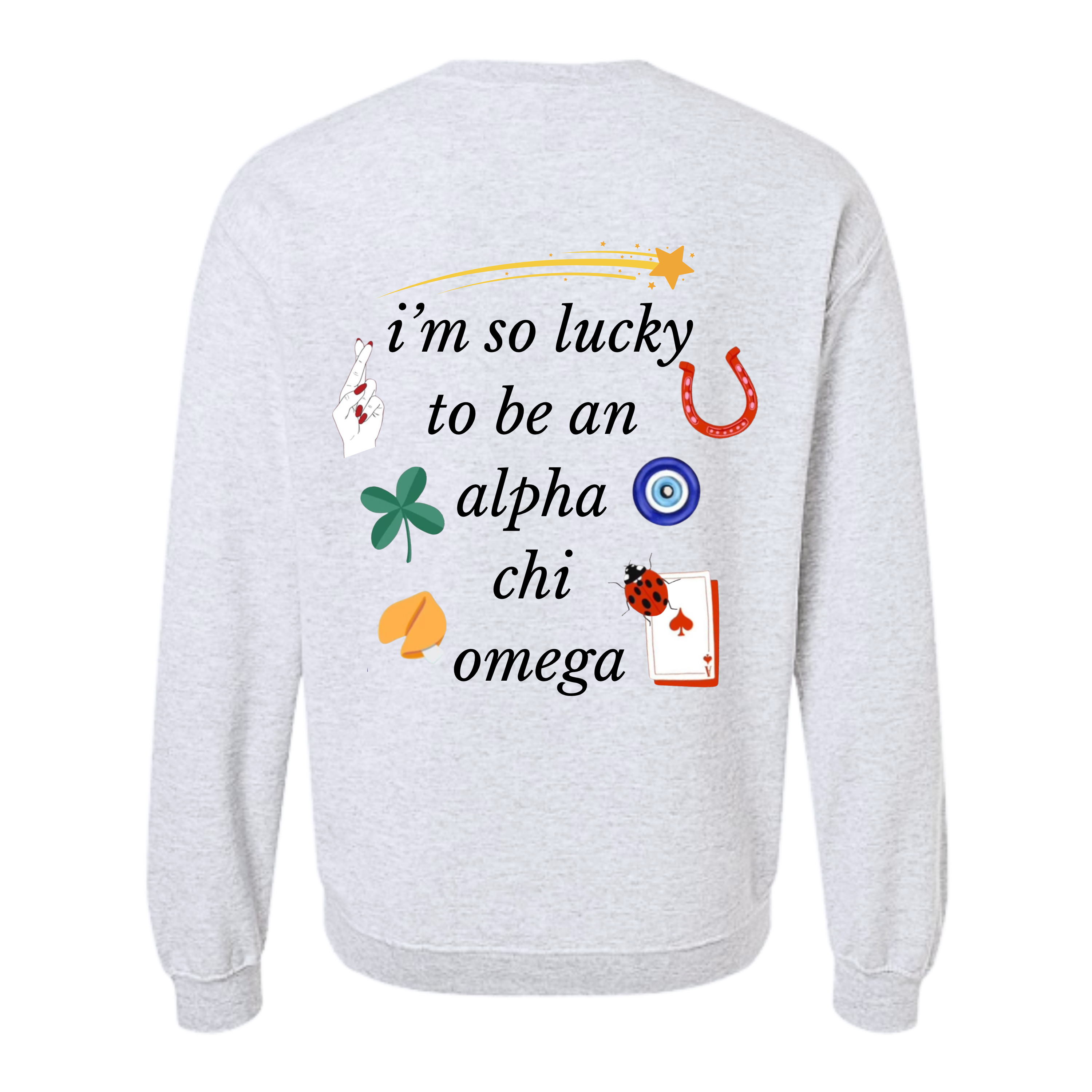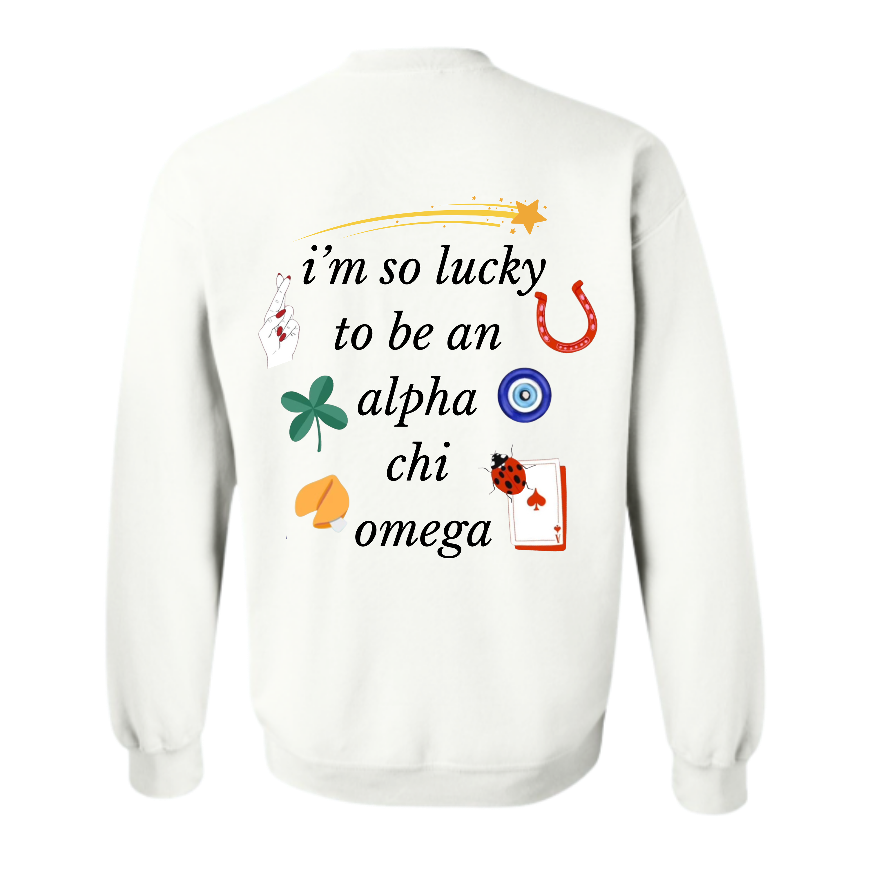 ☆ Step into your lucky girl era with the cutest, charm-inspired sorority crewneck of the season! This cozy, soft crewneck features a whimsical mix of lucky symbols — shooting stars, horseshoes, clovers, evil eye, ladybug, aces, charms, and more — all wrapped around the phrase “I’m so lucky to be a [Your Sorority]”. It’s sweet, sentimental, and instantly aesthetic for every sister.