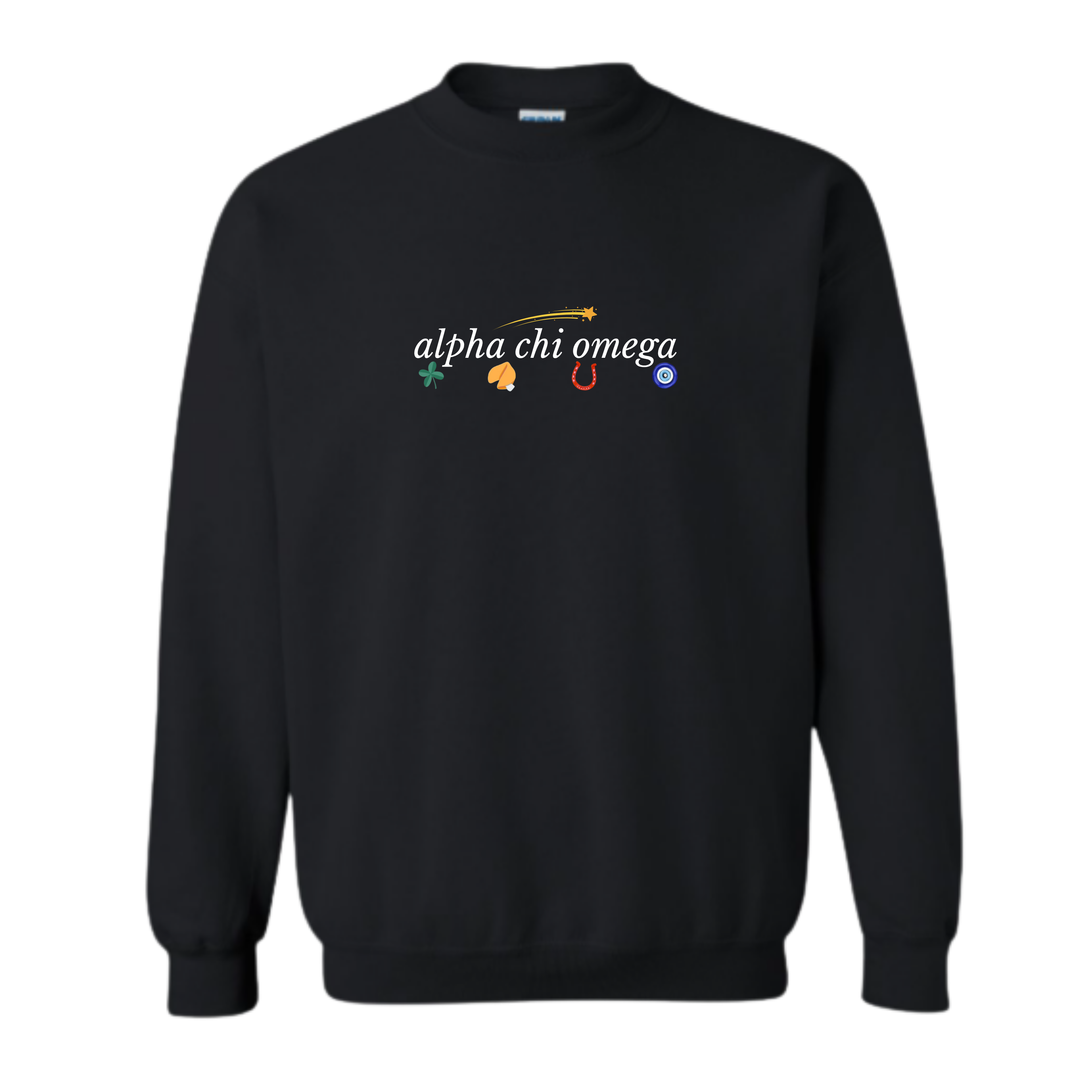 ☆ Choose your sorority and we’ll personalize the design for your chapter — Chi Omega, Zeta Tau Alpha, Alpha Phi, Kappa Delta, Delta Gamma, Phi Mu, Alpha Chi Omega, and so many more. Each crewneck also includes a matching mini charm graphic on the front chest to complete the look.