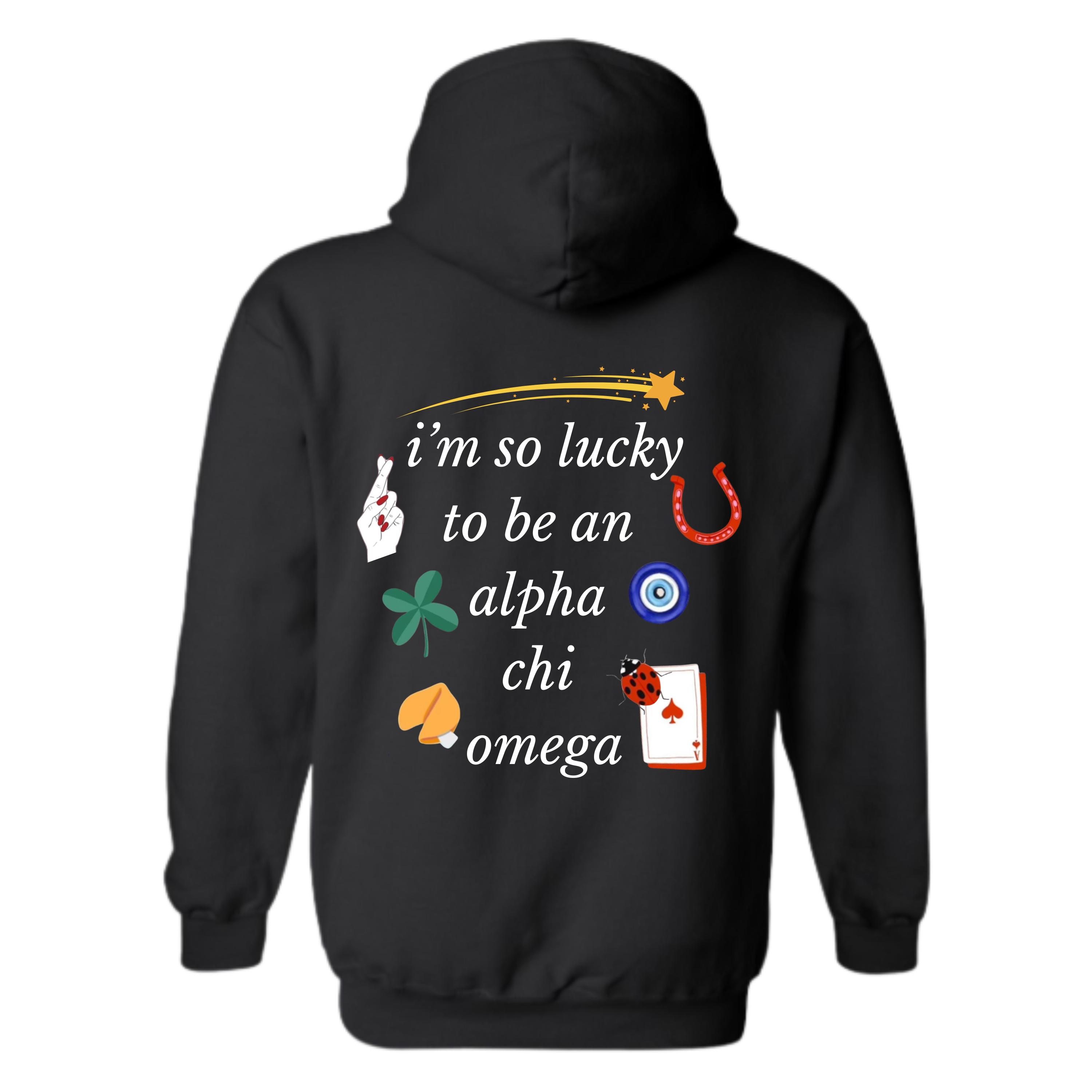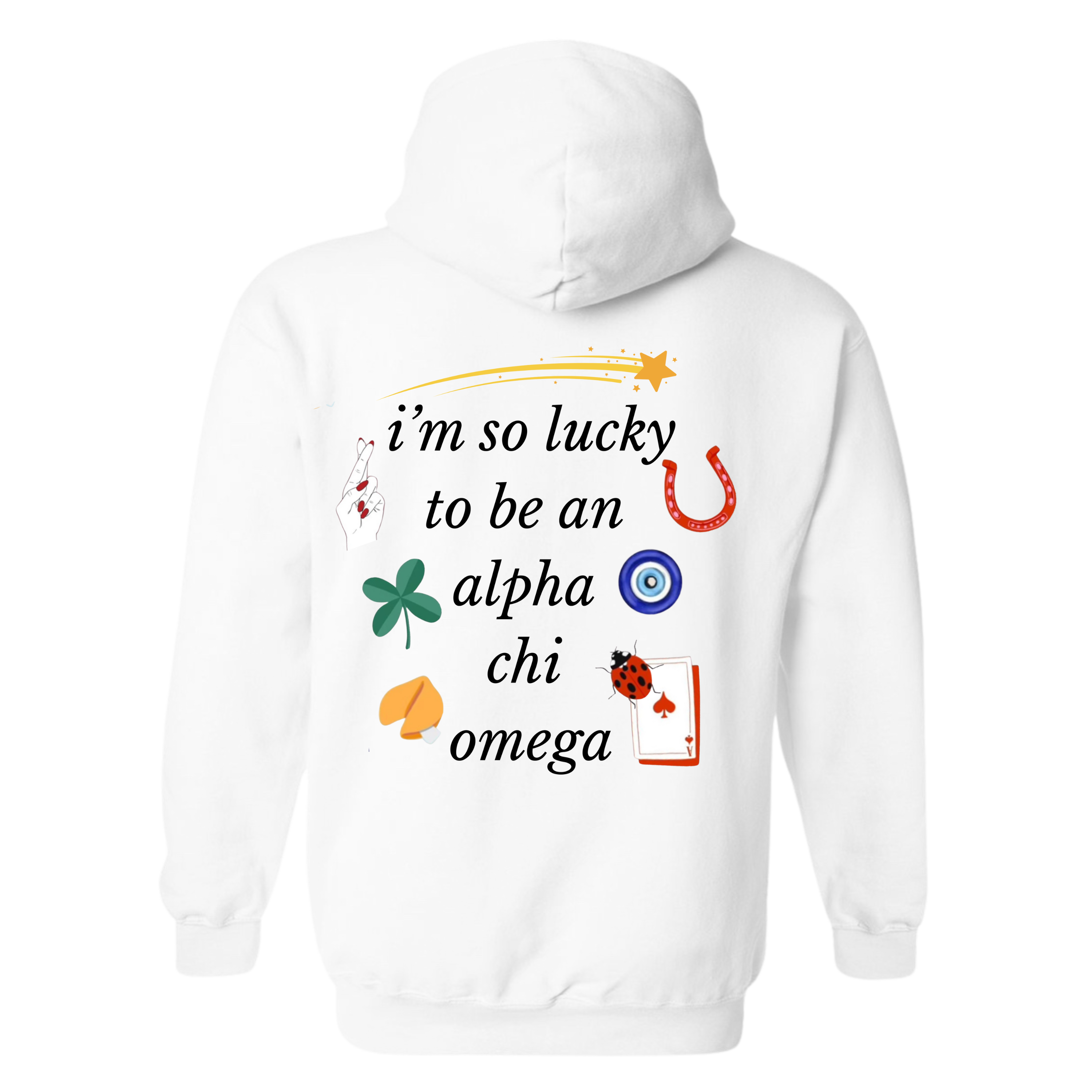 ☆ Get ready to embrace your lucky girl era with the cutest, most charm-filled sorority hoodie of the year! This cozy unisex hoodie features a playful mix of lucky symbols — shooting stars, horseshoes, clovers, evil eye, ladybug, aces, and more — wrapped around the phrase “I’m so lucky to be a [Your Sorority]”. It’s the perfect blend of trendy, girly, and sentimental for every sister.