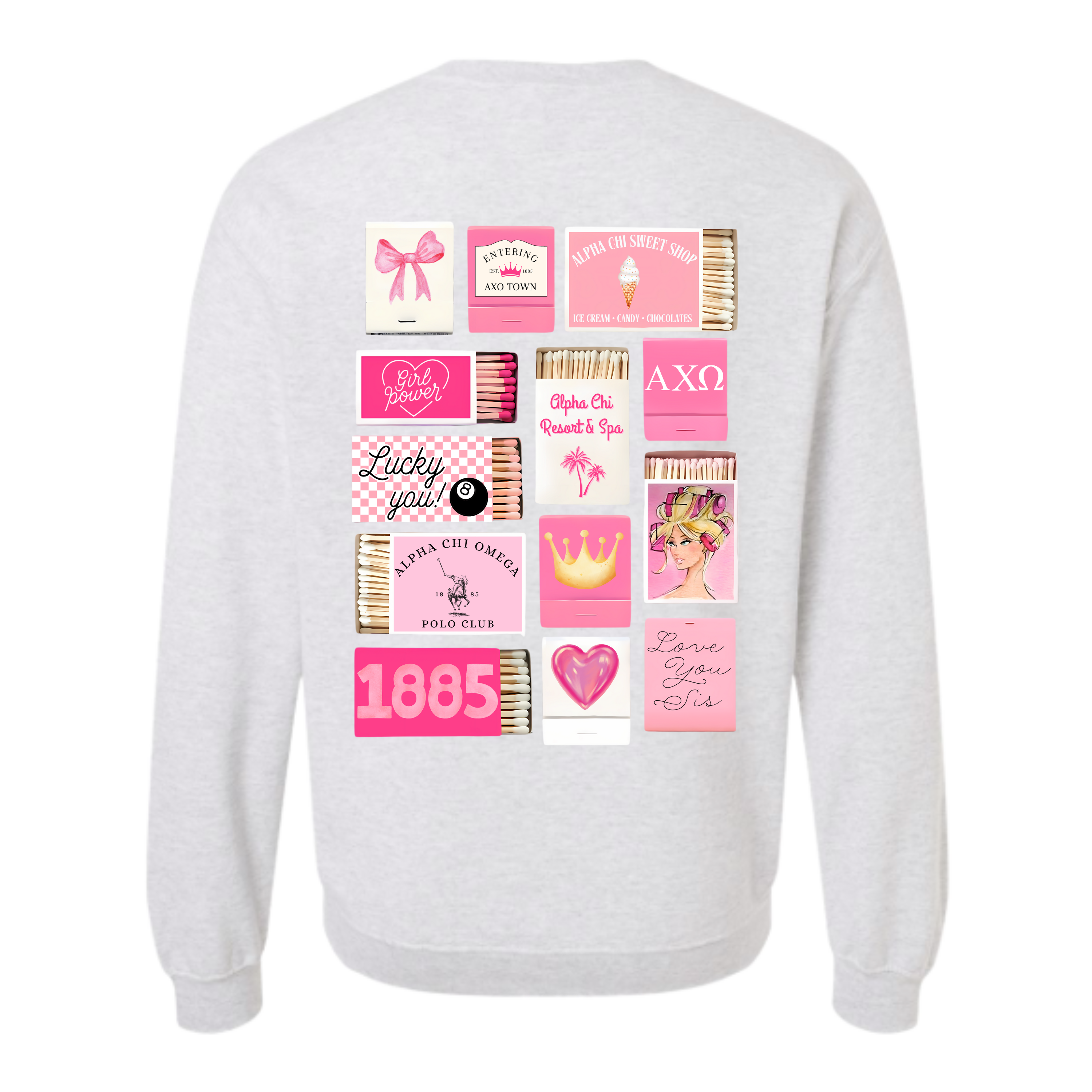 ☆ Our Matchbox Sorority Crewneck Sweatshirt is the definition of cute, cozy, and so campus-core. Designed with a mini sorority year detail on the front and a full matchbox-style collage graphic on the back, this sweatshirt is perfect for showing off your chapter pride in a fun, girly way.