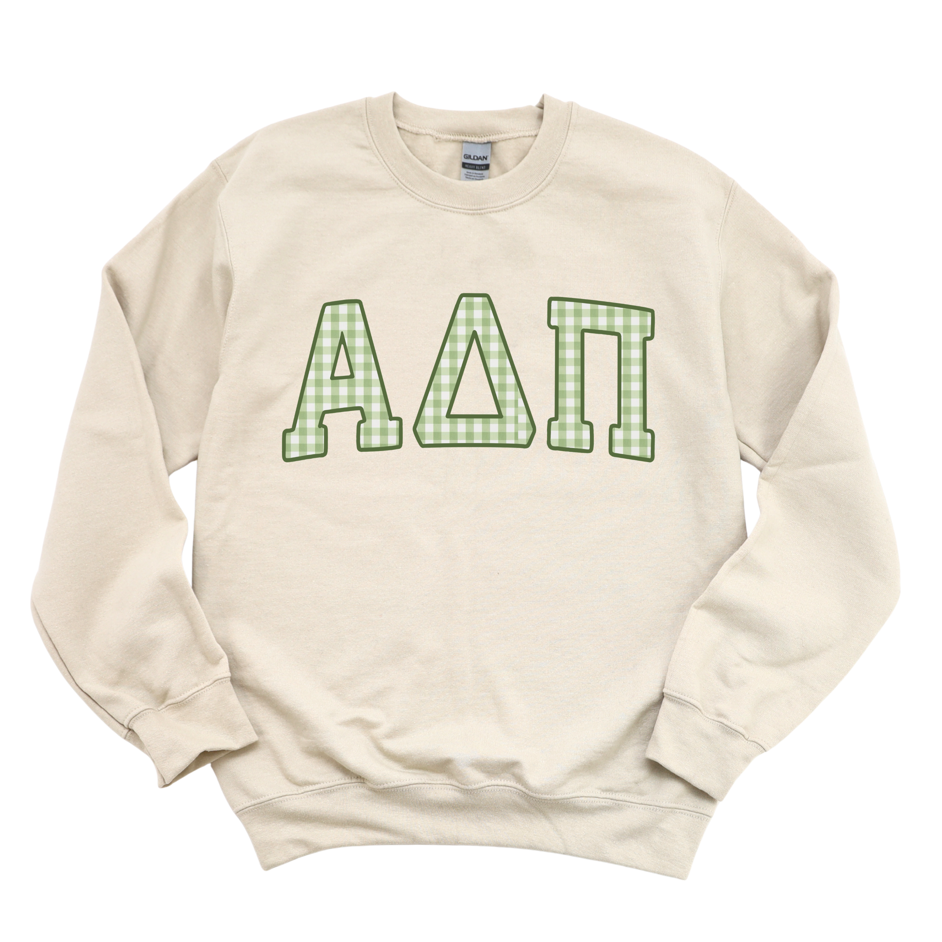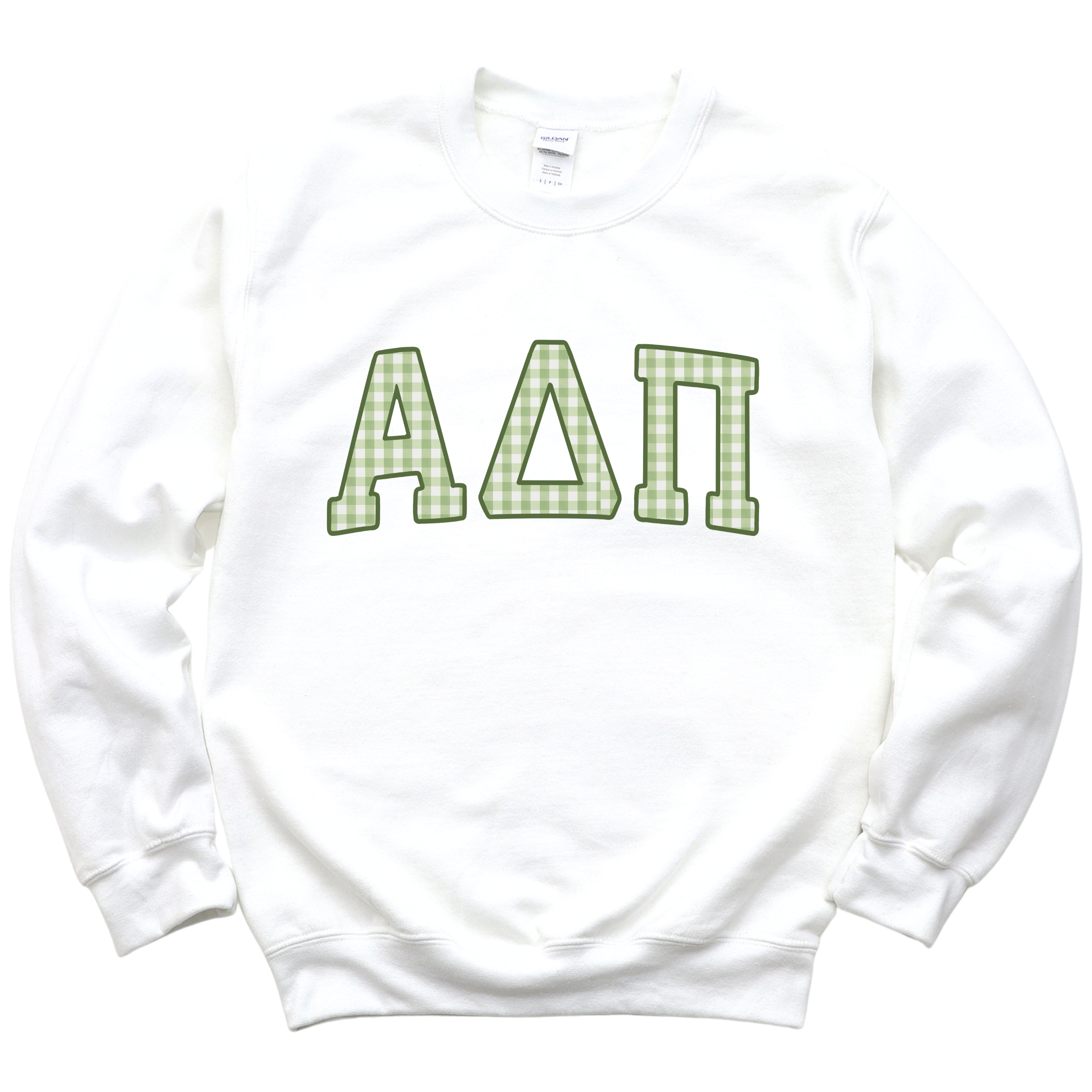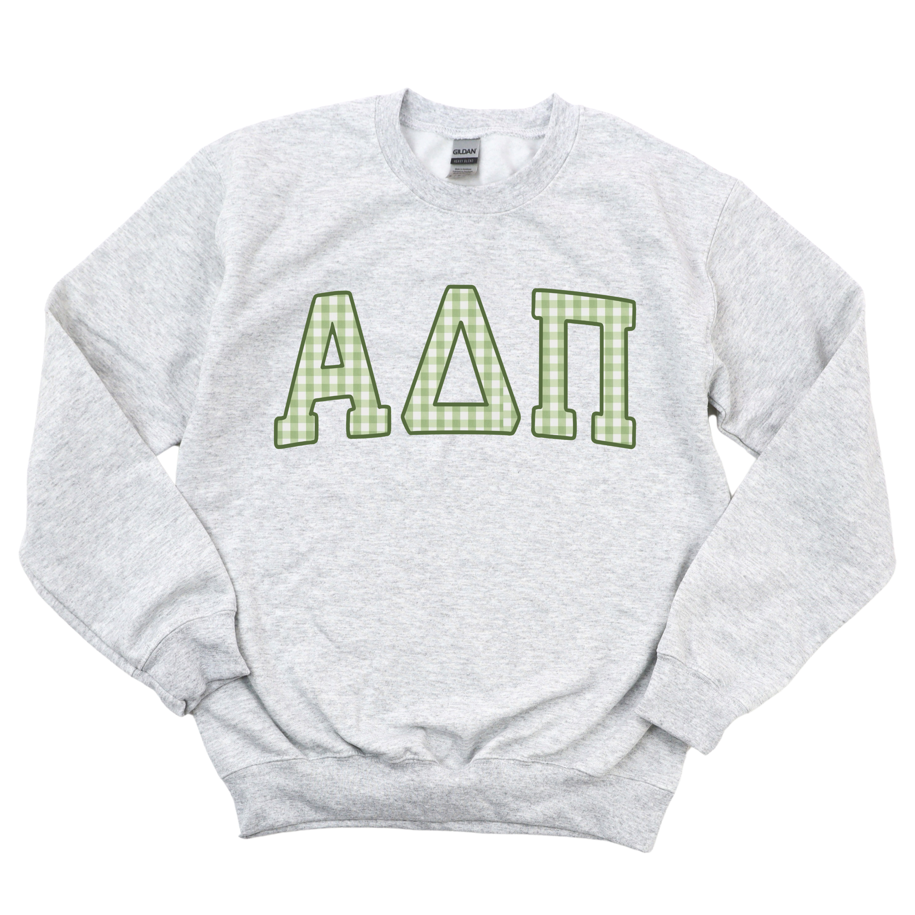 Rep your sisterhood in the cutest way with our Green Plaid Greek Letters Crewneck. Featuring classic varsity-style Greek letters filled with a soft green plaid pattern, this cozy sweatshirt is perfect for class, chapter events, or lounging with your sisters. It’s a timeless design that pairs perfectly with leggings, jeans, or your favorite comfy shorts.