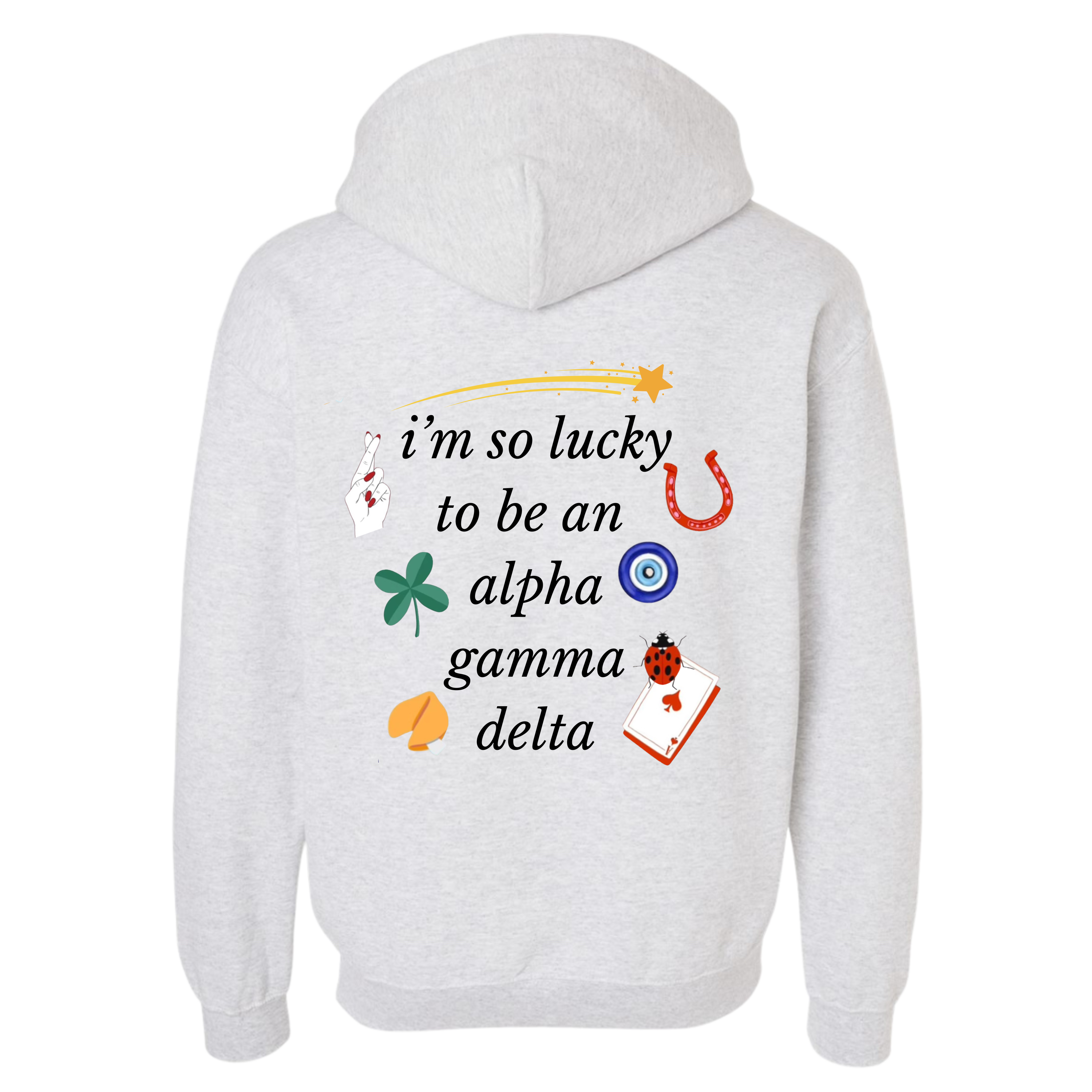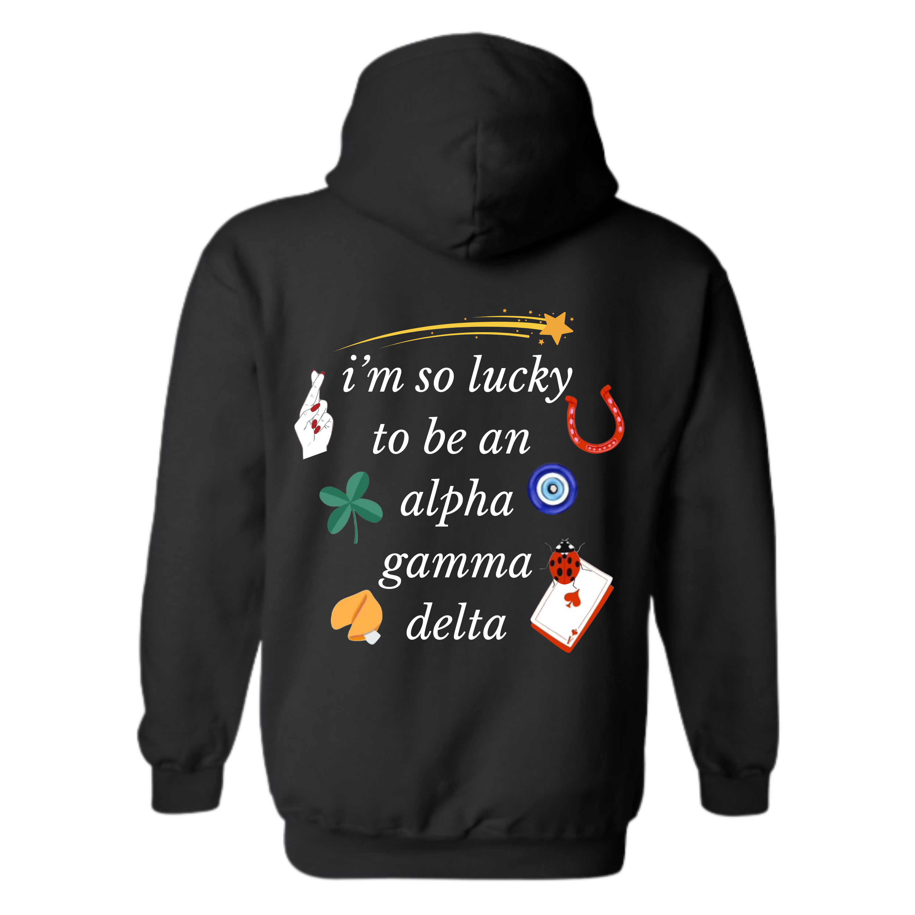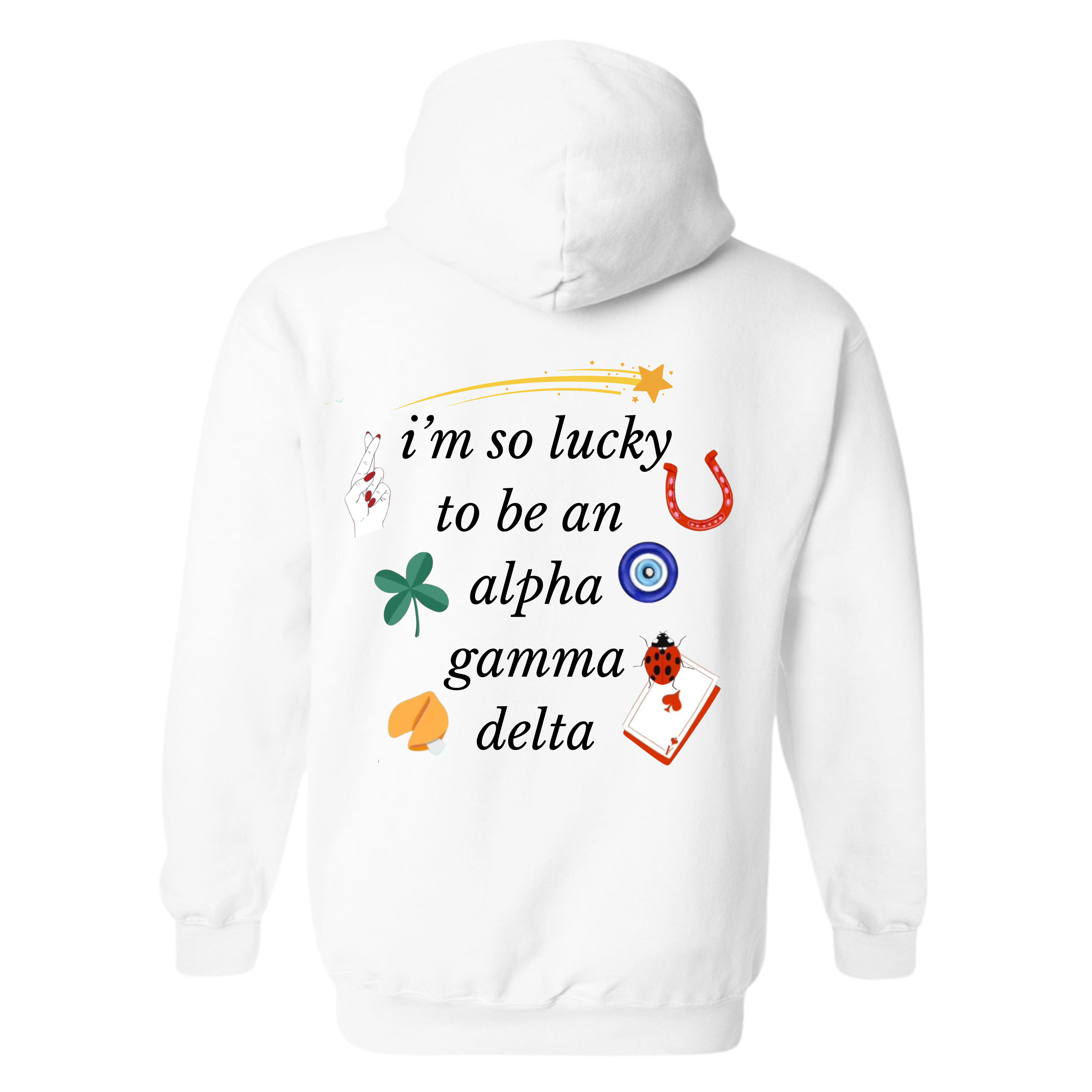 ☆ Get ready to embrace your lucky girl era with the cutest, most charm-filled sorority hoodie of the year! This cozy unisex hoodie features a playful mix of lucky symbols — shooting stars, horseshoes, clovers, evil eye, ladybug, aces, and more — wrapped around the phrase “I’m so lucky to be a [Your Sorority]”. It’s the perfect blend of trendy, girly, and sentimental for every sister.