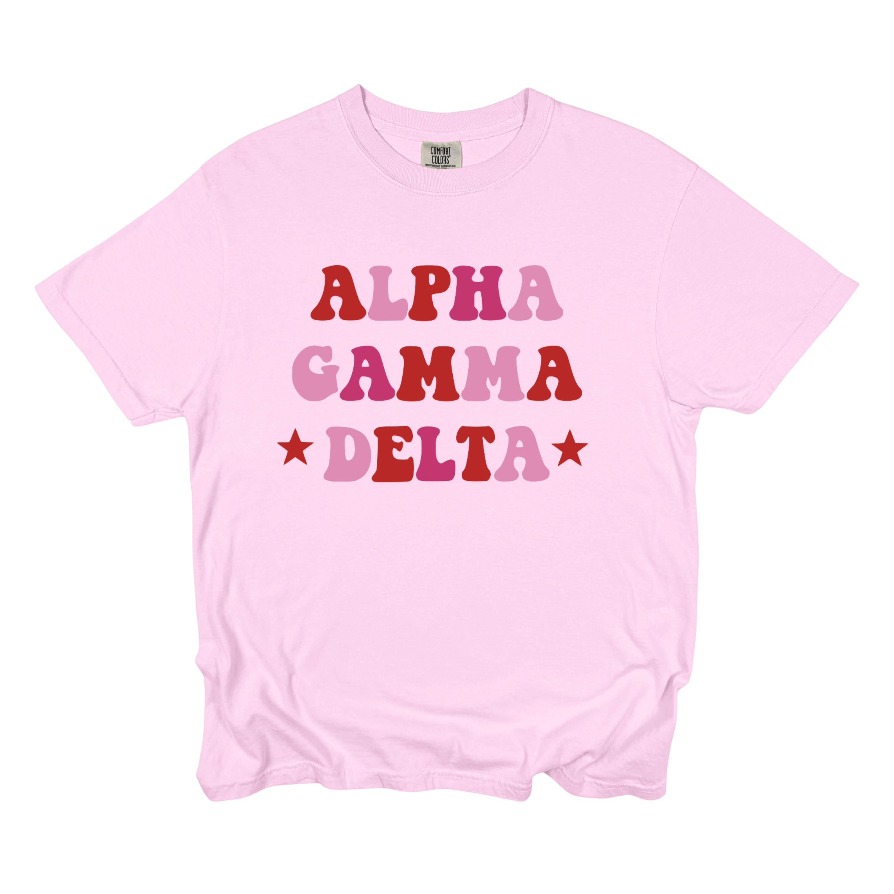 Show off your sisterhood in style with this retro pink and red sorority tee! Designed with bold, bubbly lettering in shades of cherry red, bubblegum pink, blush, and rose, this design pops beautifully against the light pastel pink Comfort Colors tee. The mix of warm, girly tones gives it a fun and nostalgic feel — perfect for bid day, big/little reveal, or everyday campus wear.