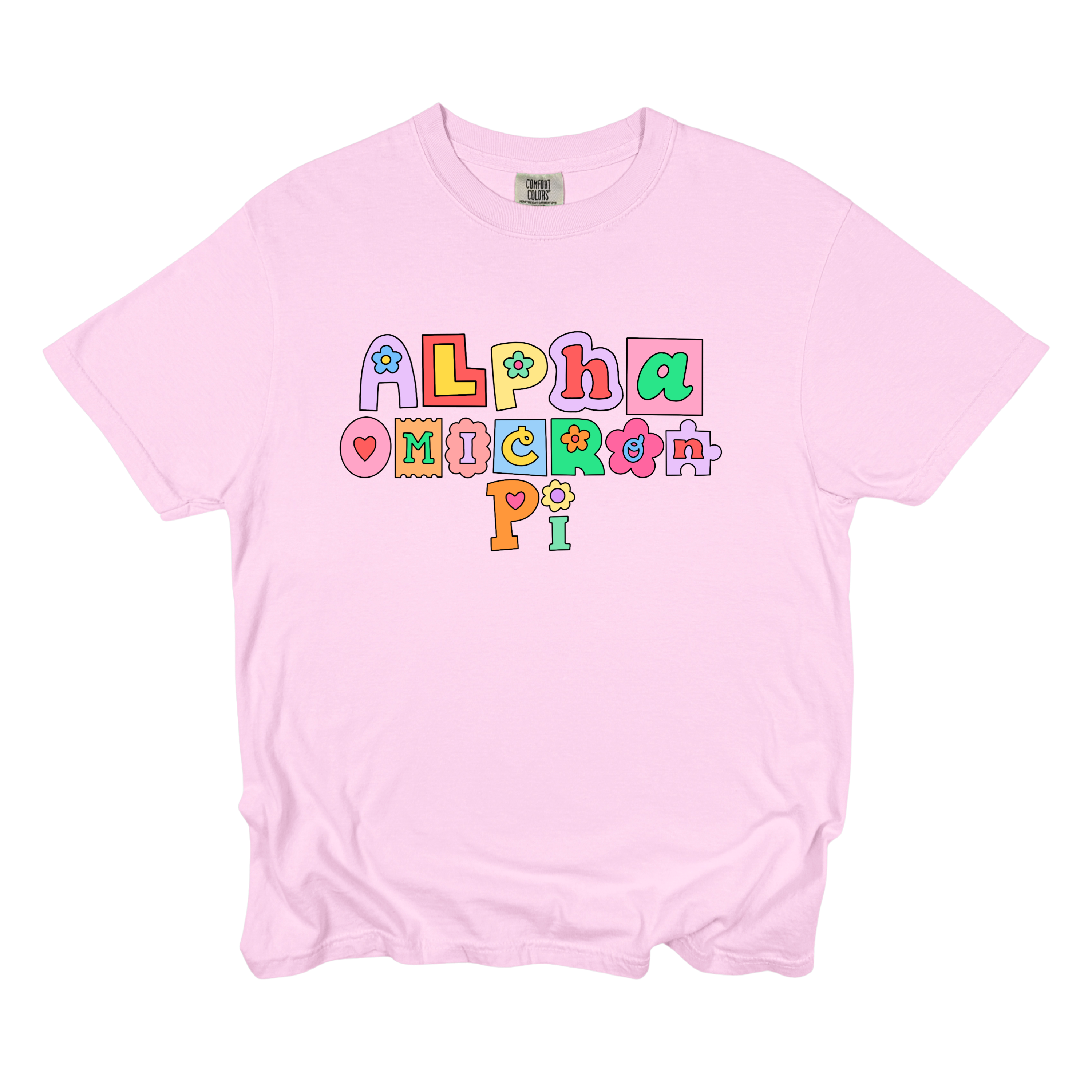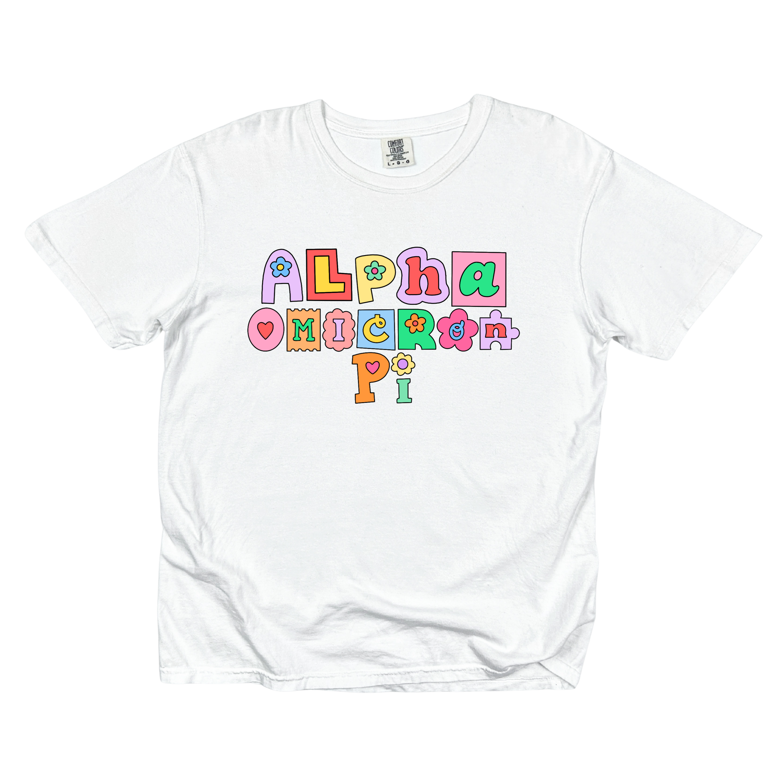 Add some color to your sisterhood style with this Patchwork Sorority Tee — a bright and cheerful design featuring your sorority name in fun, retro-inspired shapes. Each letter is framed by flowers, hearts, and groovy icons for the ultimate feel-good vibe.