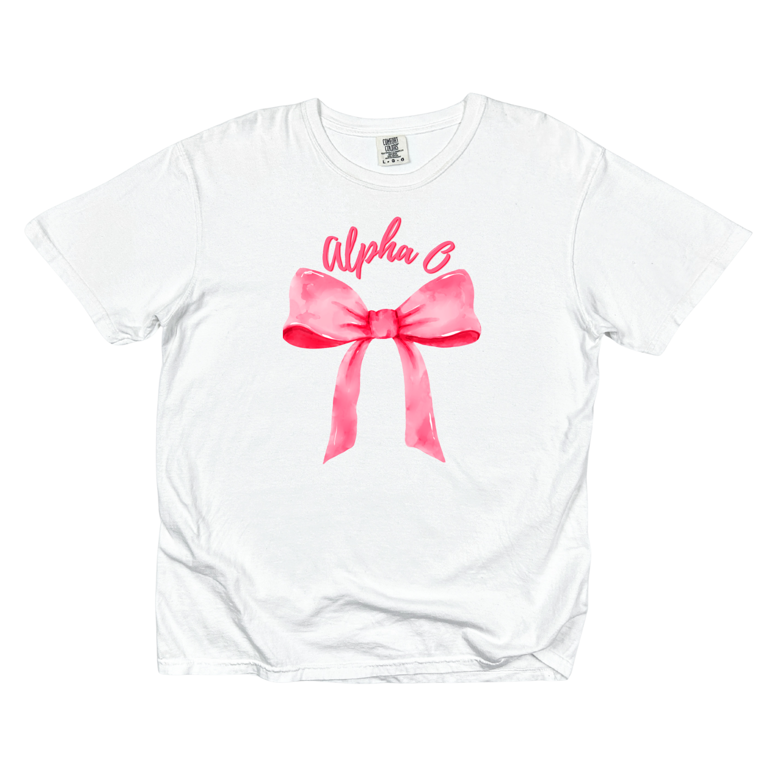 Add a touch of girly charm to your Greek-life wardrobe with our Sorority Bow Tee! Featuring a bold, watercolor bow graphic and your sorority name in a trendy handwritten font, this shirt is perfect for bid day, work week, big/little reveal, or everyday campus wear.