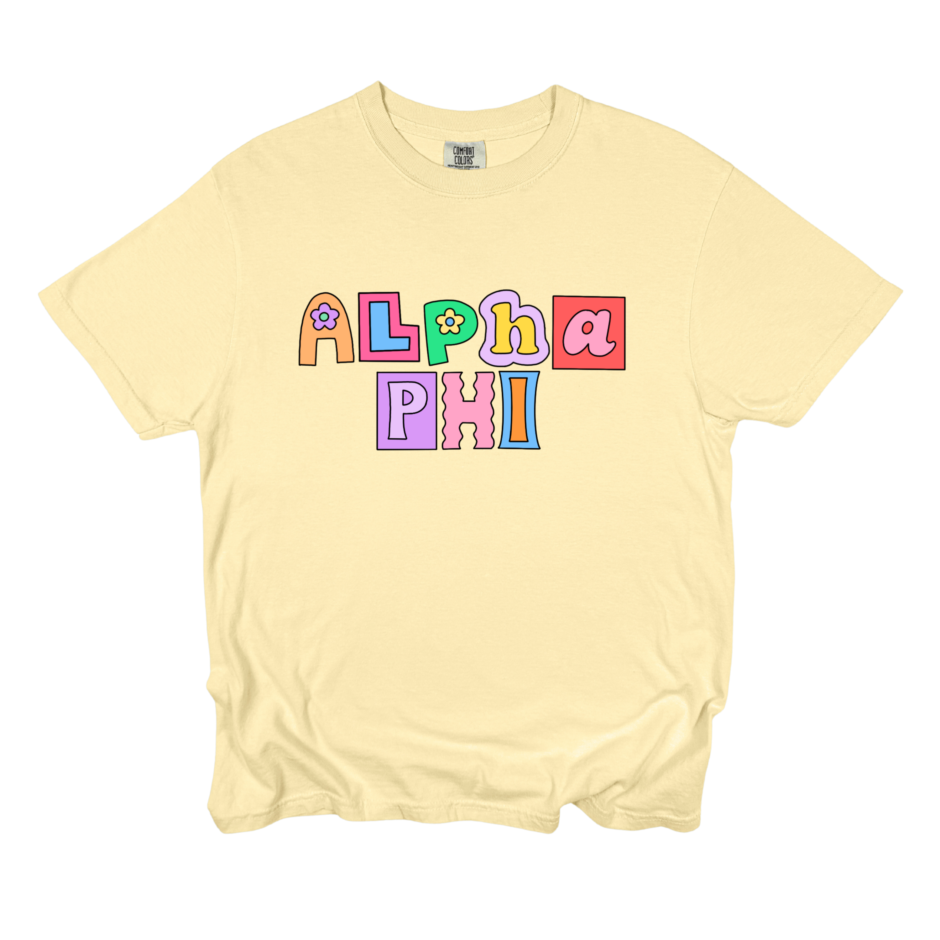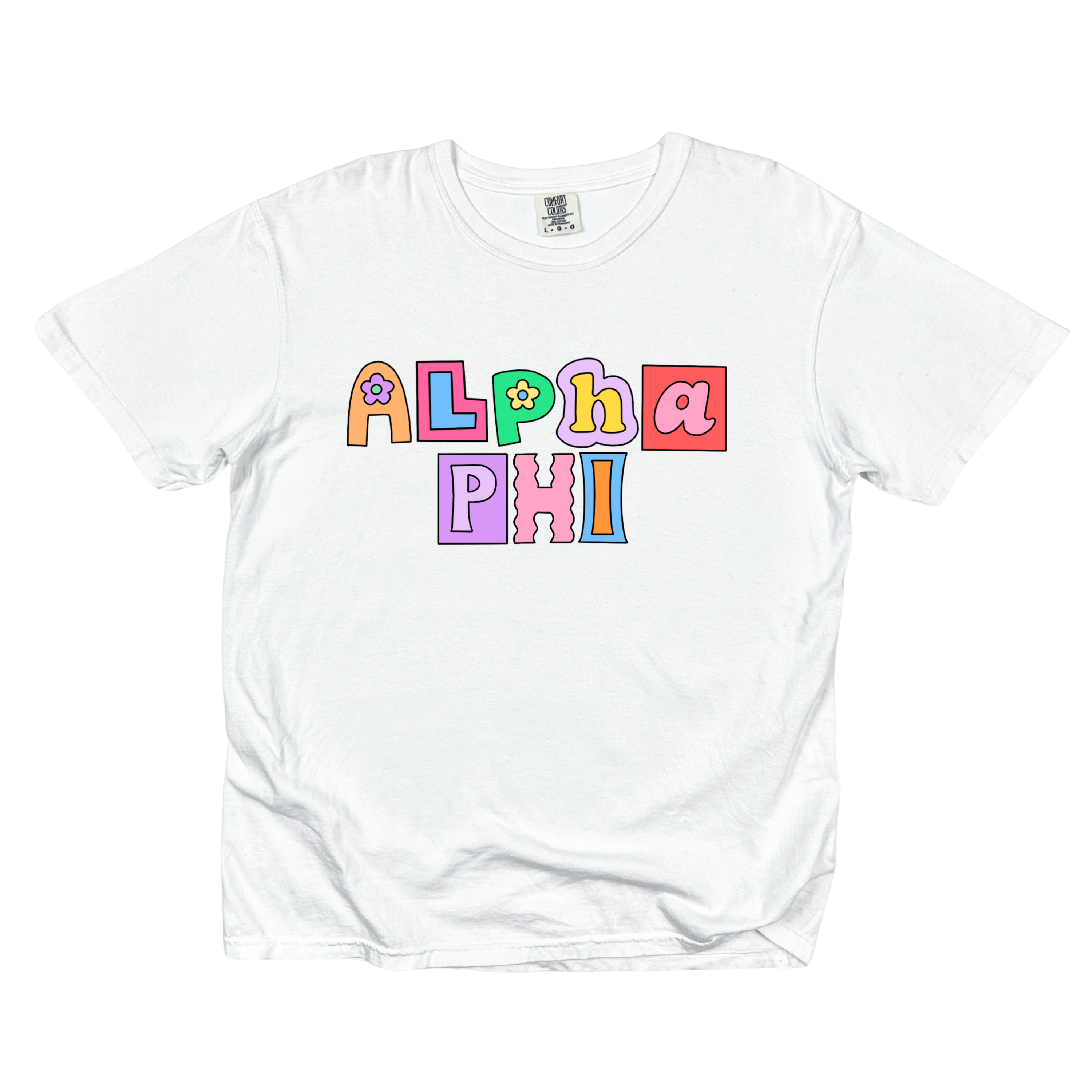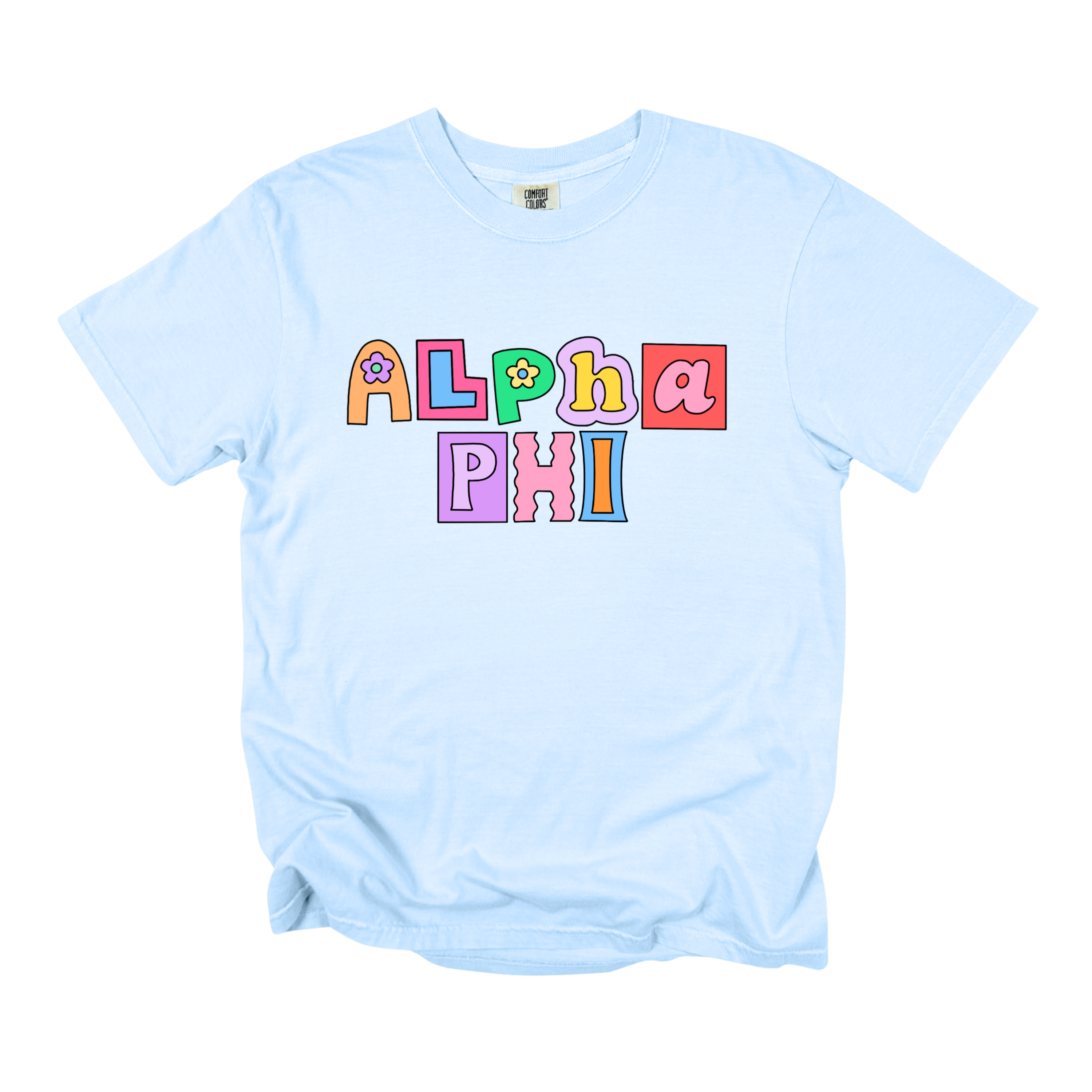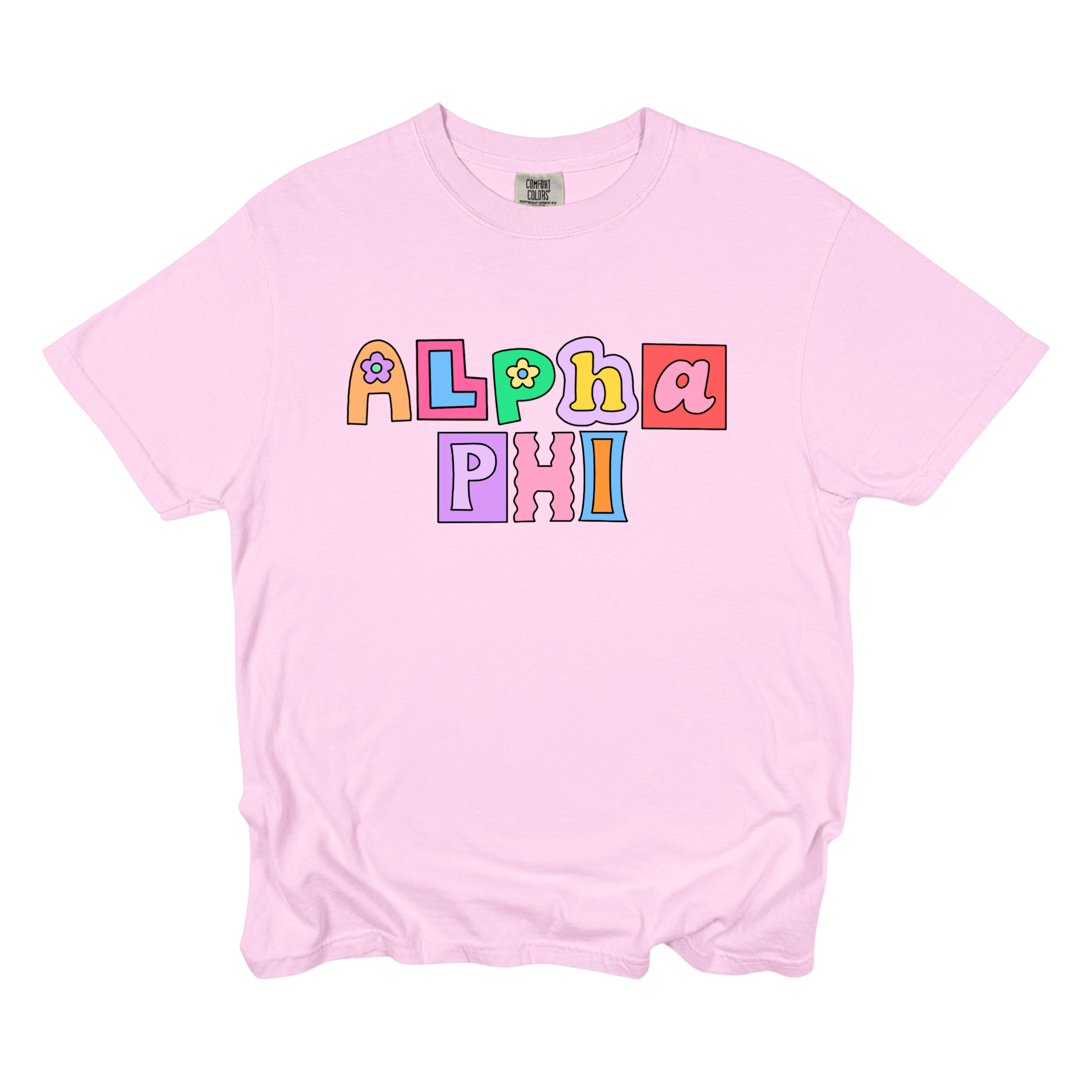 Printed on a soft Comfort Colors tee, this shirt brings together pastel and pop-art colors — lavender, yellow, coral, turquoise, and pink — that look adorable on every background. Available in White, Chambray, Blossom, Butter, and Orchid, it’s the perfect mix of trendy and timeless for any sorority event.