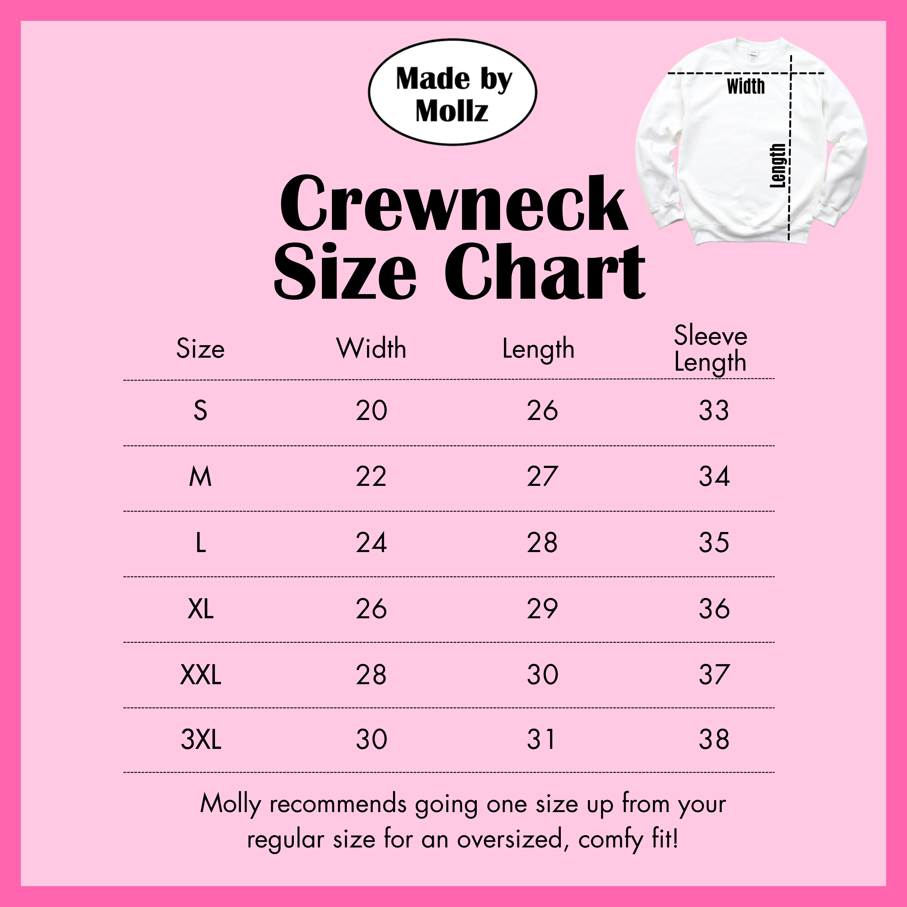 It’s recommended to size up from your usual clothing size for an oversized, comfy fit