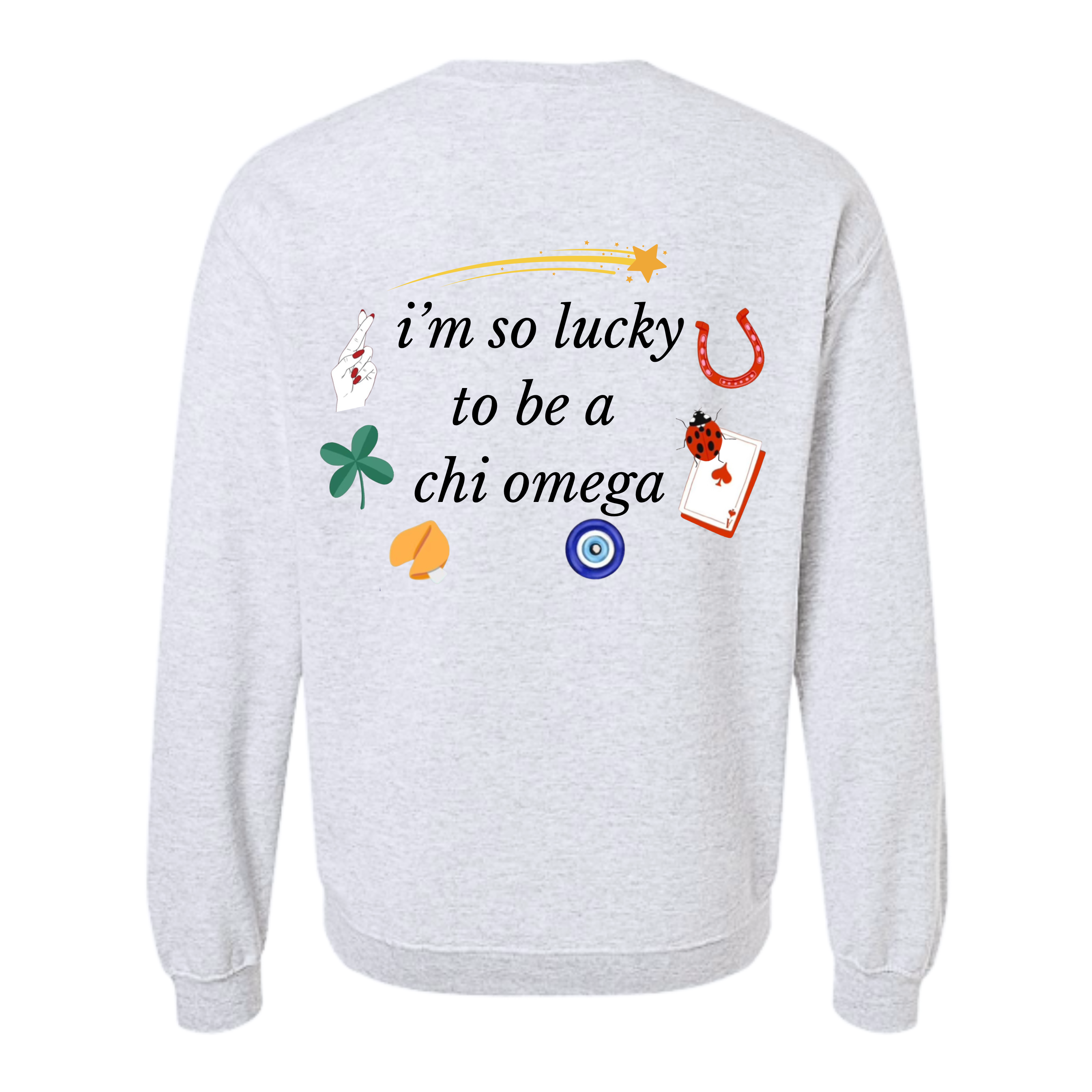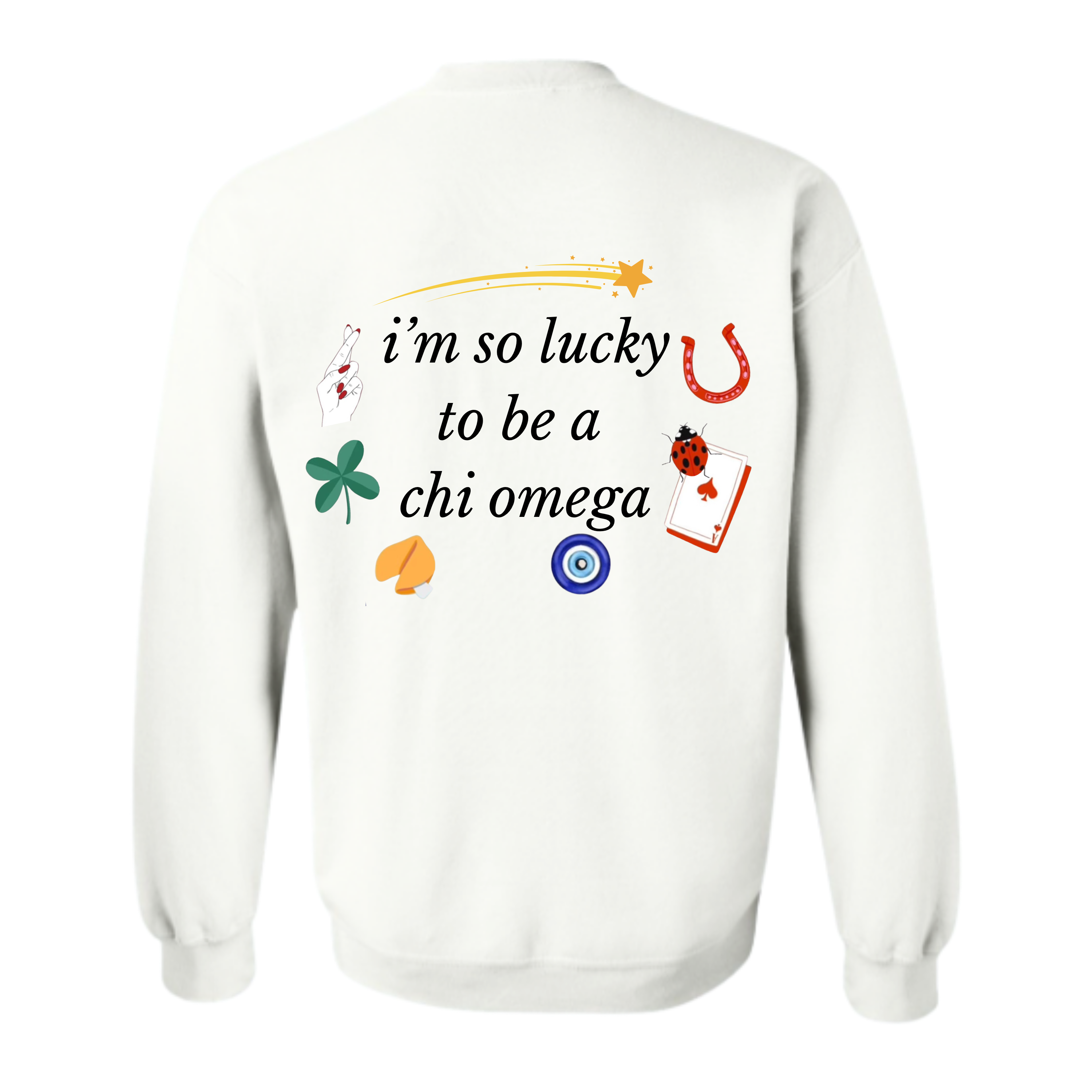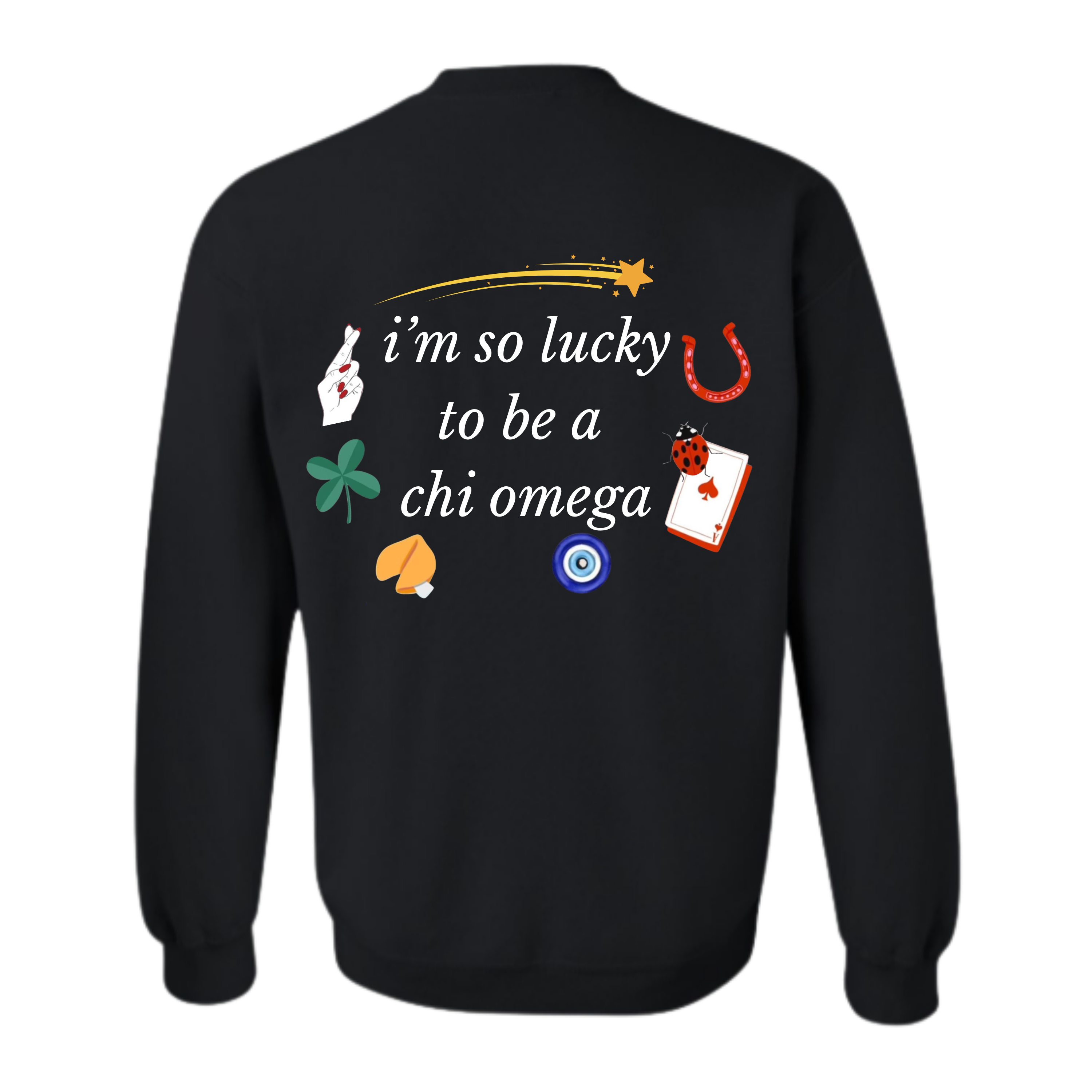 ☆ Step into your lucky girl era with the cutest, charm-inspired sorority crewneck of the season! This cozy, soft crewneck features a whimsical mix of lucky symbols — shooting stars, horseshoes, clovers, evil eye, ladybug, aces, charms, and more — all wrapped around the phrase “I’m so lucky to be a [Your Sorority]”. It’s sweet, sentimental, and instantly aesthetic for every sister.