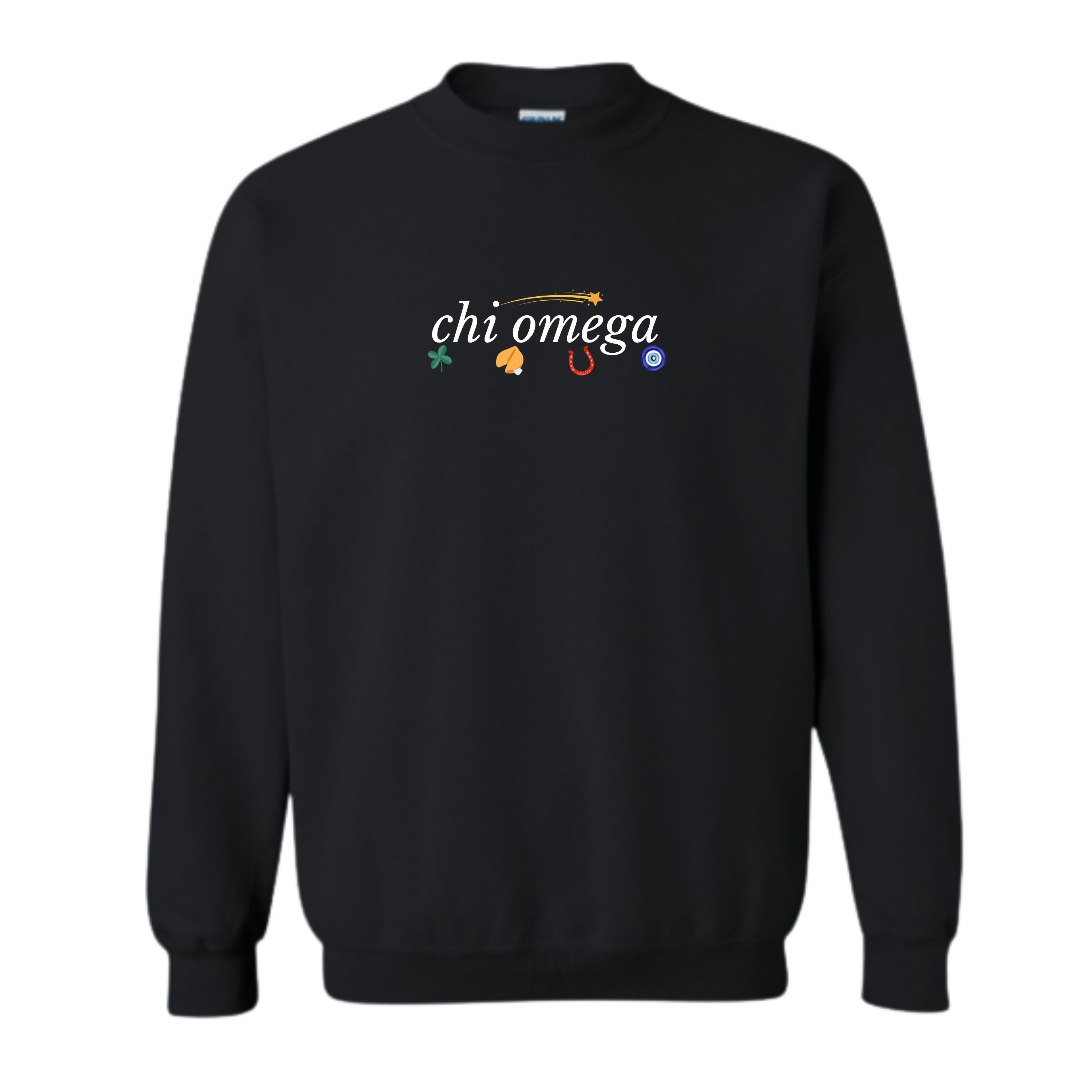 ☆ Choose your sorority and we’ll personalize the design for your chapter — Chi Omega, Zeta Tau Alpha, Alpha Phi, Kappa Delta, Delta Gamma, Phi Mu, Alpha Chi Omega, and so many more. Each crewneck also includes a matching mini charm graphic on the front chest to complete the look.