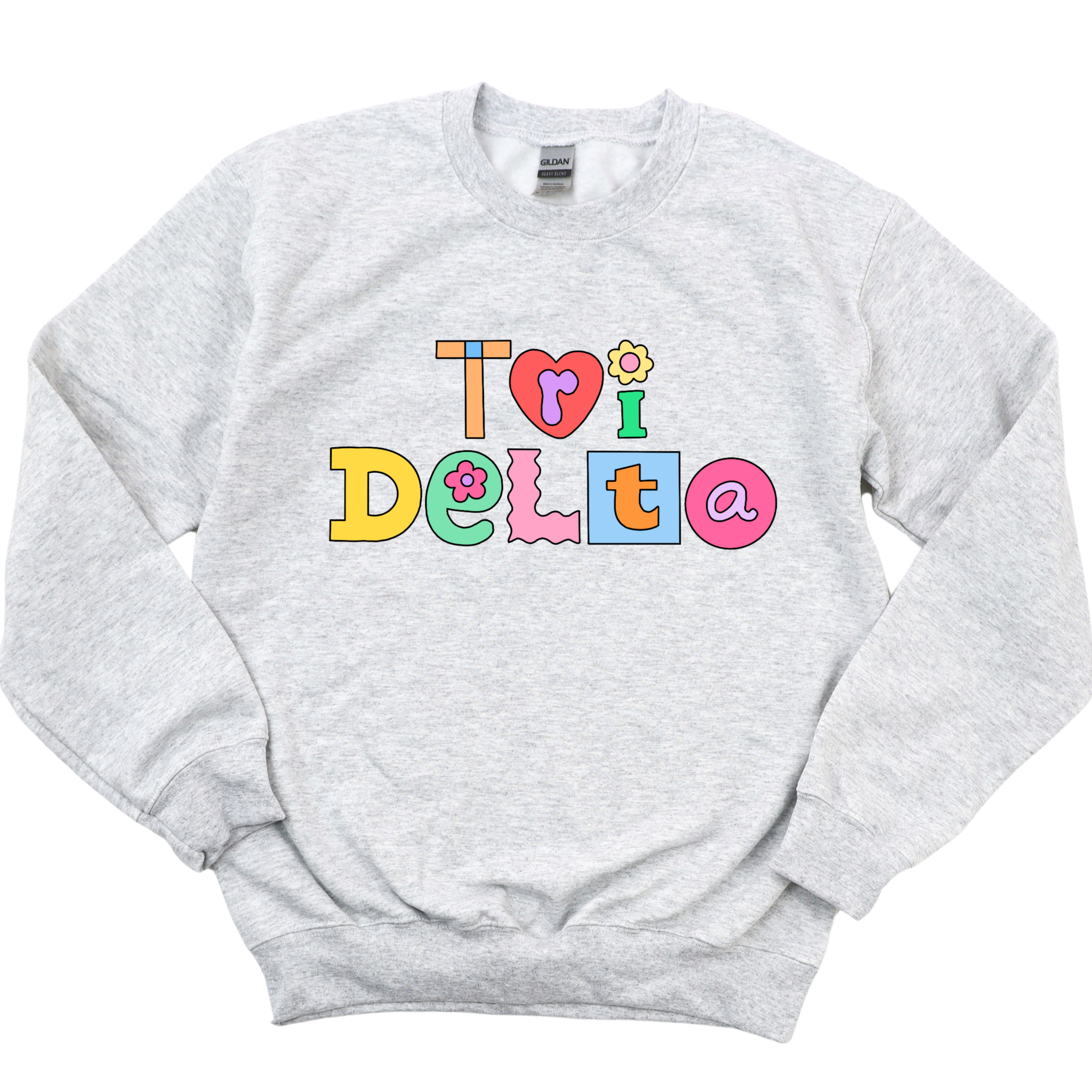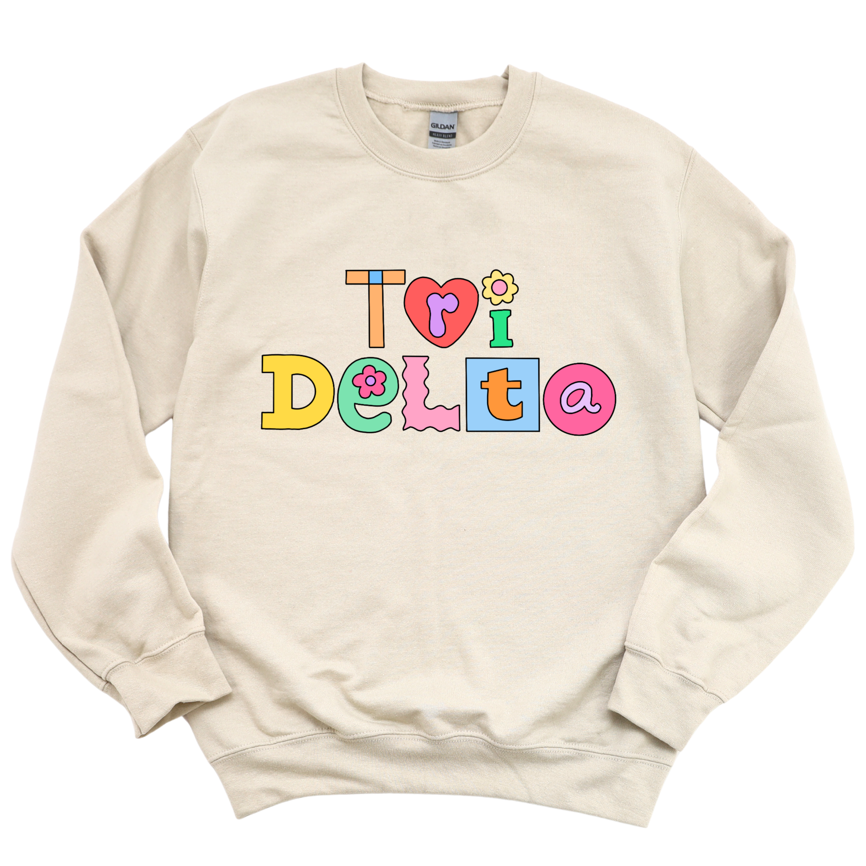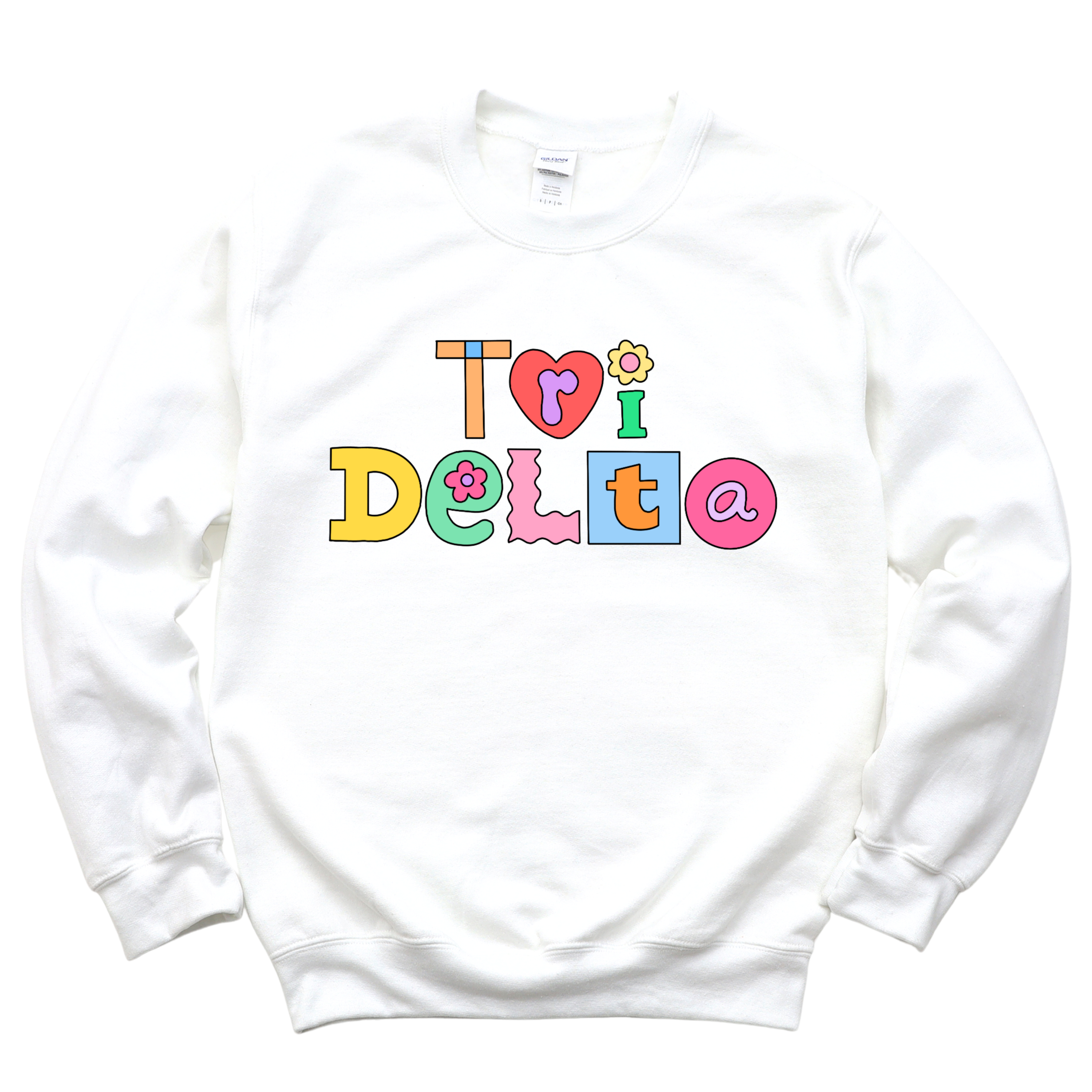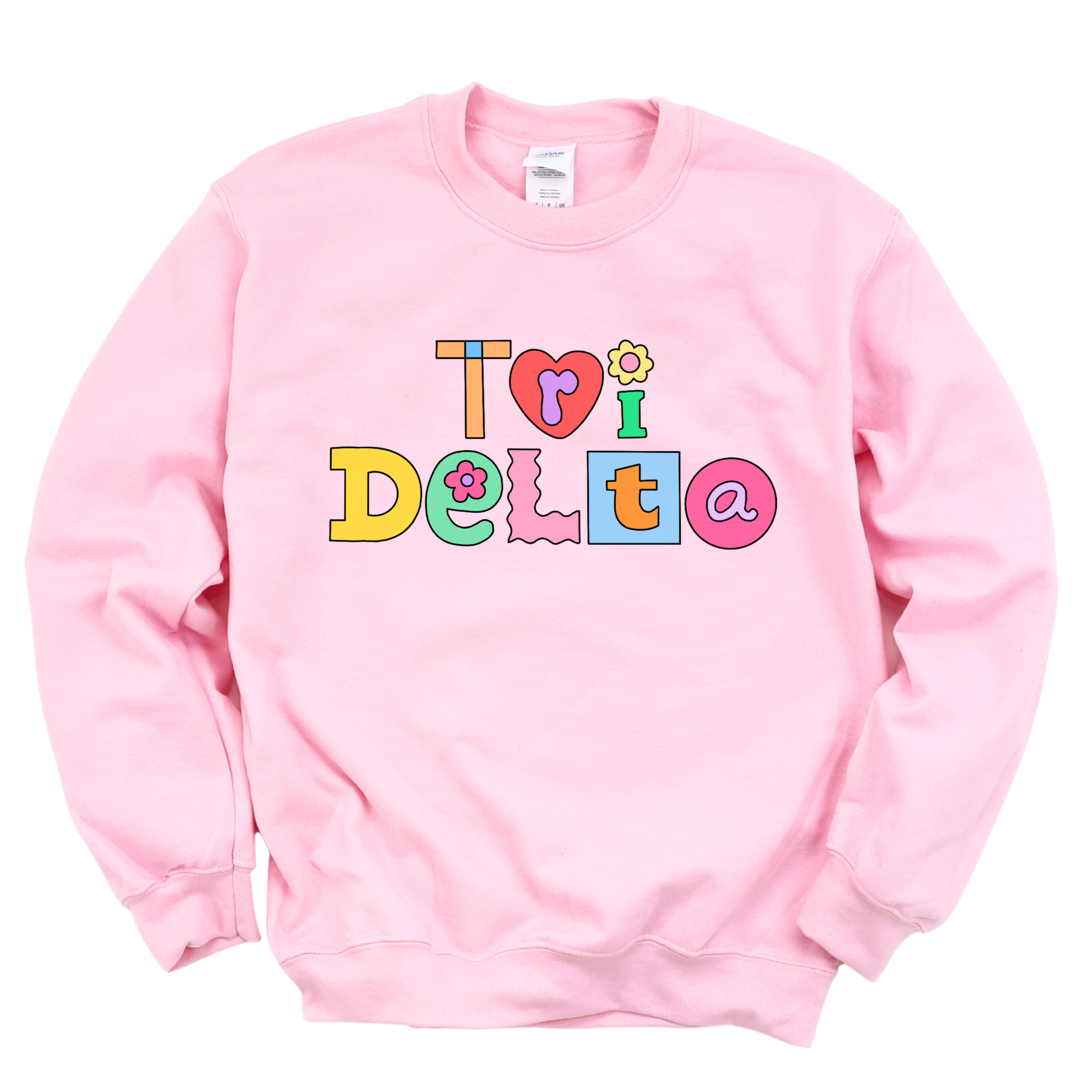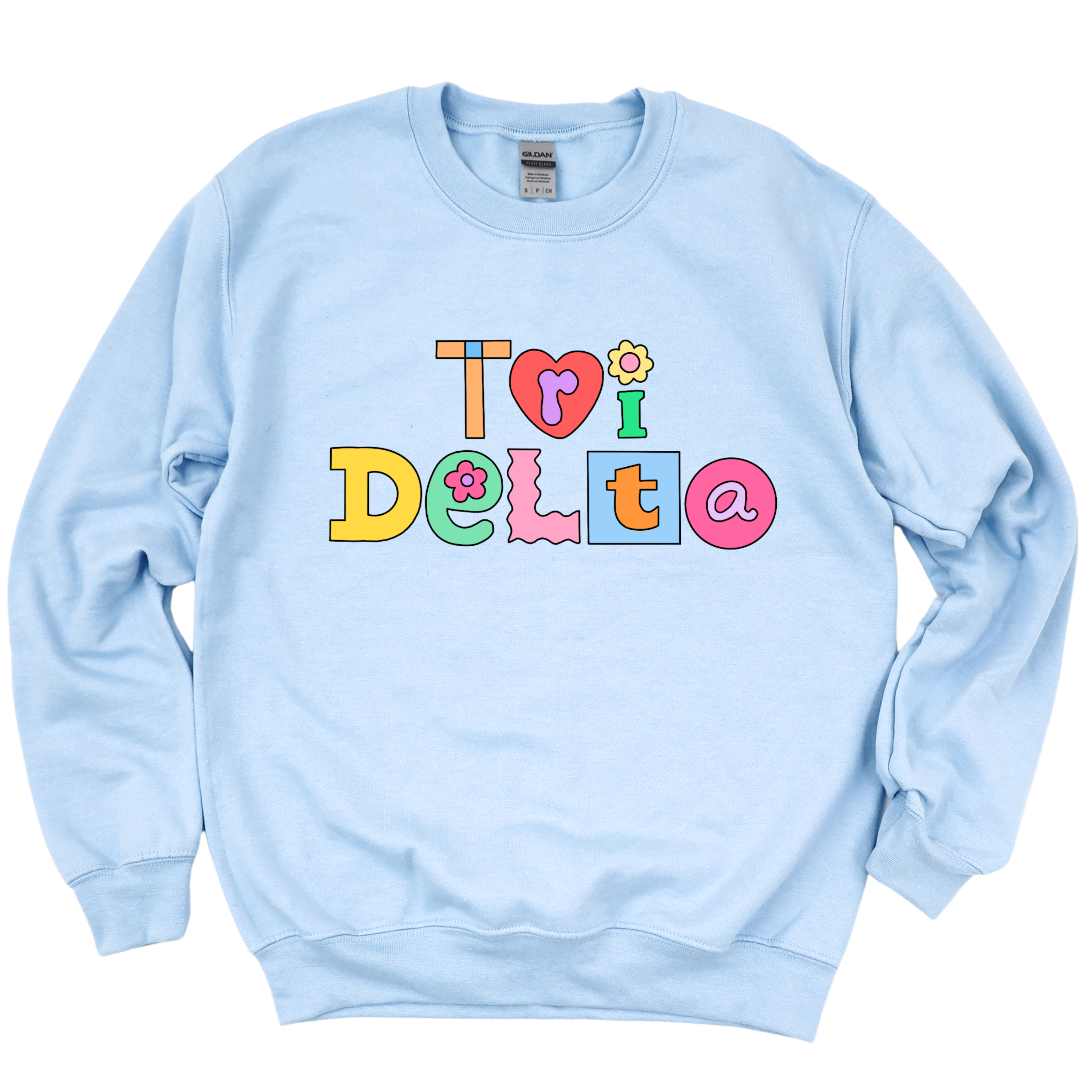 ☆ Bring some color and personality to your wardrobe with this fun block-letter crewneck sweatshirt! Featuring bold letters in vibrant shades, playful shapes, and cheerful accents like hearts and flowers, this cozy sweatshirt is perfect for anyone who loves a bright, uplifting style.