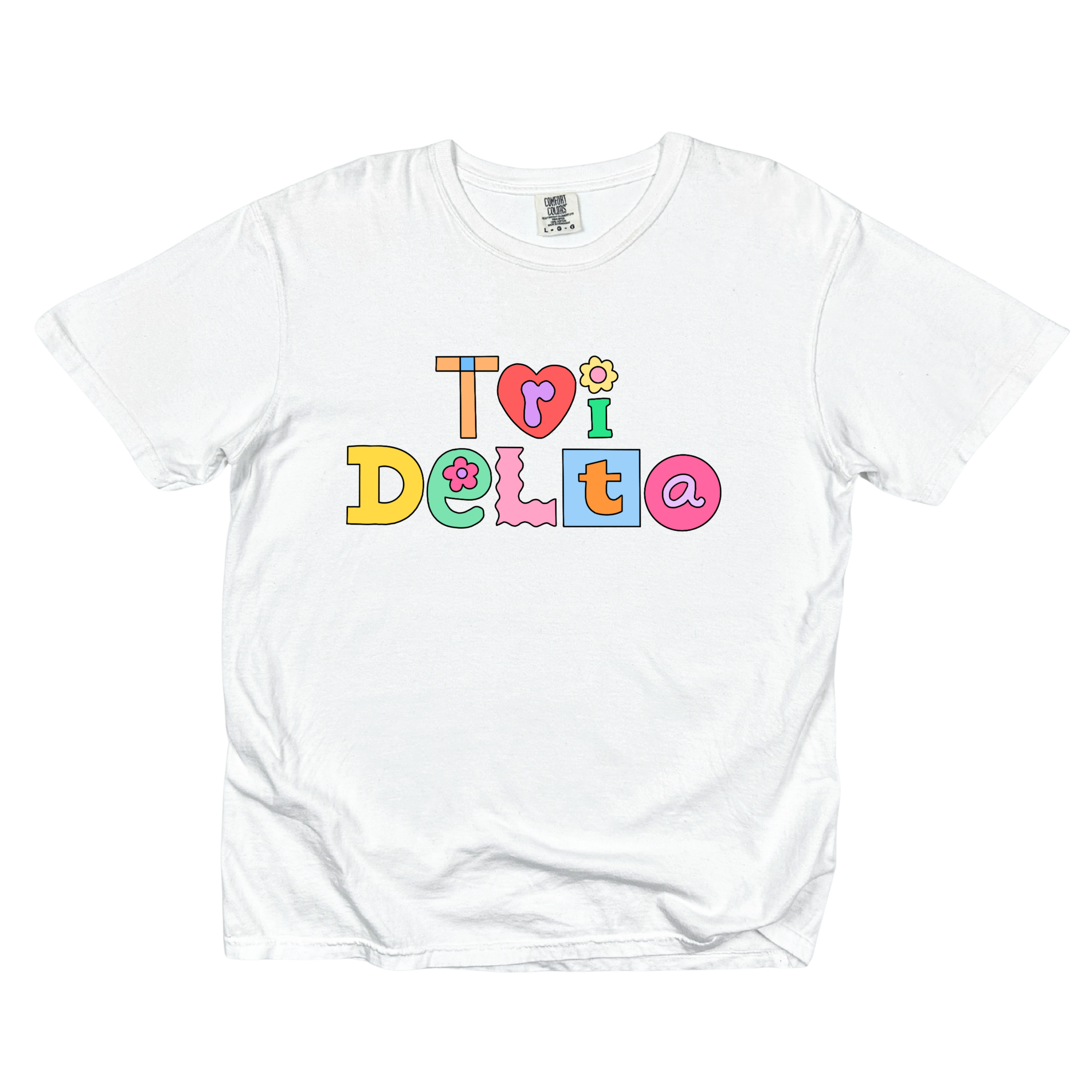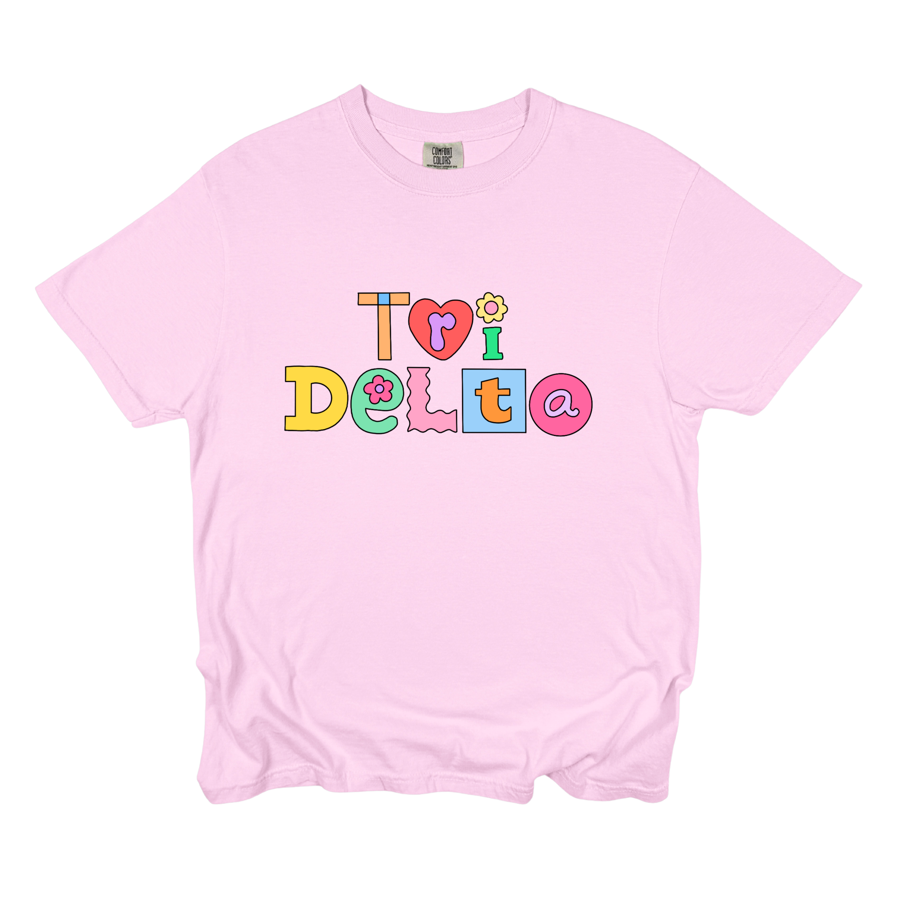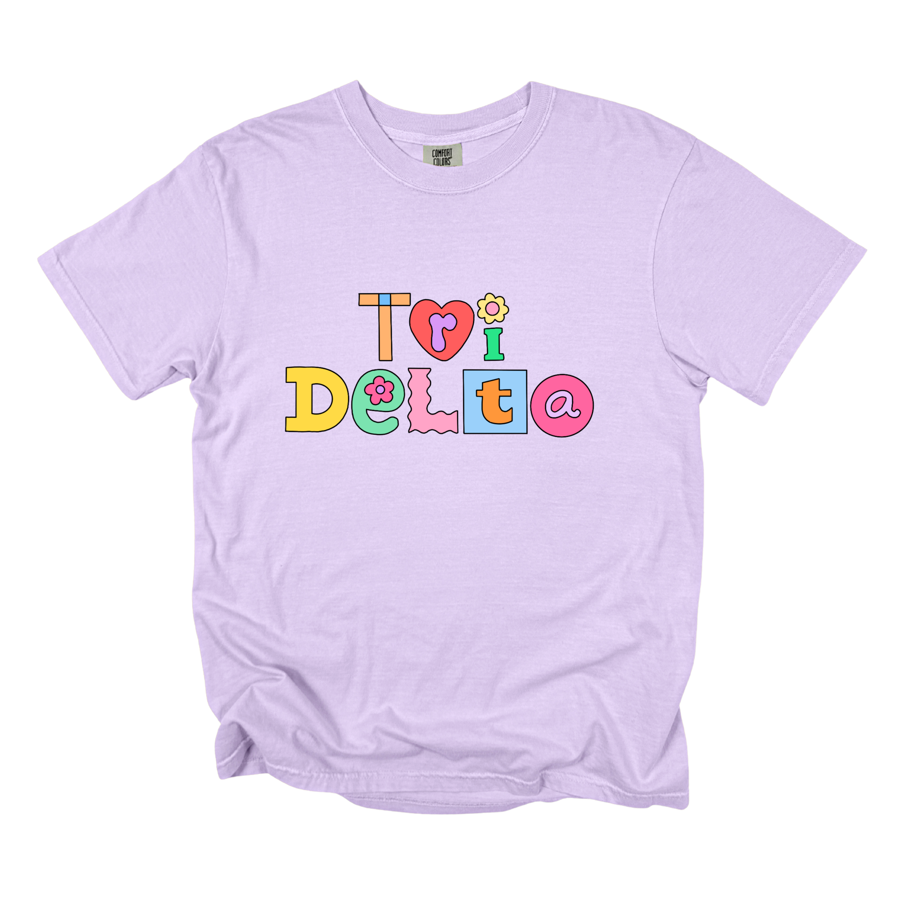 Printed on a soft Comfort Colors tee, this shirt brings together pastel and pop-art colors — lavender, yellow, coral, turquoise, and pink — that look adorable on every background. Available in White, Chambray, Blossom, Butter, and Orchid, it’s the perfect mix of trendy and timeless for any sorority event.