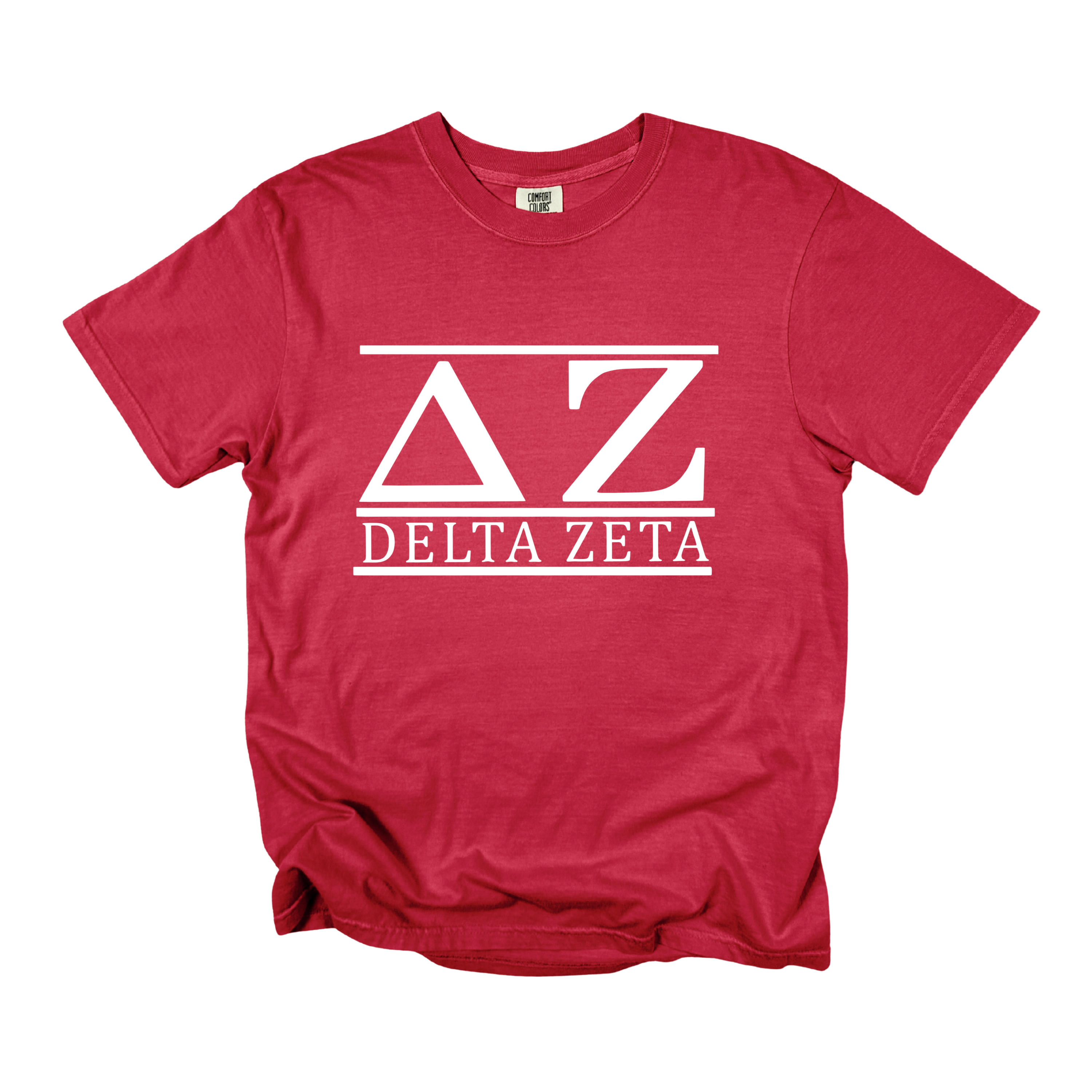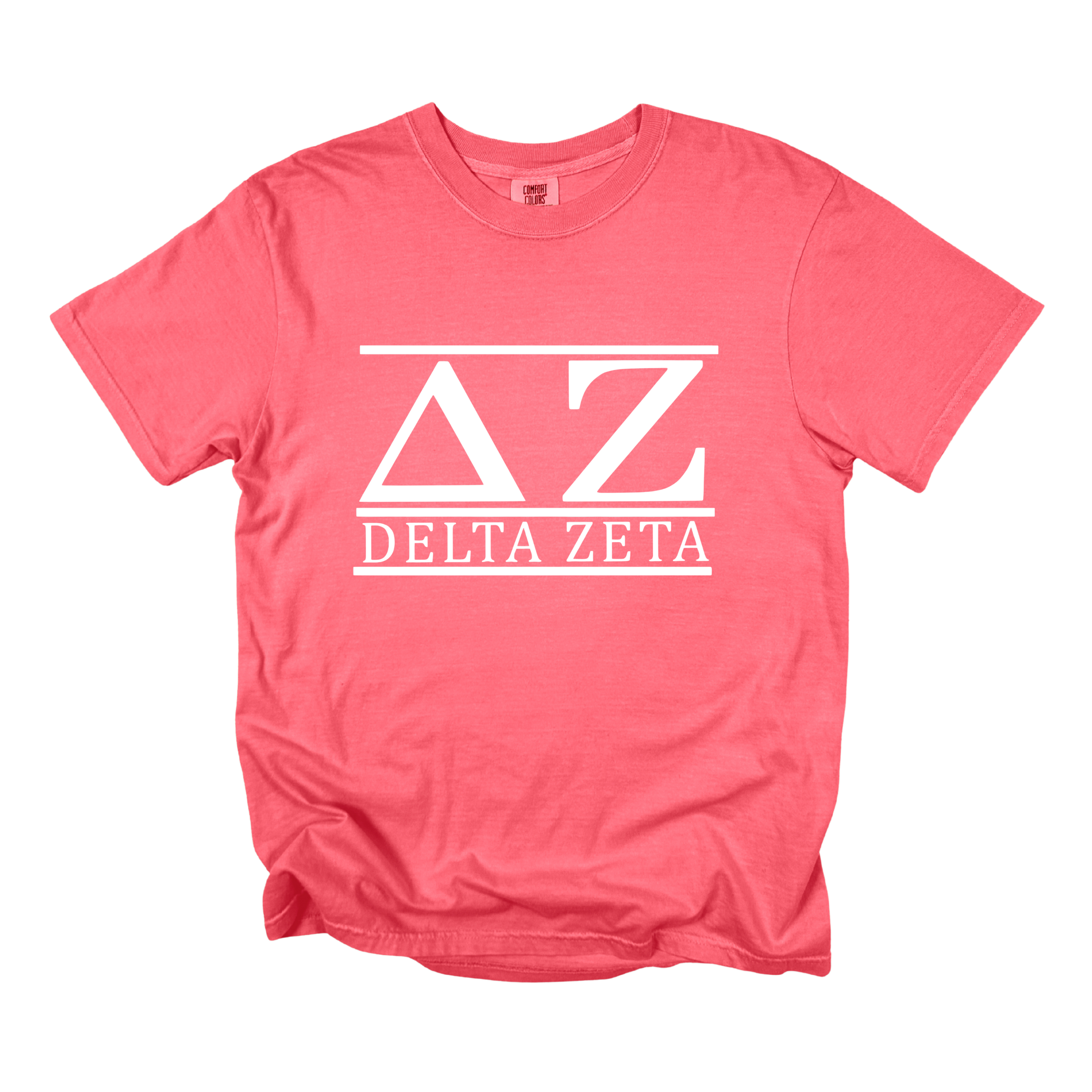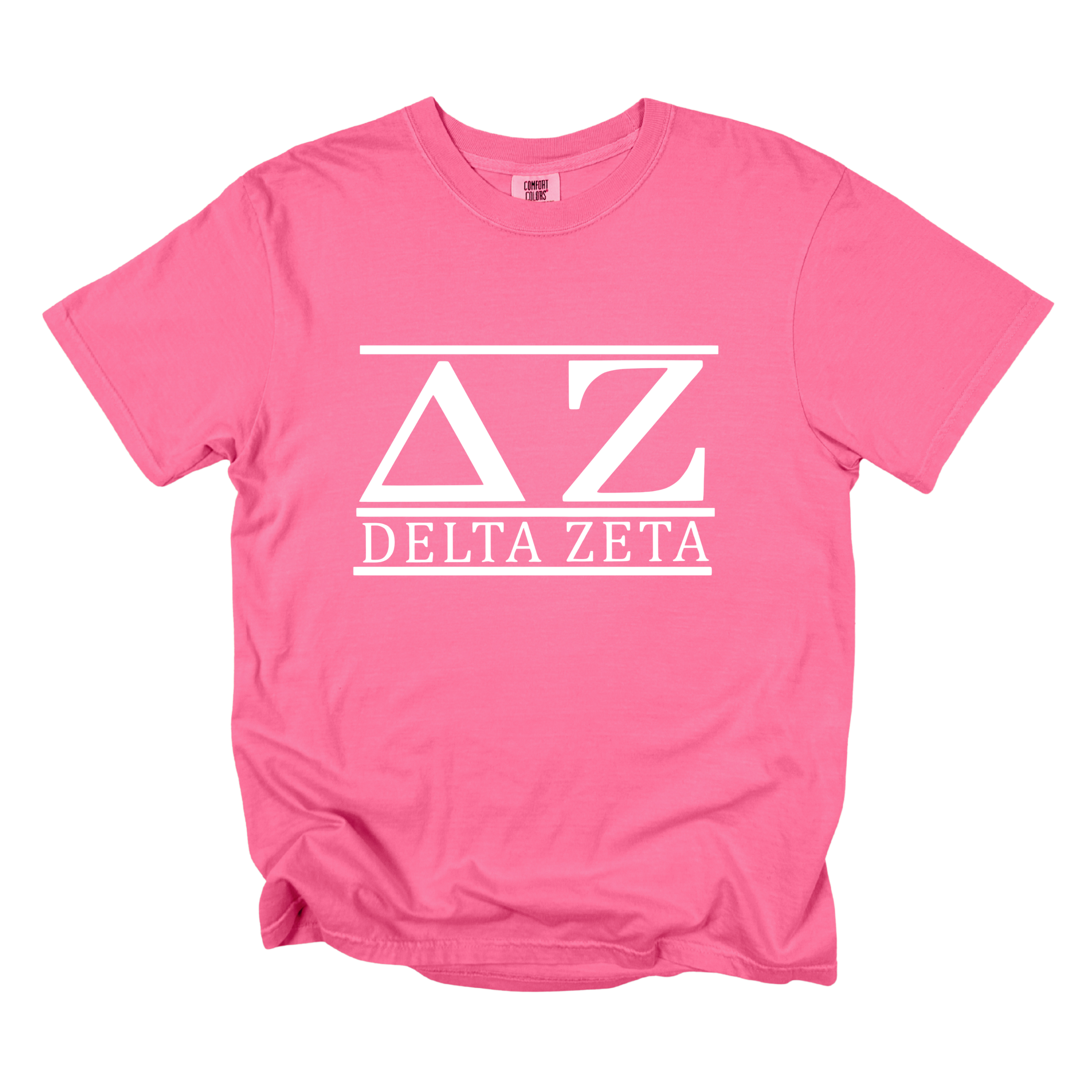 Keep it timeless with our Classic Greek Letters Sorority Tee — a clean, minimalist design that never goes out of style. Featuring bold white Greek letters and matching text framed by simple horizontal lines, this look is both elegant and effortless. Printed on a soft Comfort Colors tee in a vibrant hot pink hue, it’s the perfect balance of sorority pride and everyday wearability.