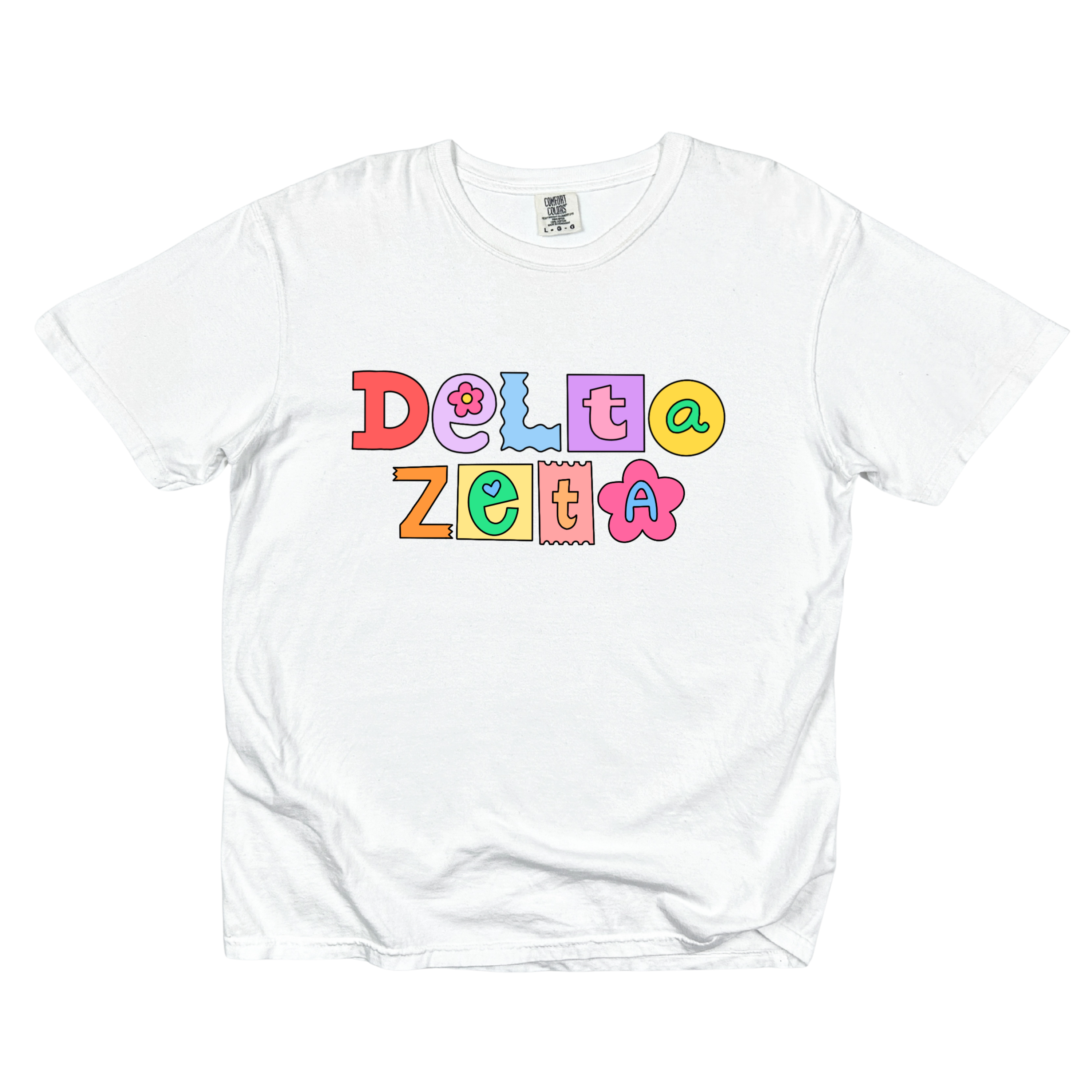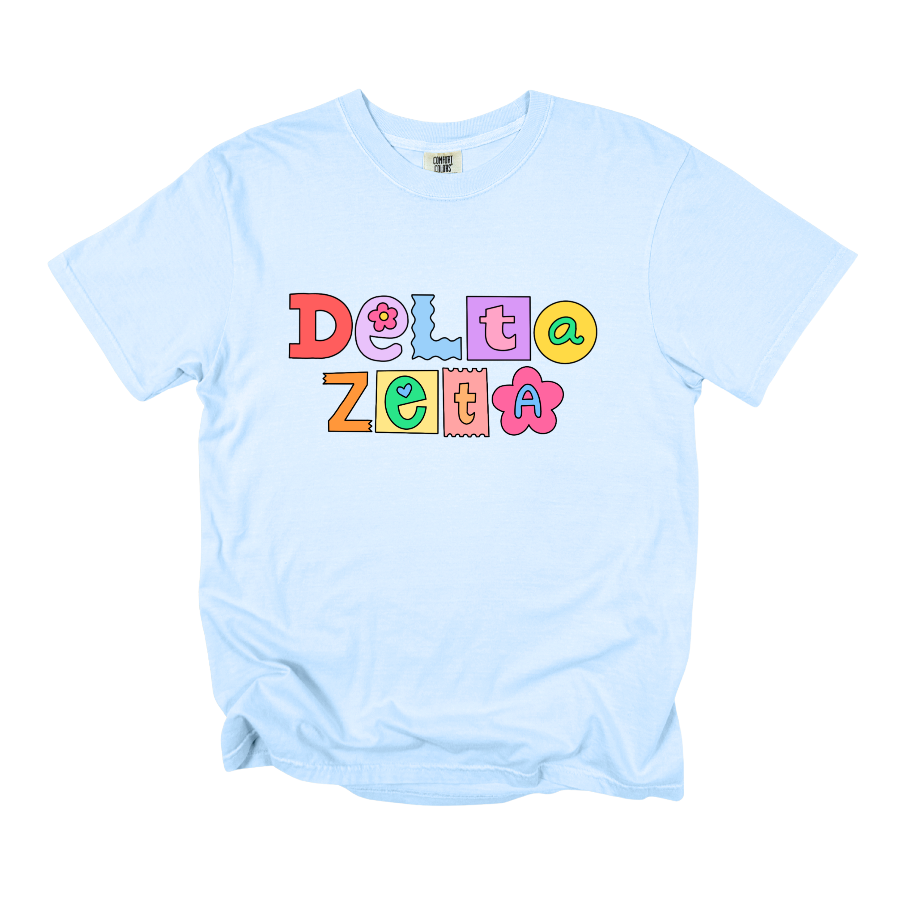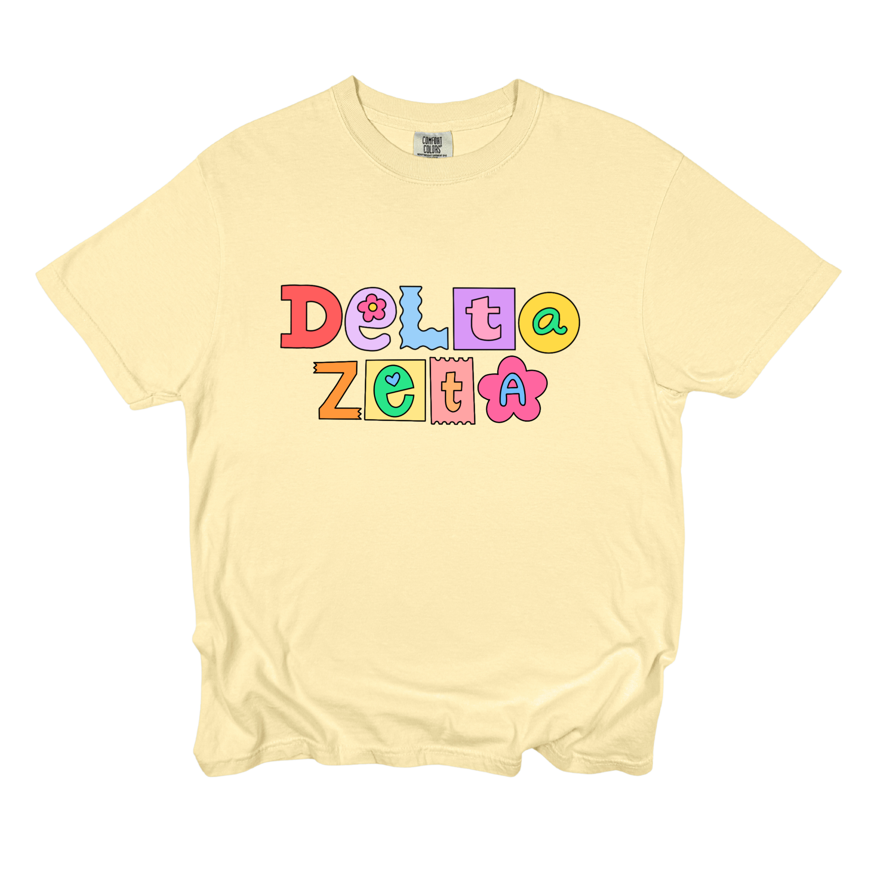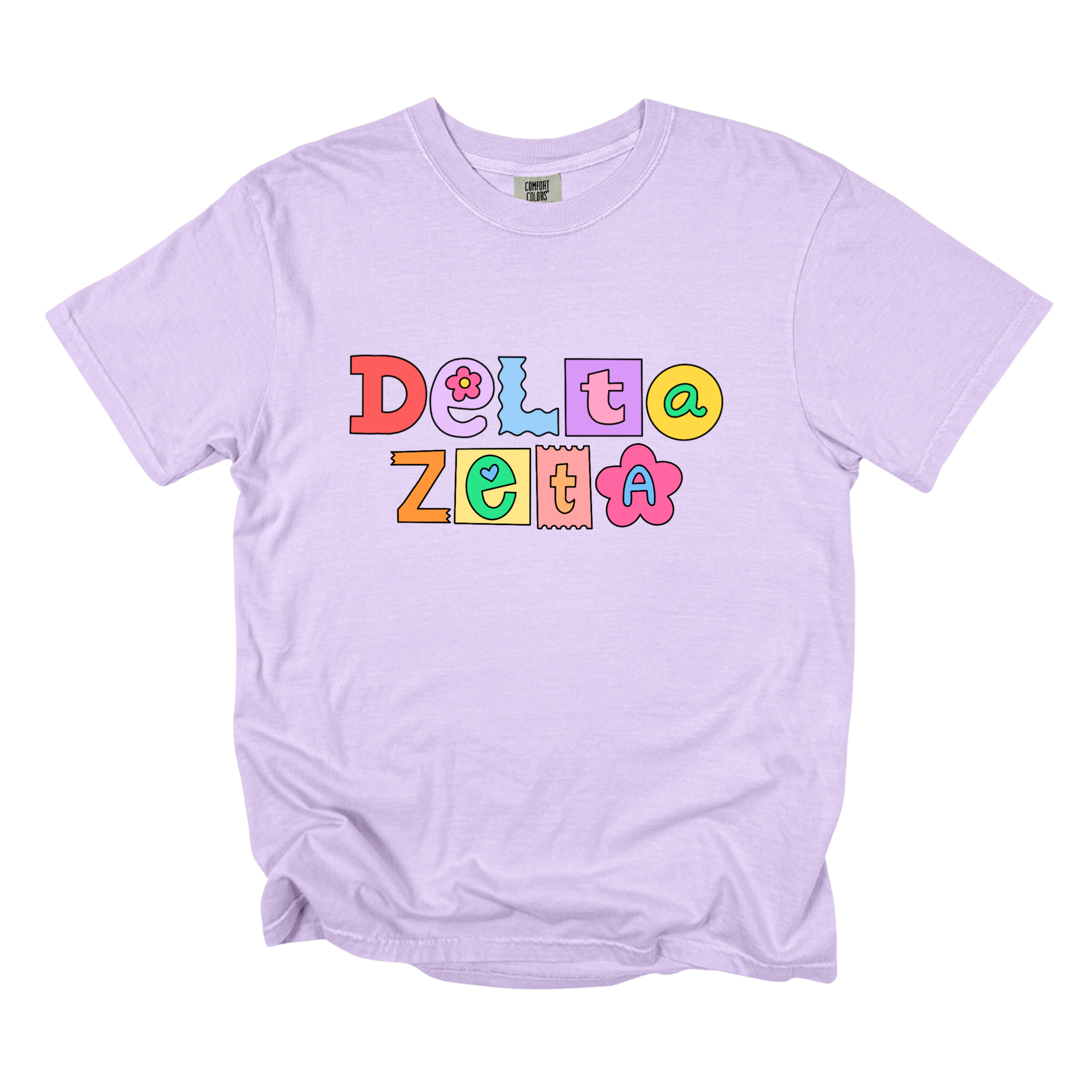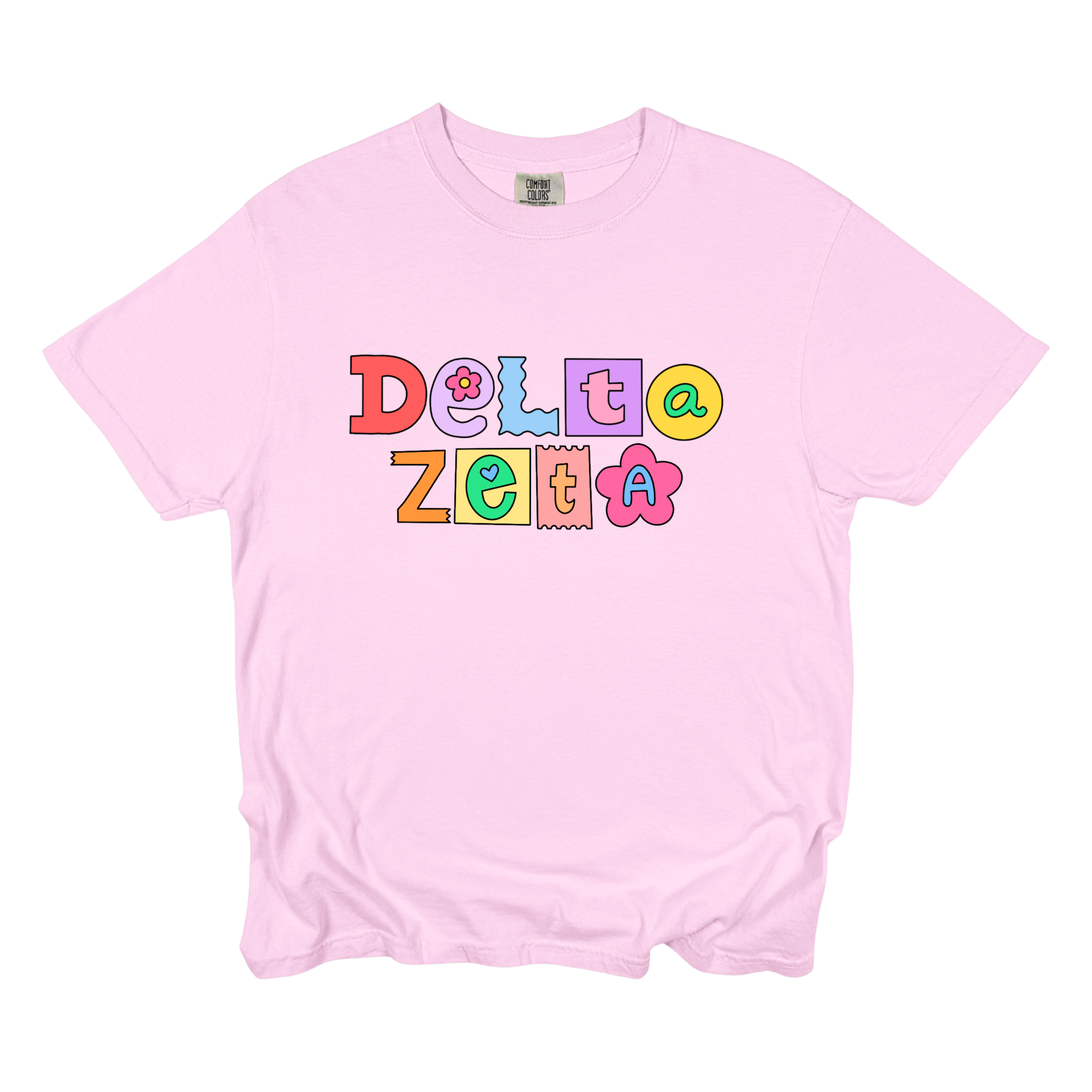 Printed on a soft Comfort Colors tee, this shirt brings together pastel and pop-art colors — lavender, yellow, coral, turquoise, and pink — that look adorable on every background. Available in White, Chambray, Blossom, Butter, and Orchid, it’s the perfect mix of trendy and timeless for any sorority event.