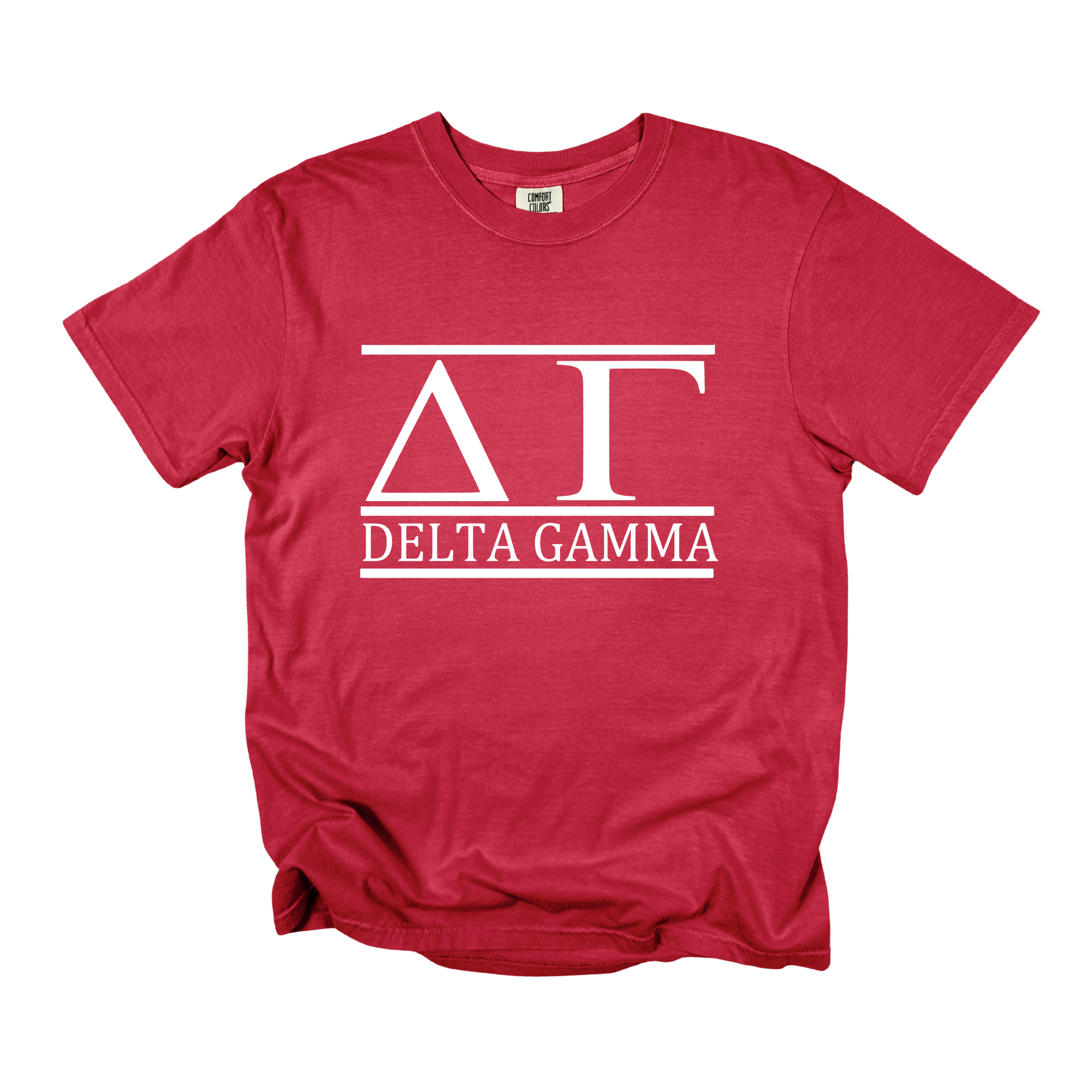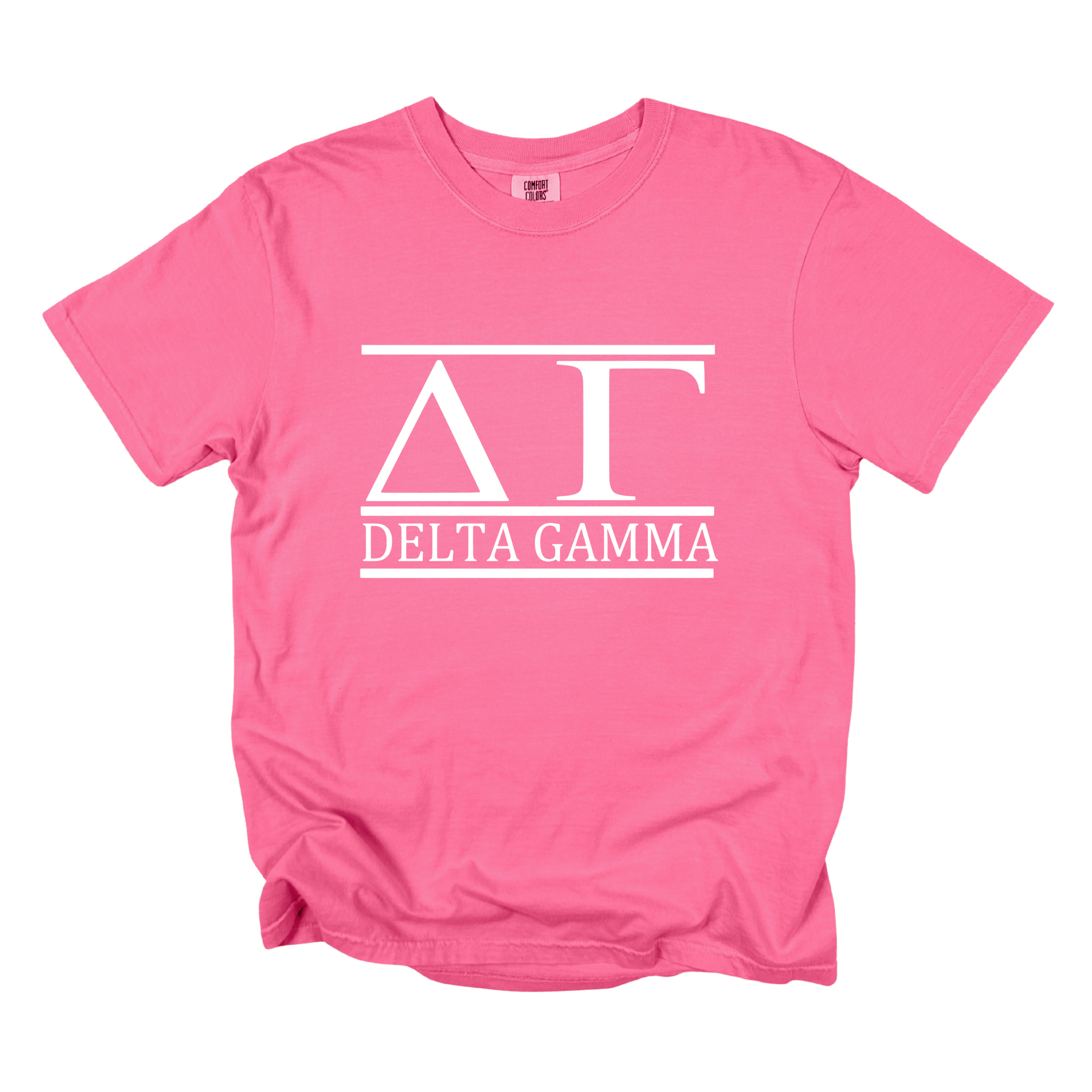 Keep it timeless with our Classic Greek Letters Sorority Tee — a clean, minimalist design that never goes out of style. Featuring bold white Greek letters and matching text framed by simple horizontal lines, this look is both elegant and effortless. Printed on a soft Comfort Colors tee in a vibrant hot pink hue, it’s the perfect balance of sorority pride and everyday wearability.