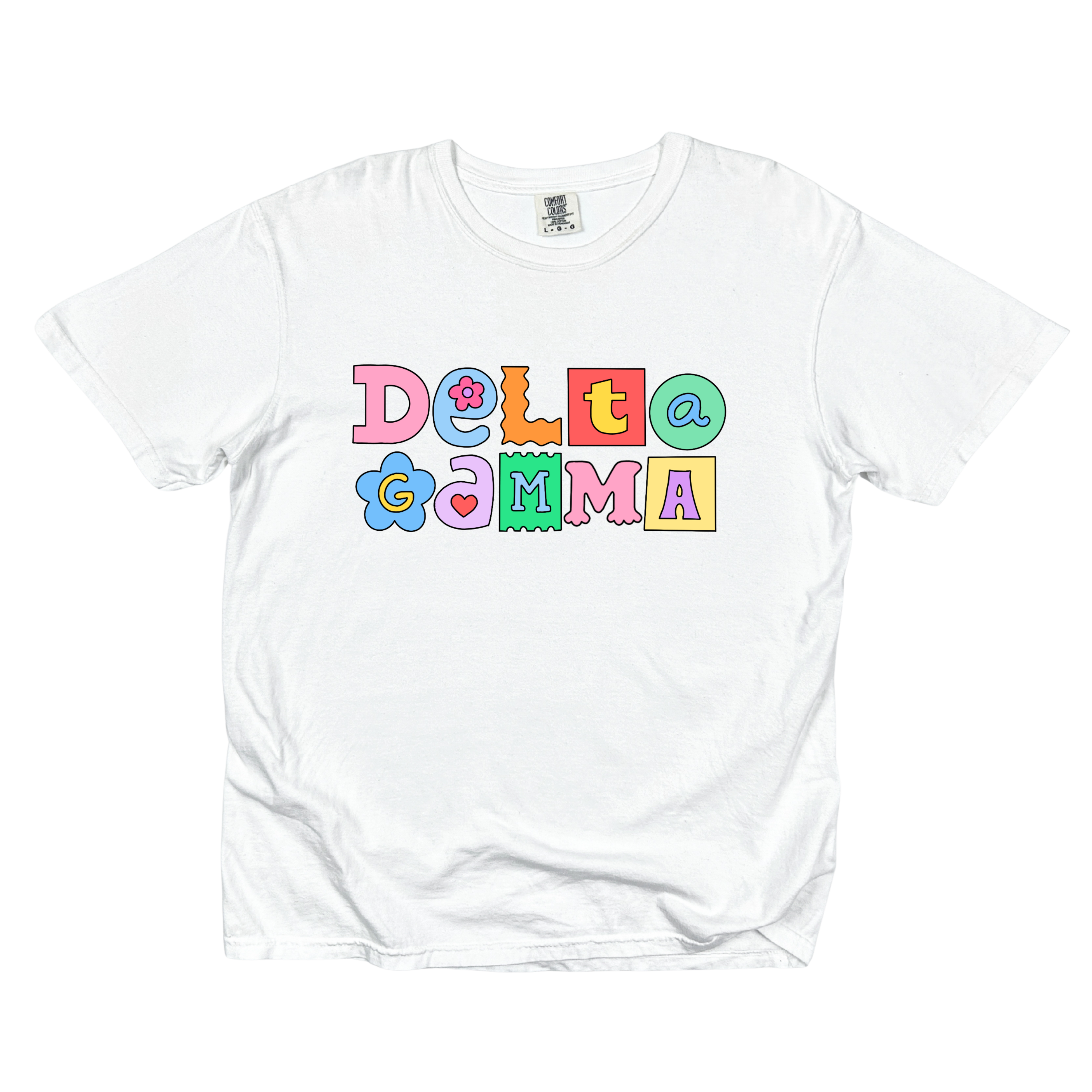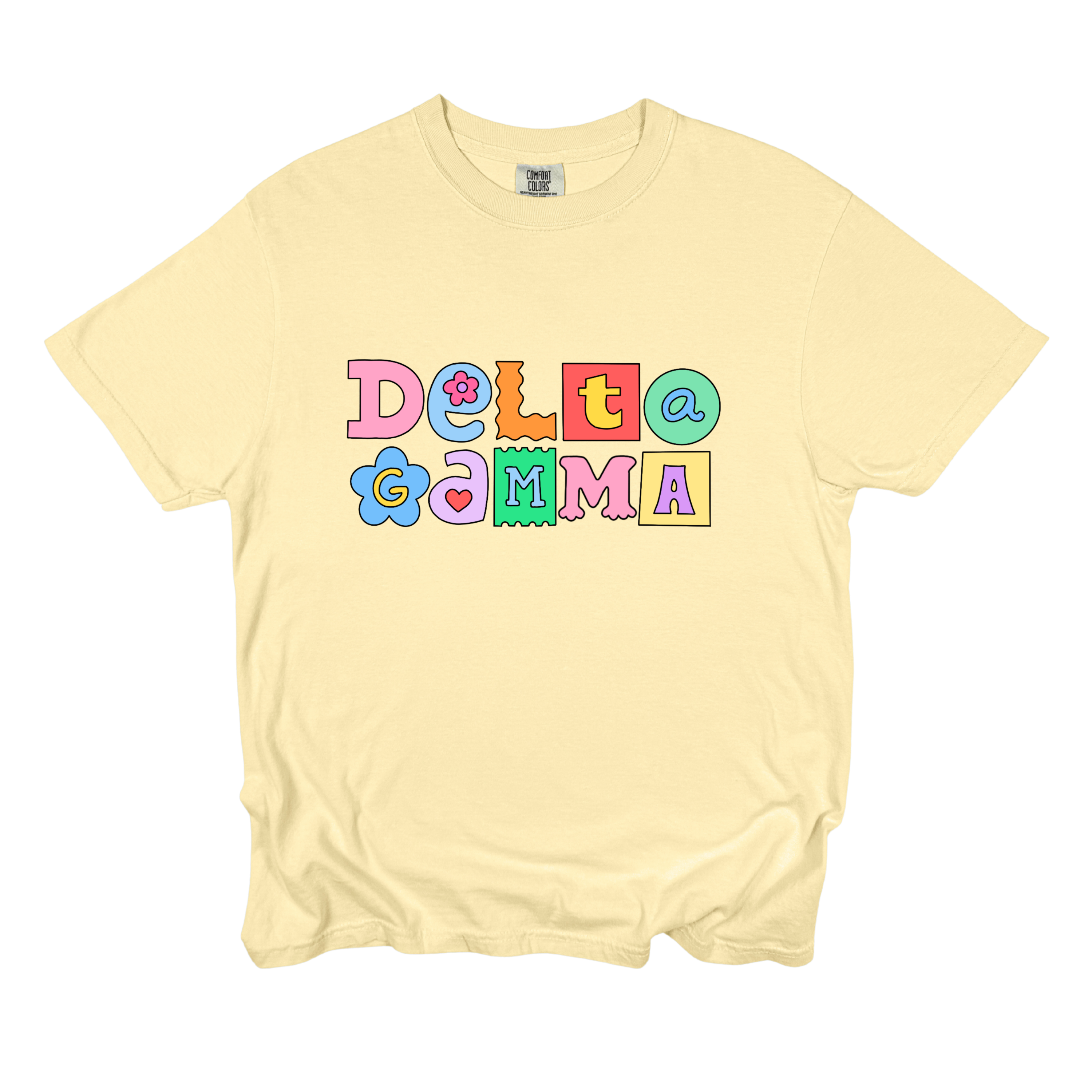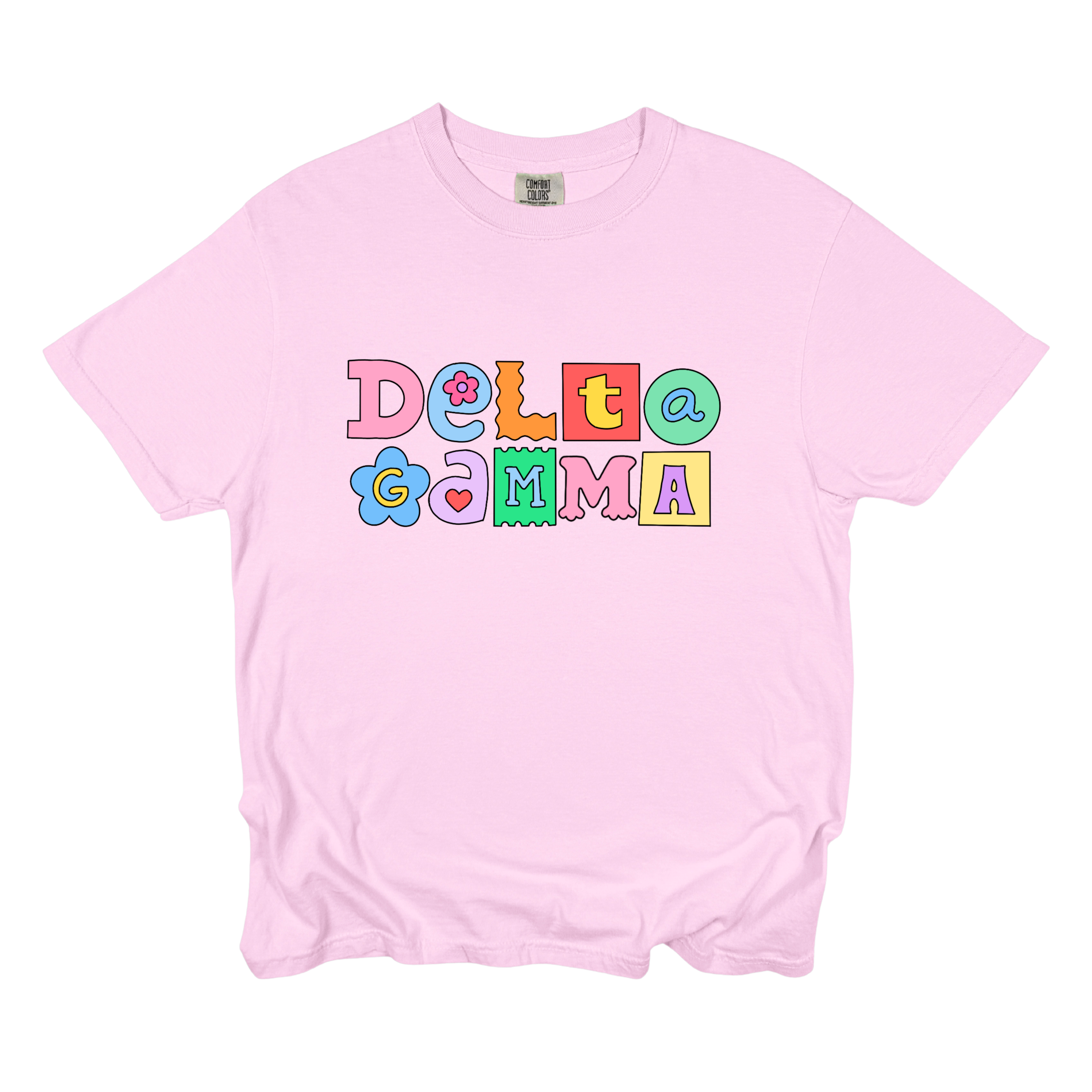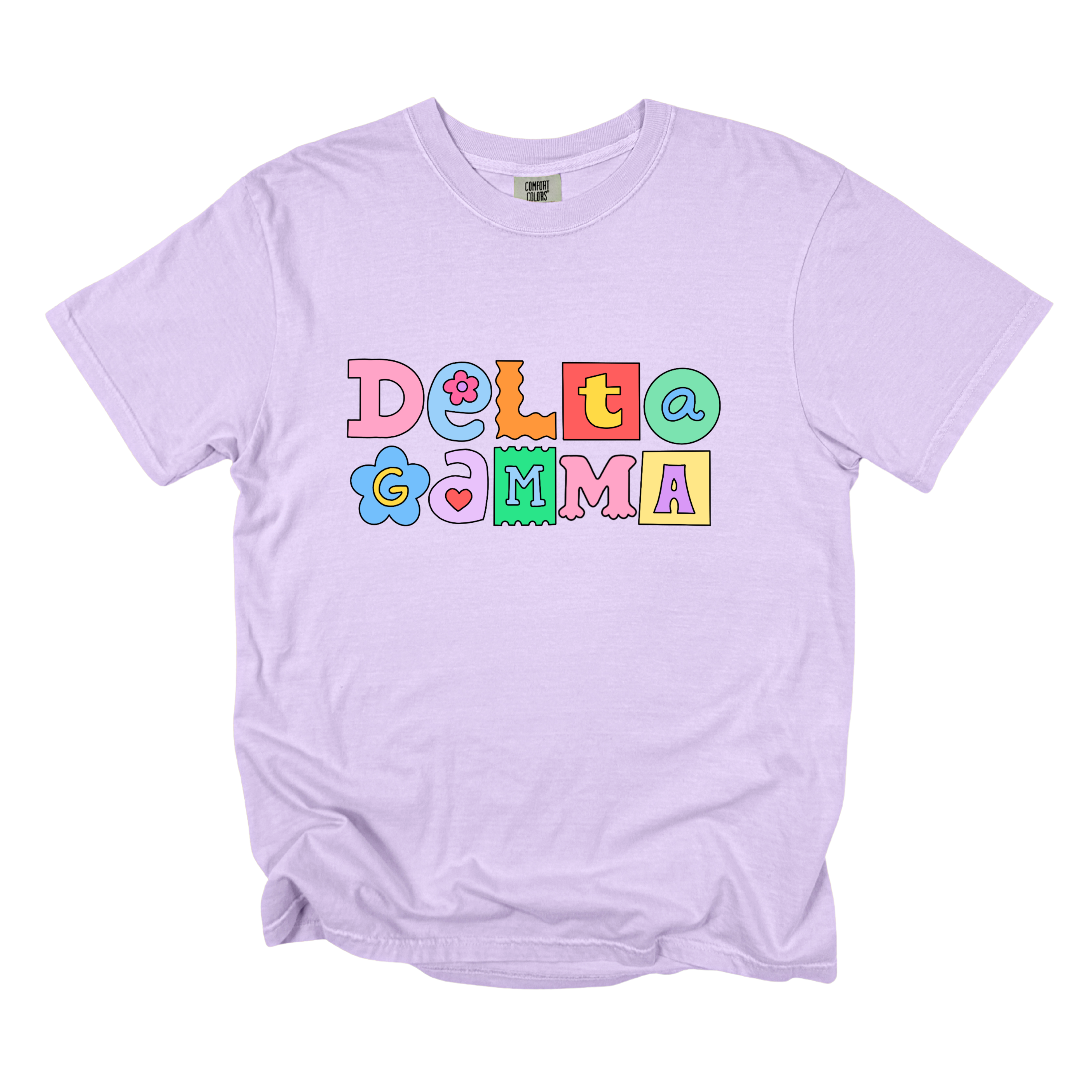 Printed on a soft Comfort Colors tee, this shirt brings together pastel and pop-art colors — lavender, yellow, coral, turquoise, and pink — that look adorable on every background. Available in White, Chambray, Blossom, Butter, and Orchid, it’s the perfect mix of trendy and timeless for any sorority event.