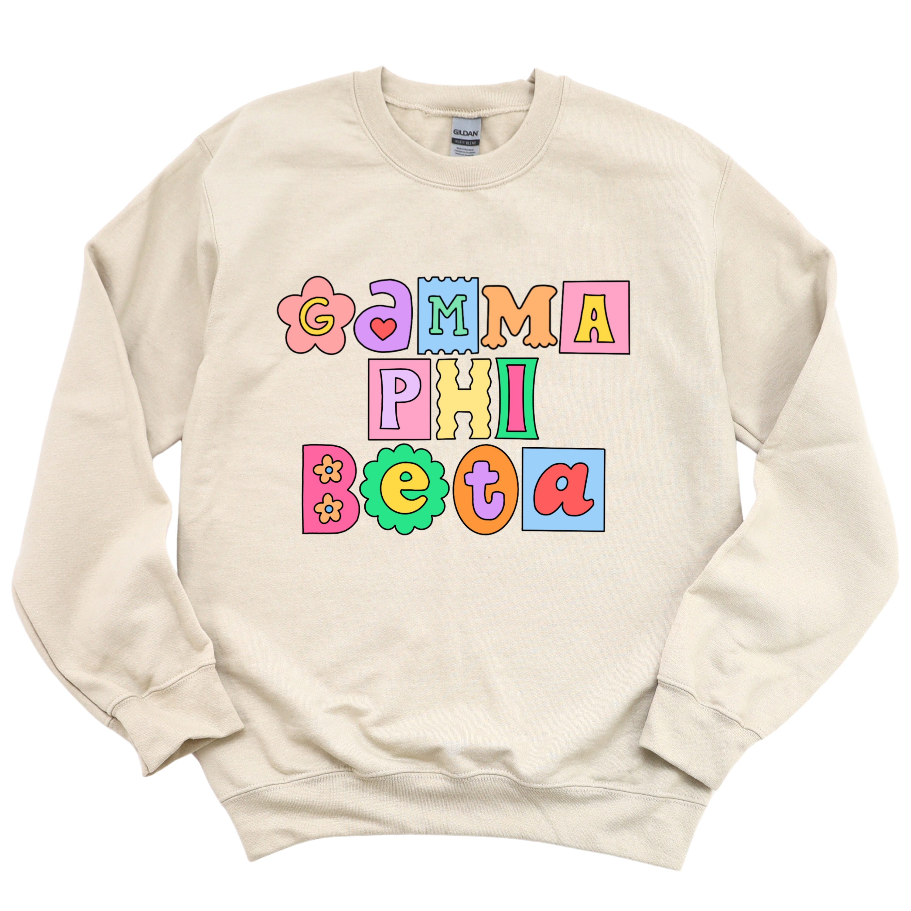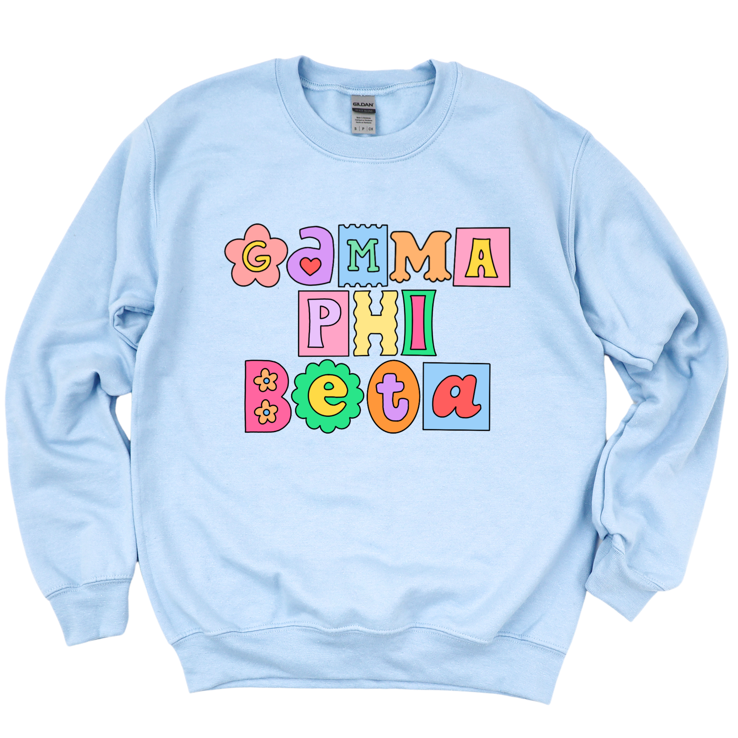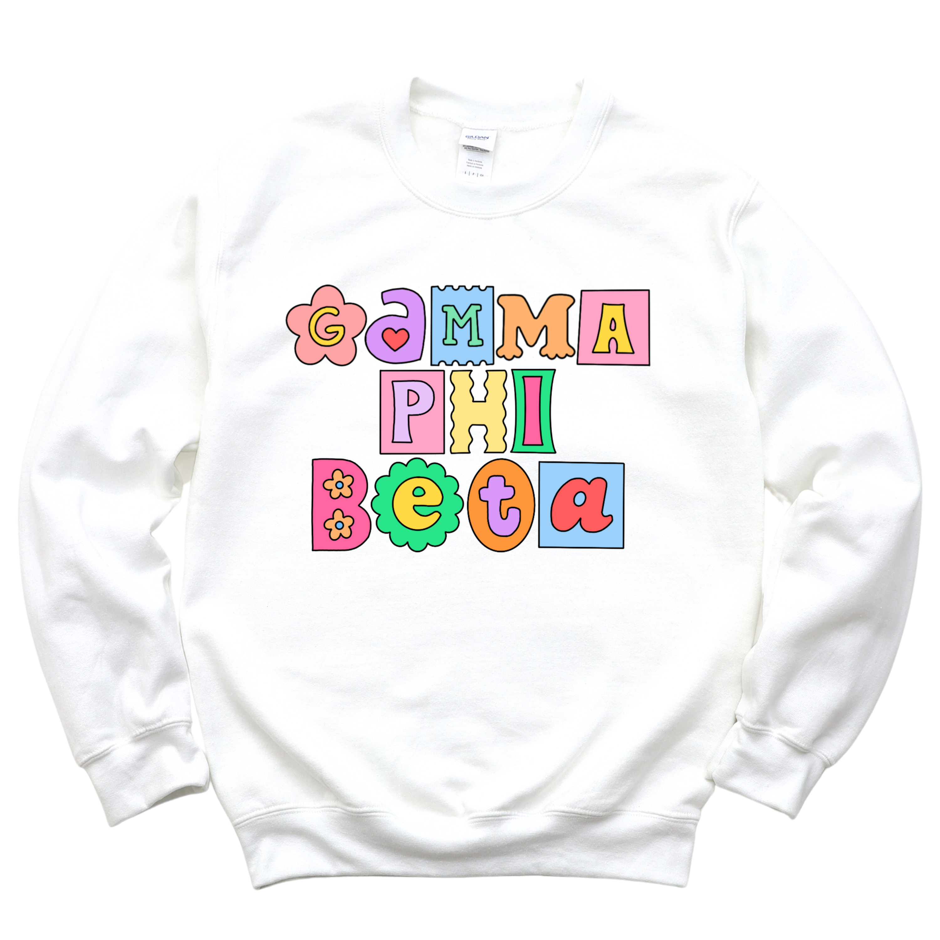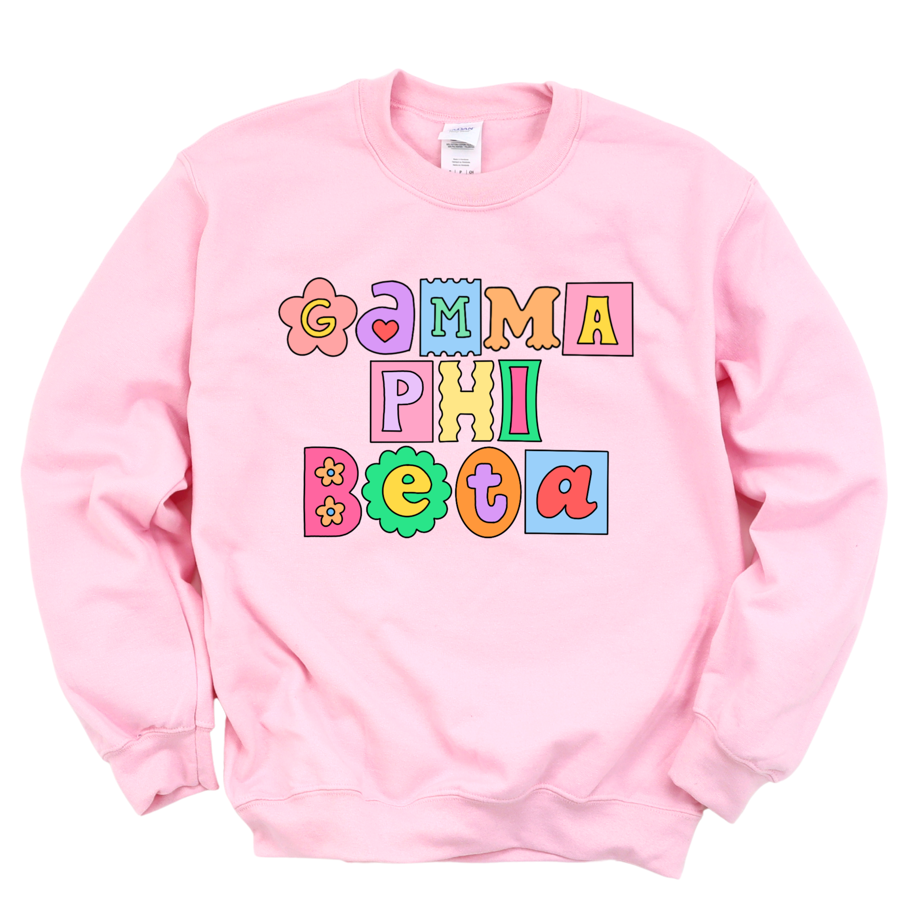 ☆ Bring some color and personality to your wardrobe with this fun block-letter crewneck sweatshirt! Featuring bold letters in vibrant shades, playful shapes, and cheerful accents like hearts and flowers, this cozy sweatshirt is perfect for anyone who loves a bright, uplifting style.