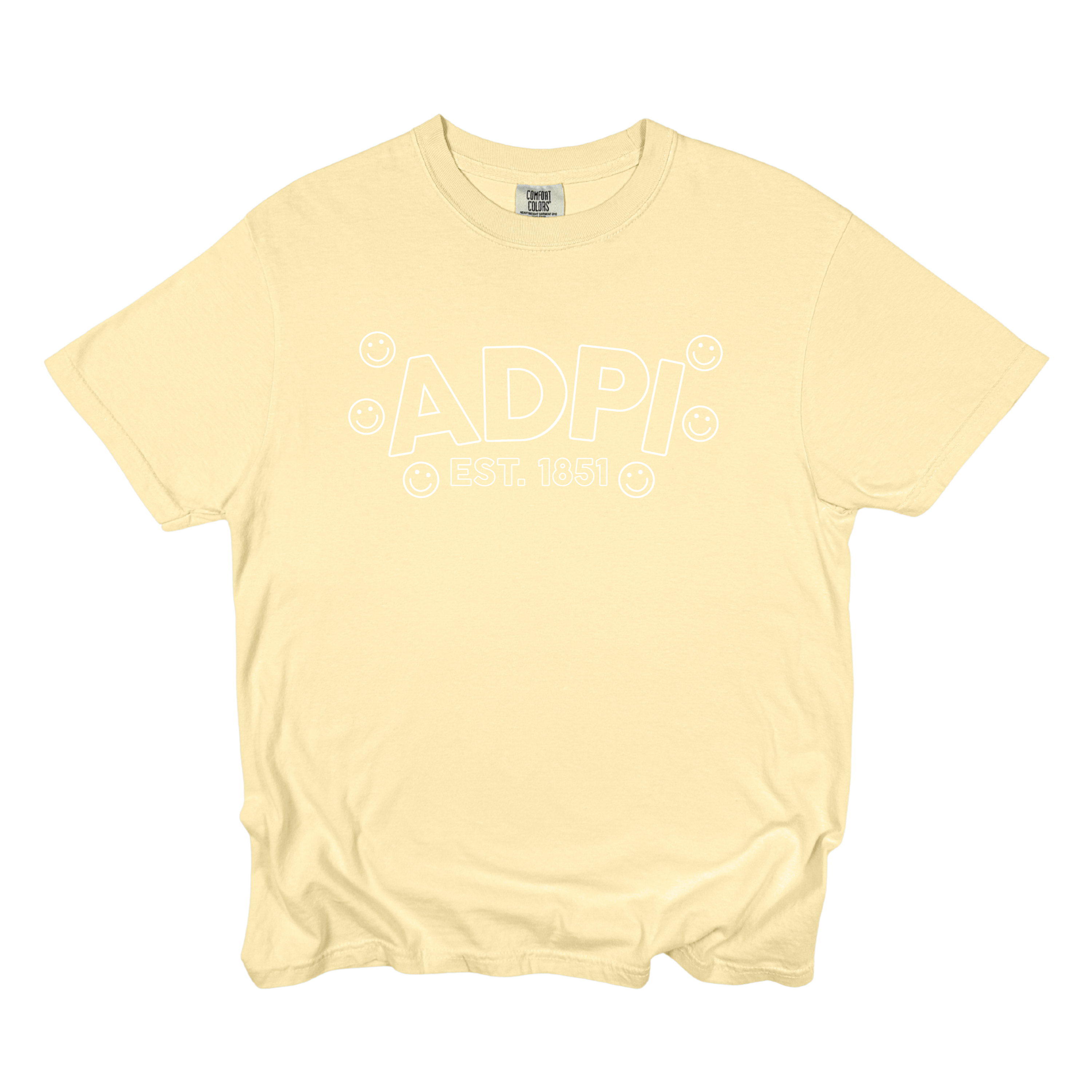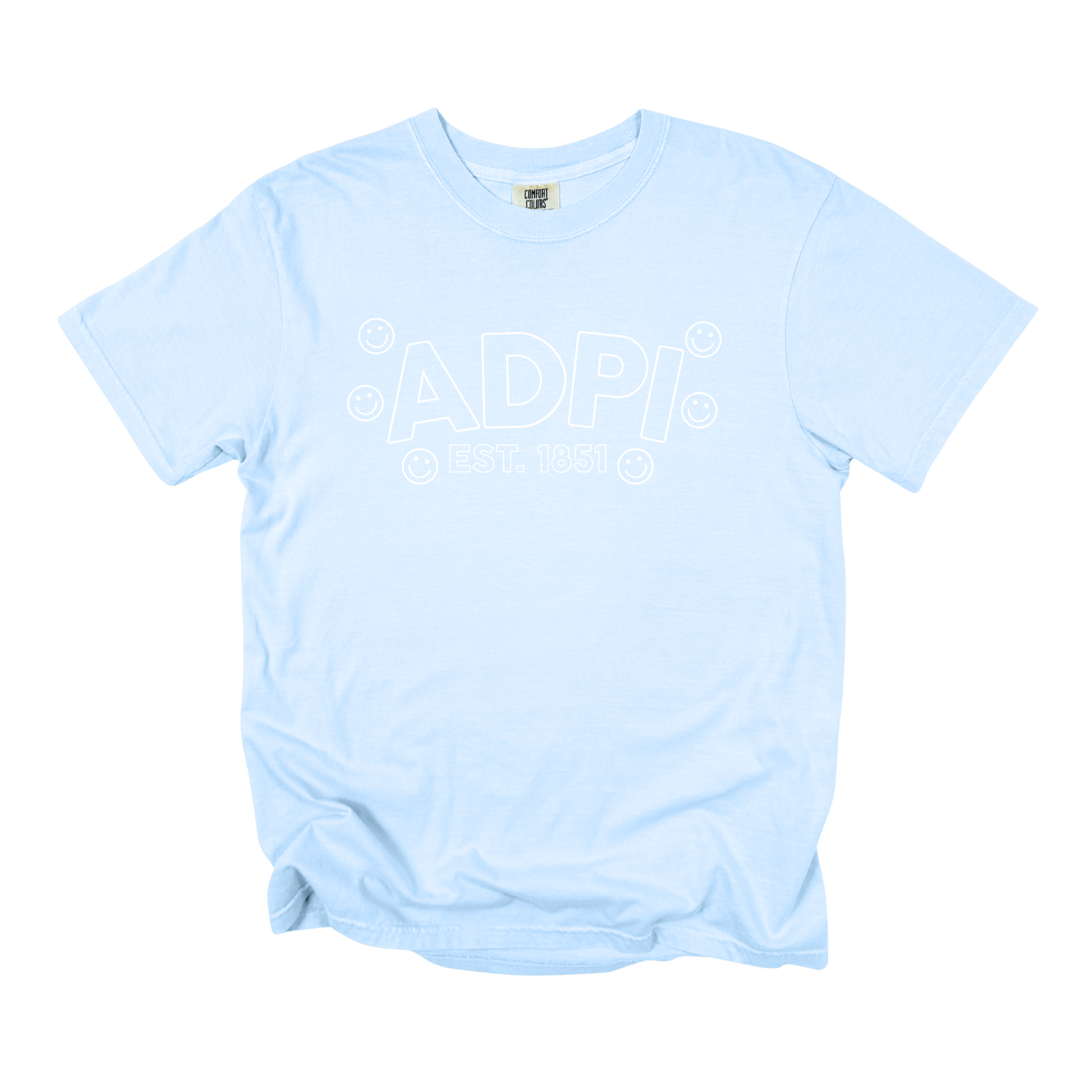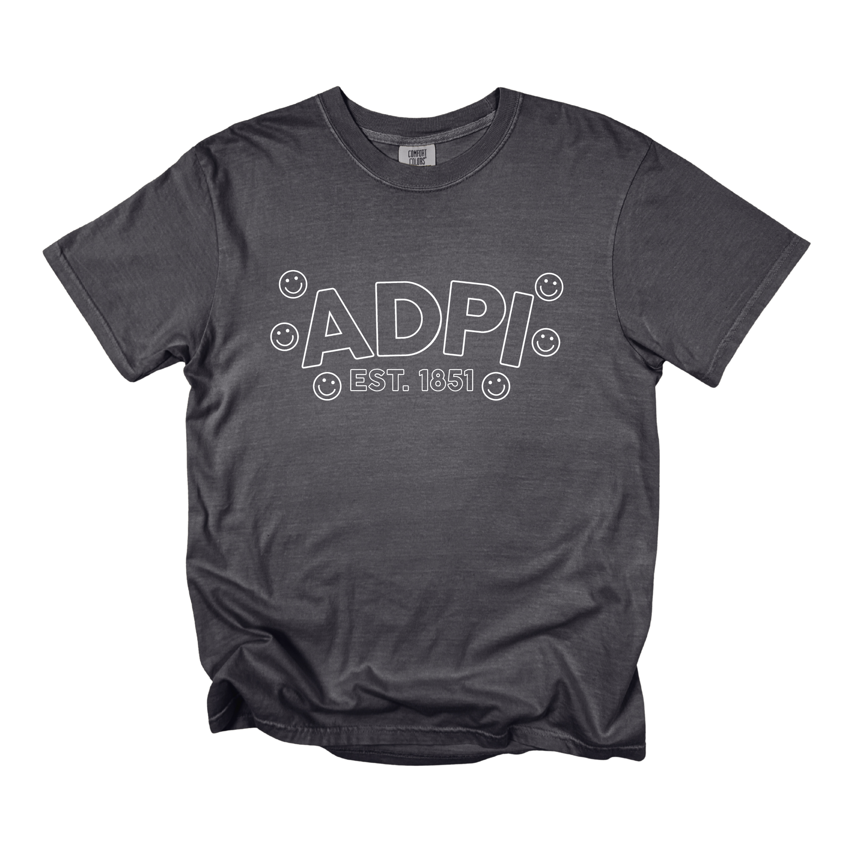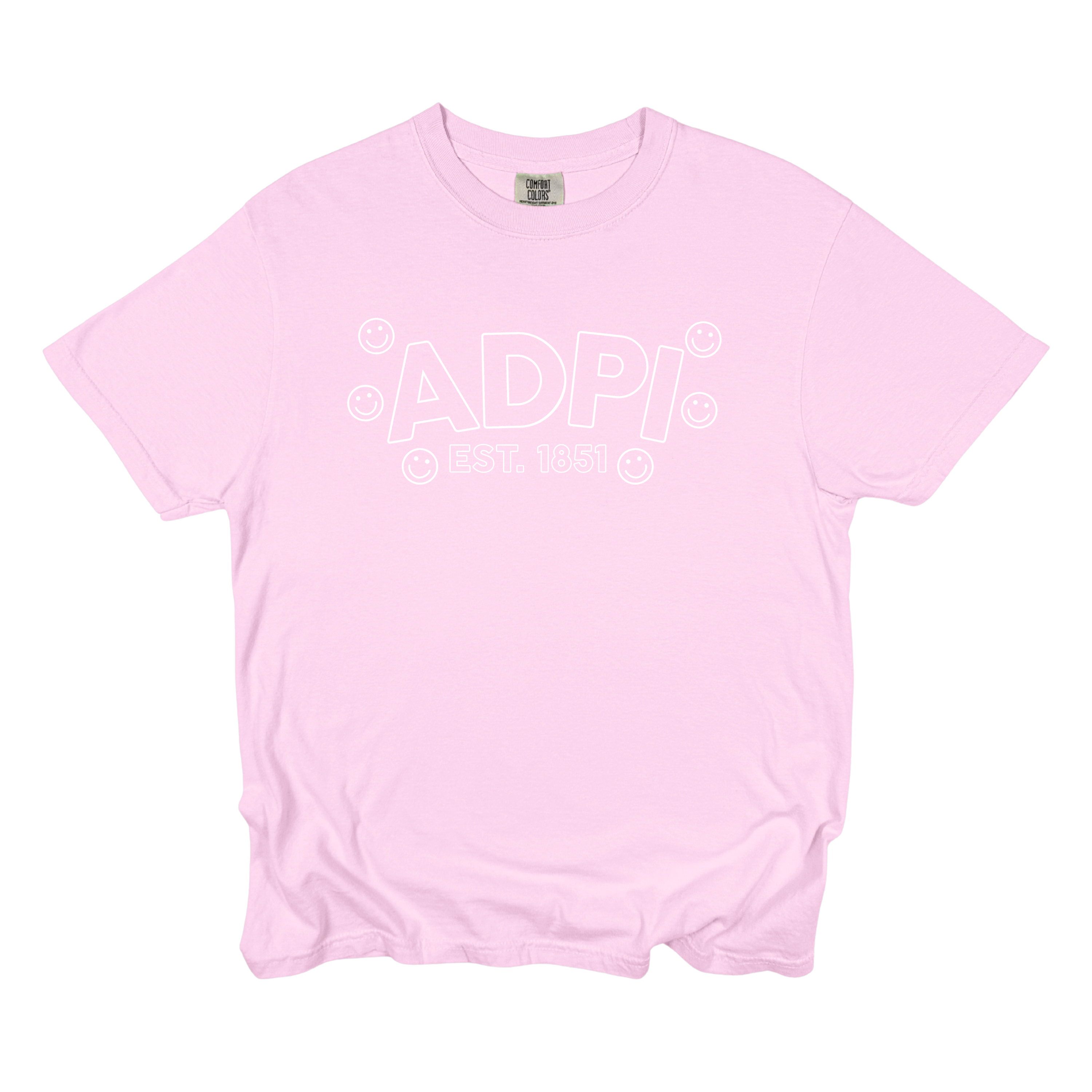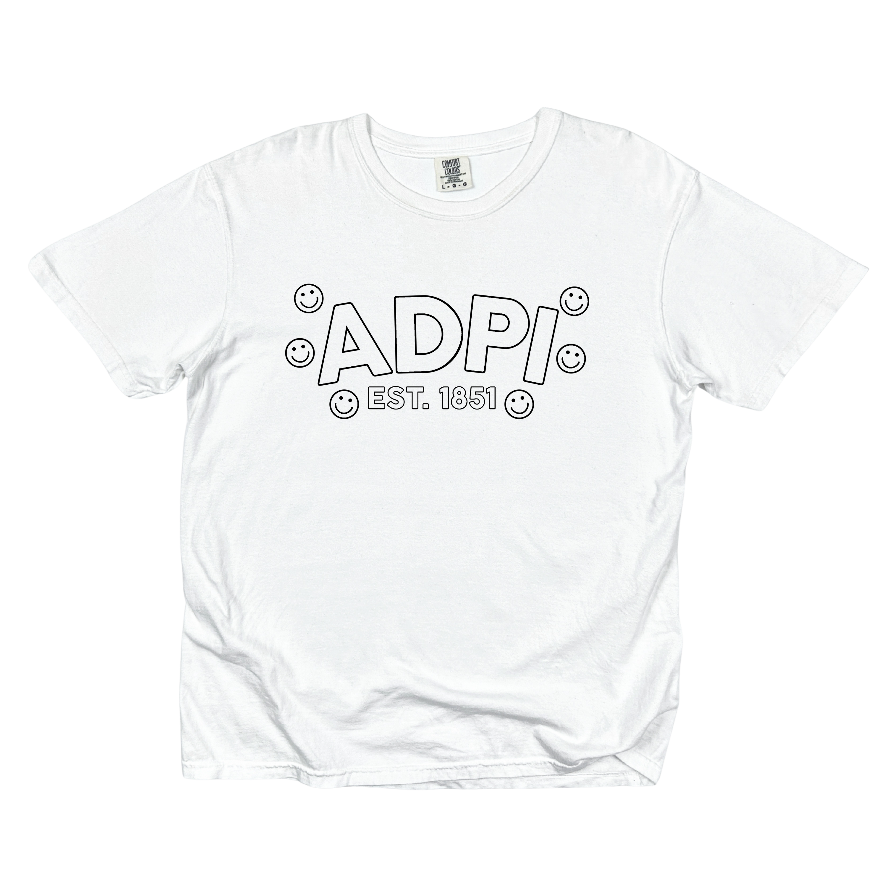 Playful, comfy, and full of sisterhood—the ADPi Bubble Smiley Sorority Tee adds a cheerful twist to a classic Alpha Delta Pi look. Featuring bold bubble-style ADPi lettering, surrounded by smiley accents and finished with Est. 1851, this tee perfectly blends tradition with fun, feel-good style.