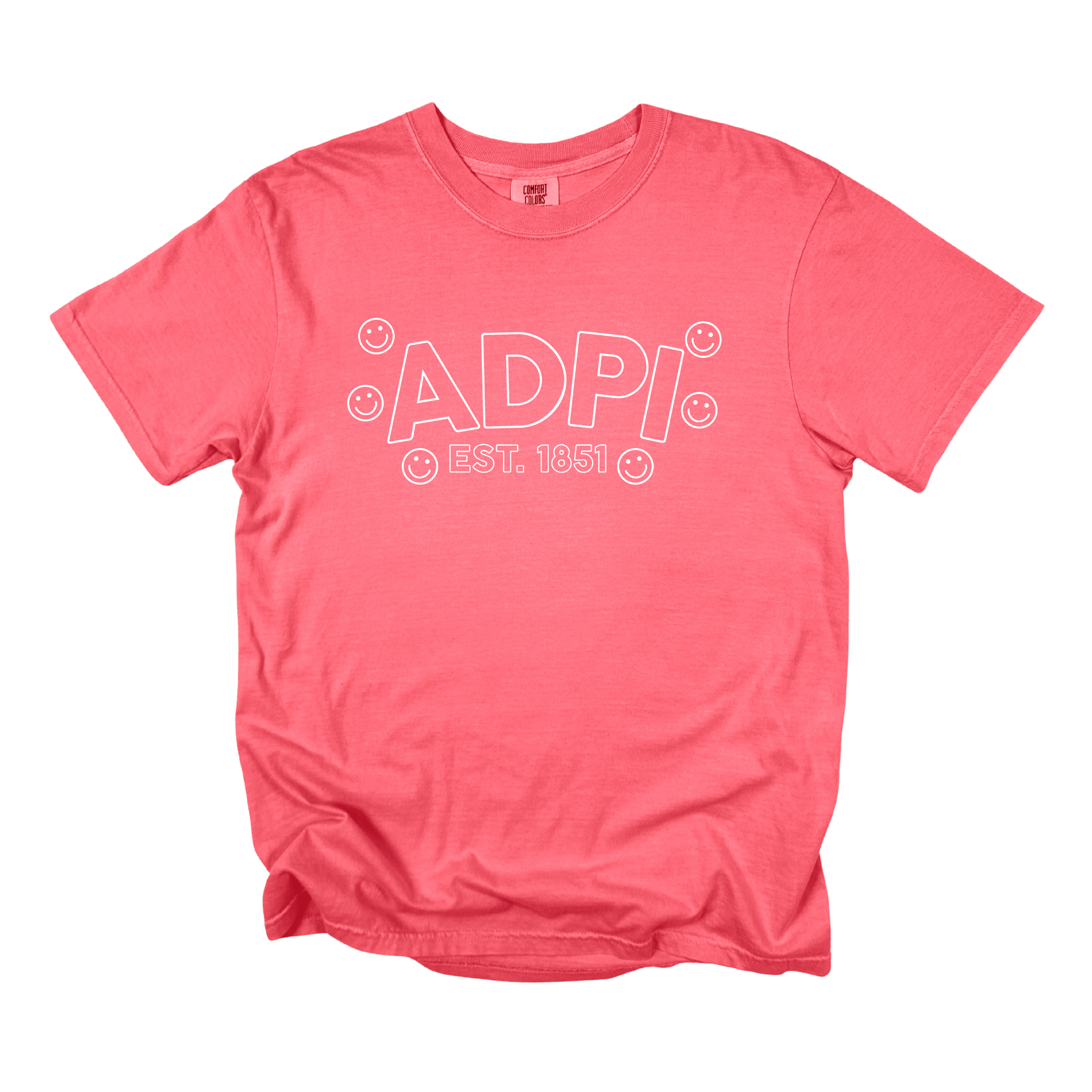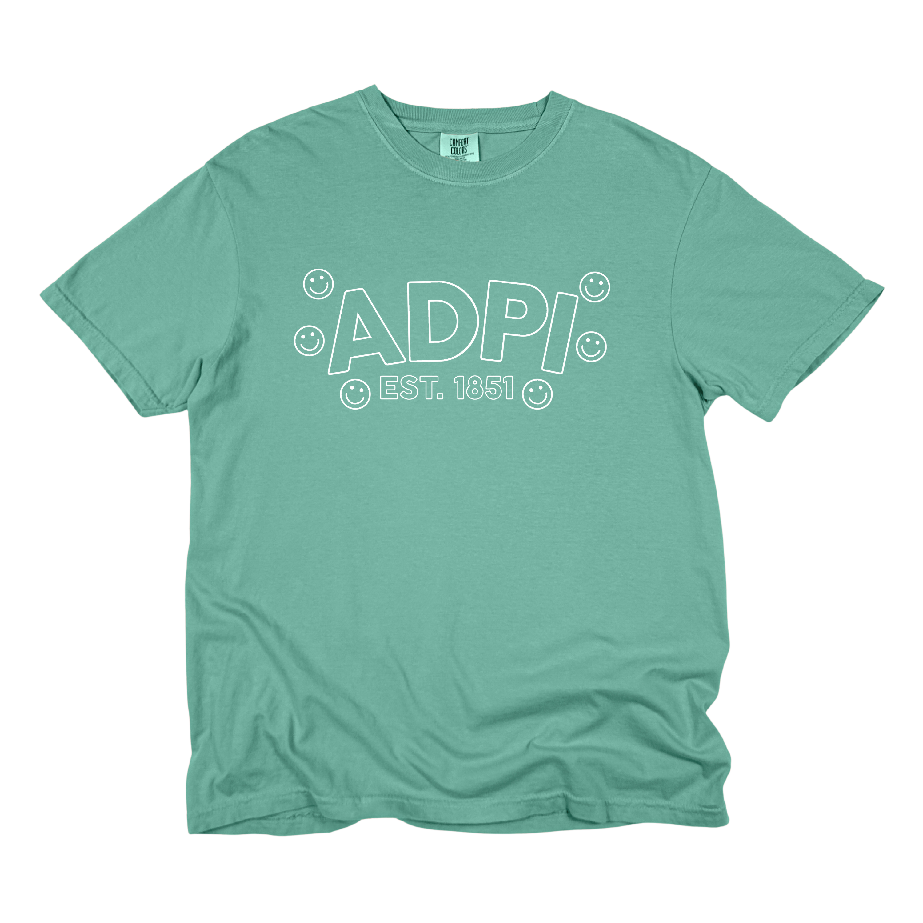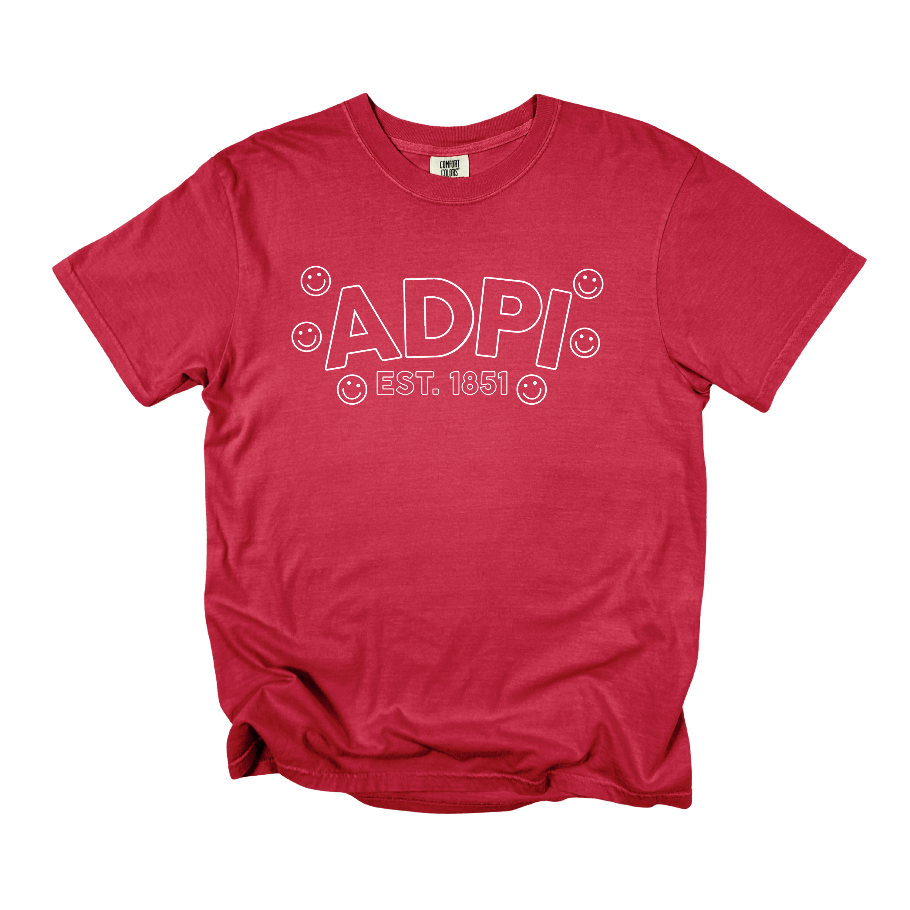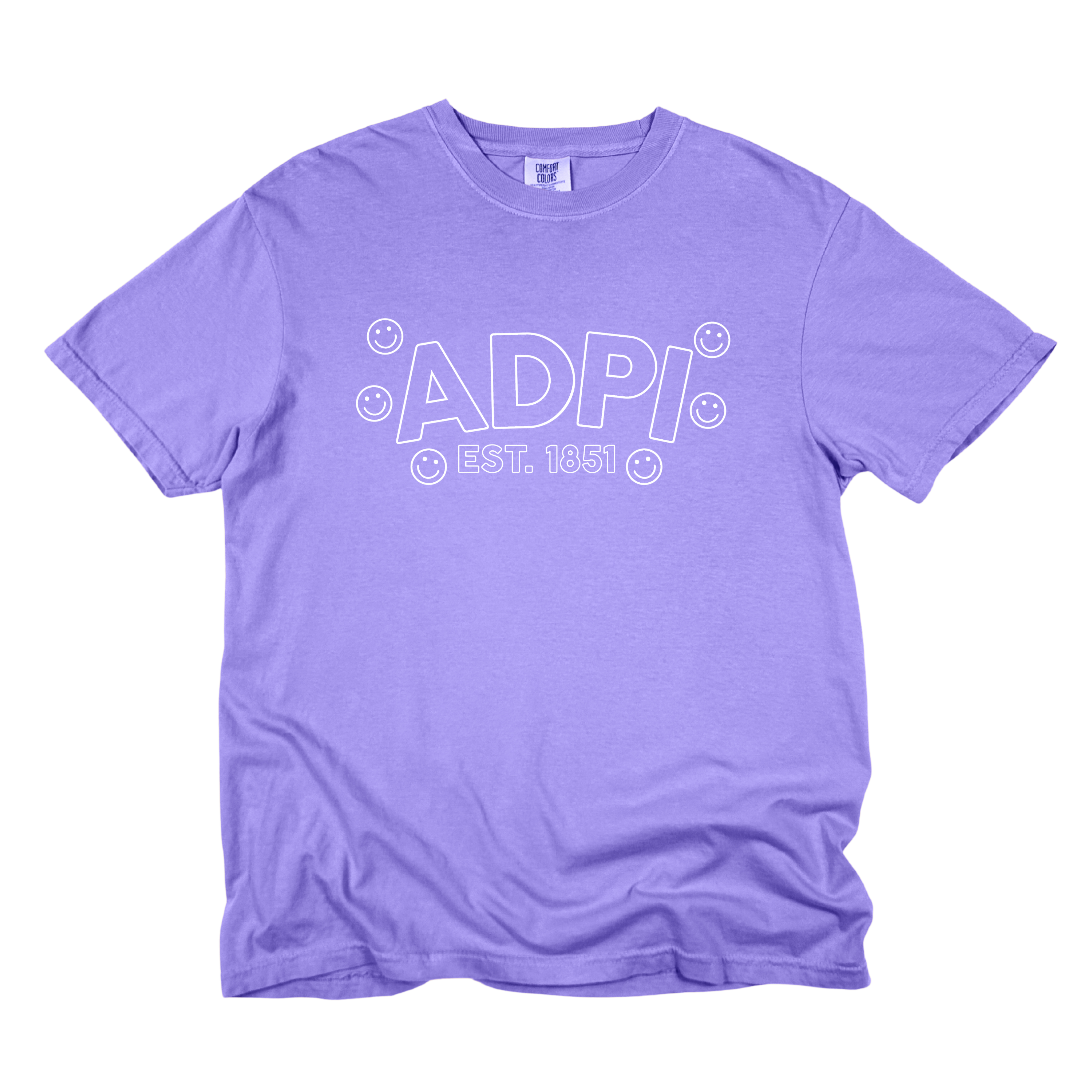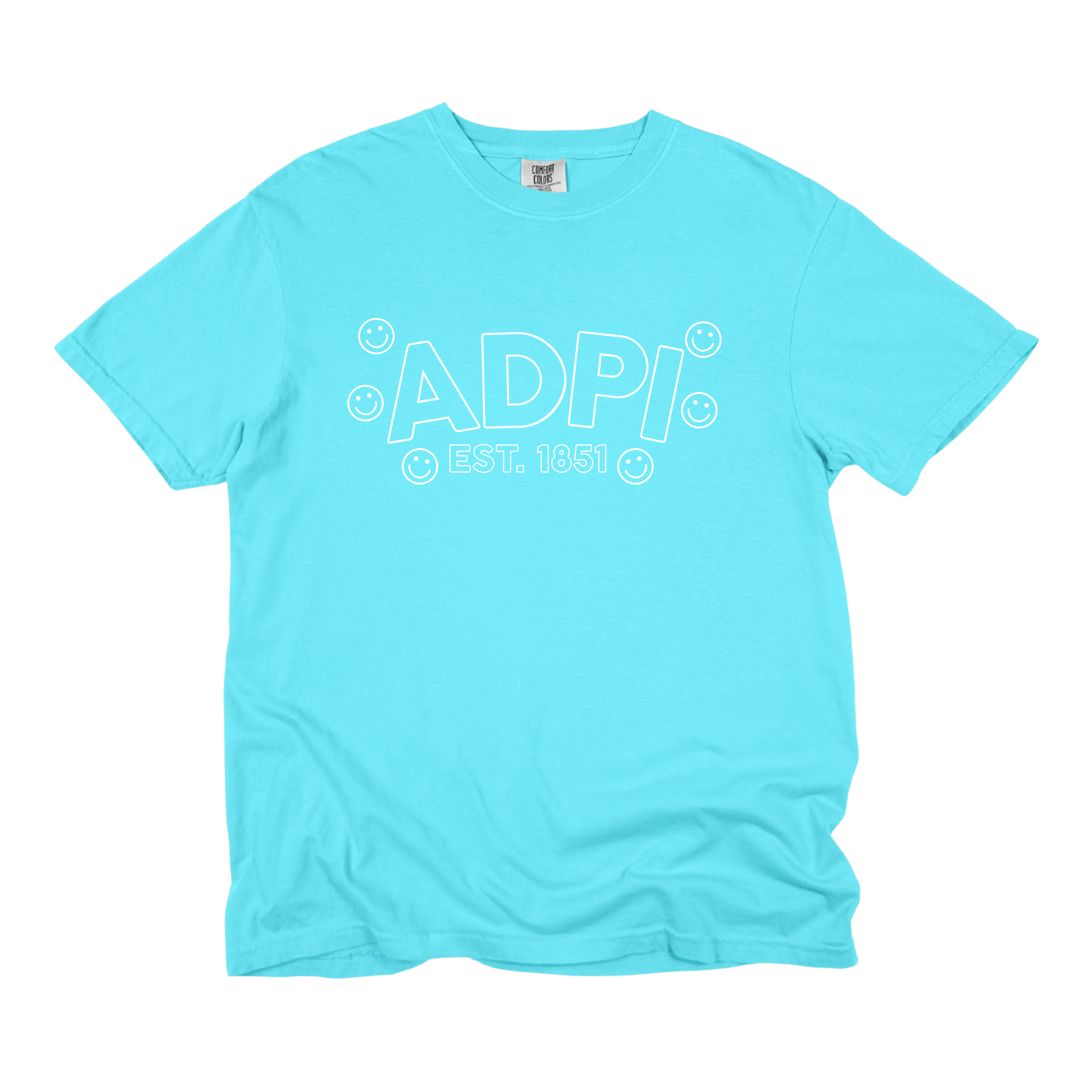 Playful, comfy, and full of sisterhood—the ADPi Bubble Smiley Sorority Tee adds a cheerful twist to a classic Alpha Delta Pi look. Featuring bold bubble-style ADPi lettering, surrounded by smiley accents and finished with Est. 1851, this tee perfectly blends tradition with fun, feel-good style.