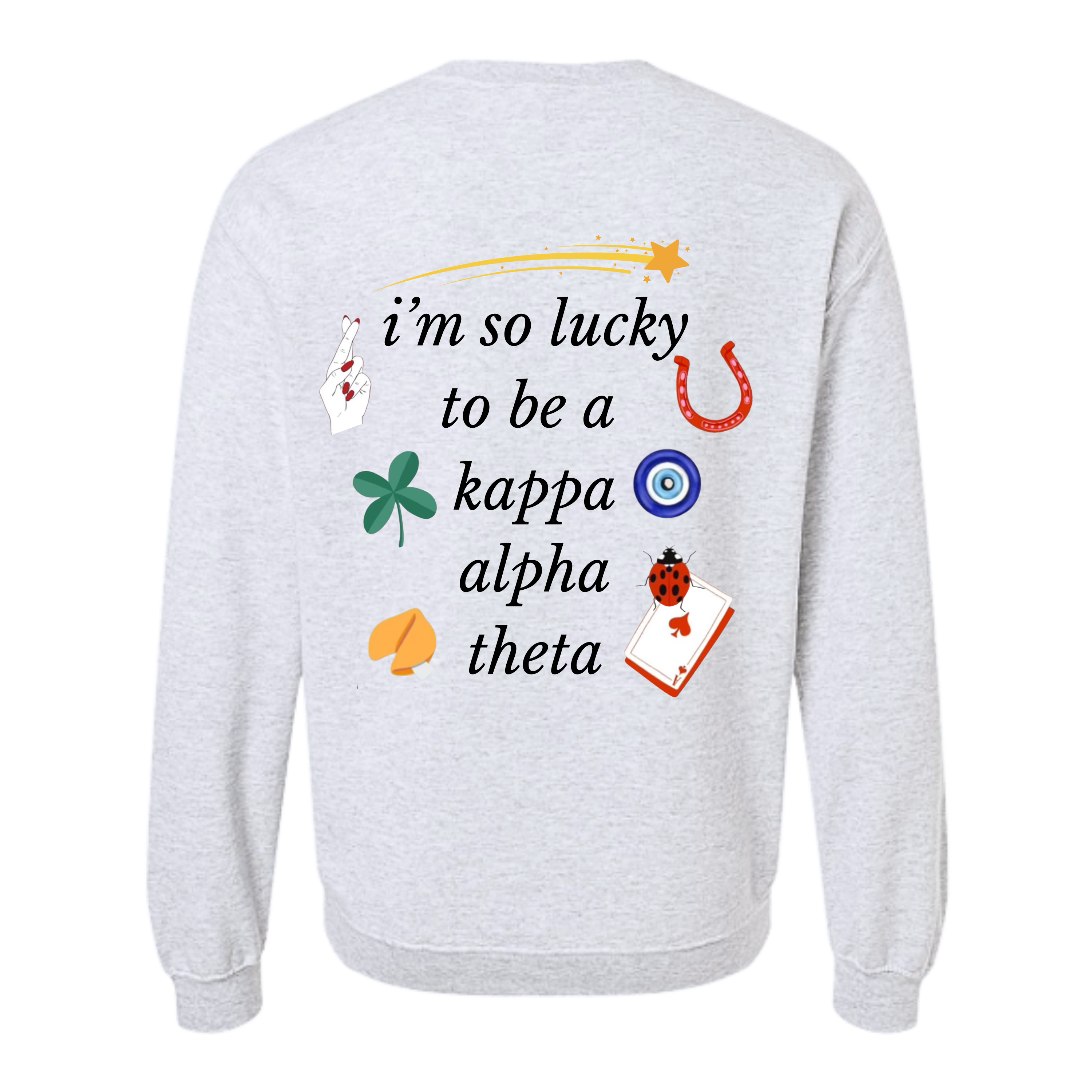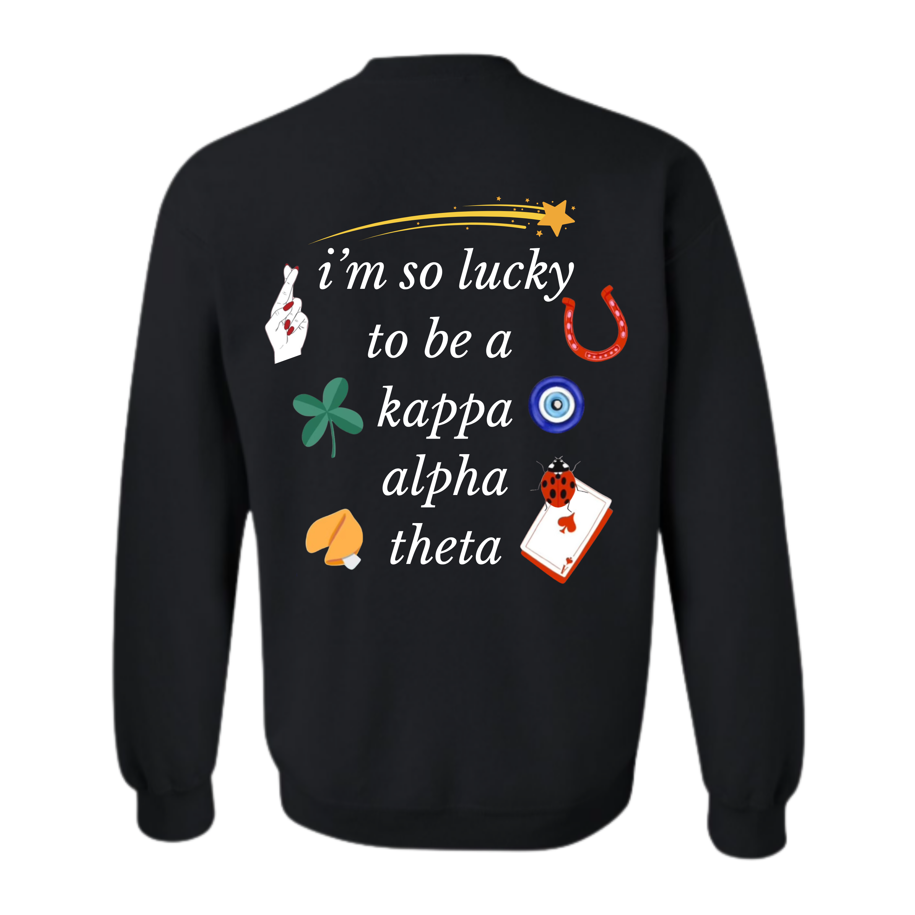 ☆ Step into your lucky girl era with the cutest, charm-inspired sorority crewneck of the season! This cozy, soft crewneck features a whimsical mix of lucky symbols — shooting stars, horseshoes, clovers, evil eye, ladybug, aces, charms, and more — all wrapped around the phrase “I’m so lucky to be a [Your Sorority]”. It’s sweet, sentimental, and instantly aesthetic for every sister.