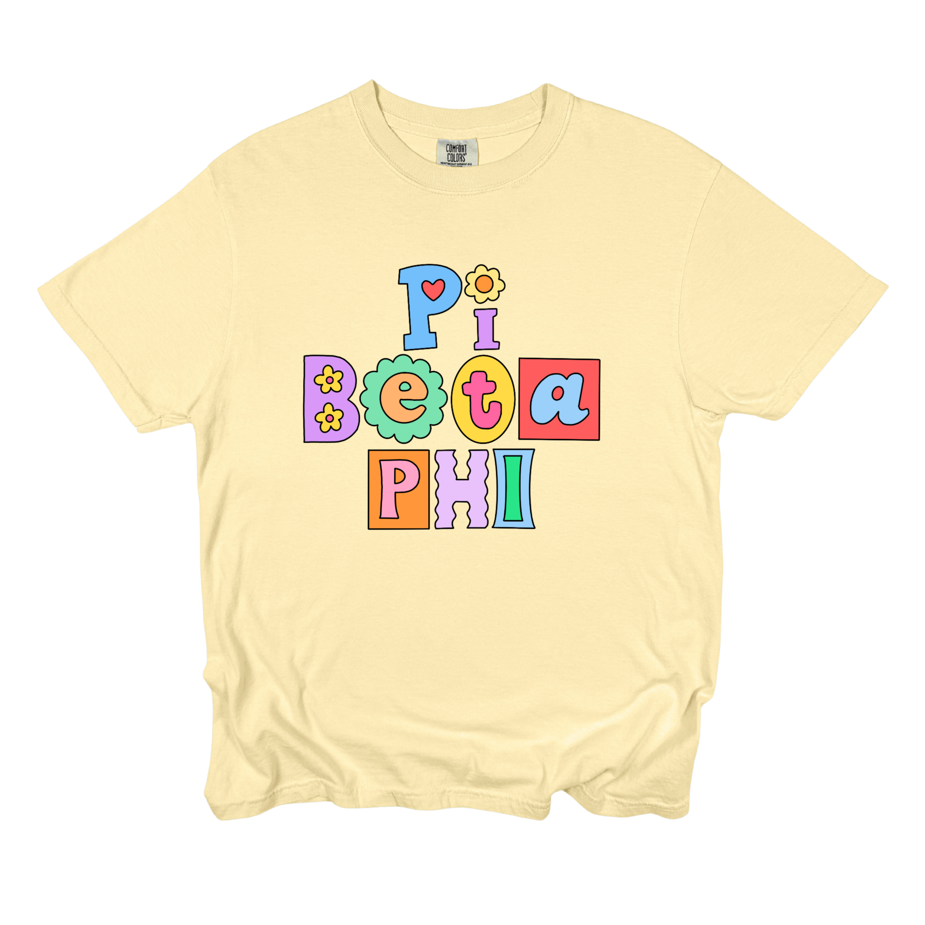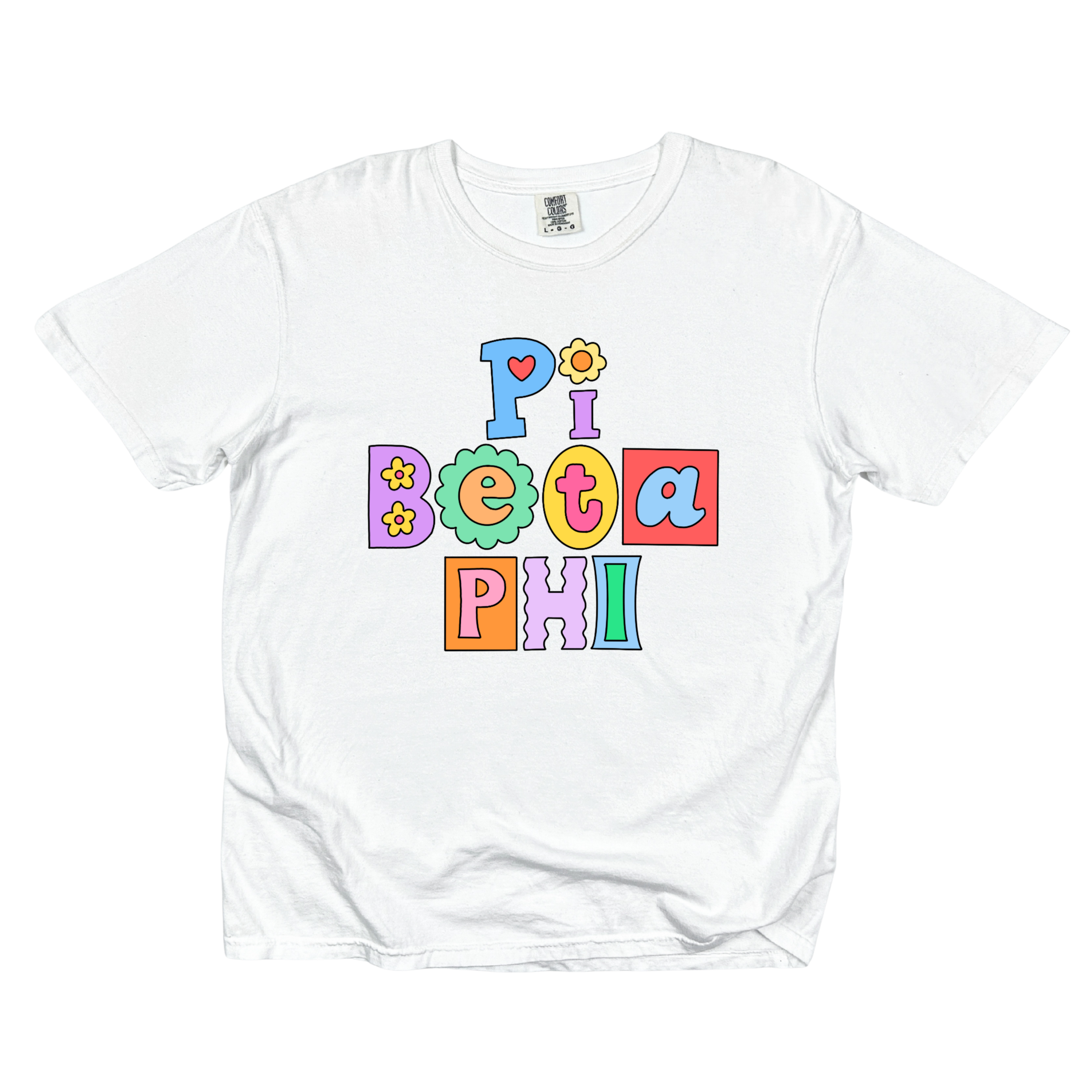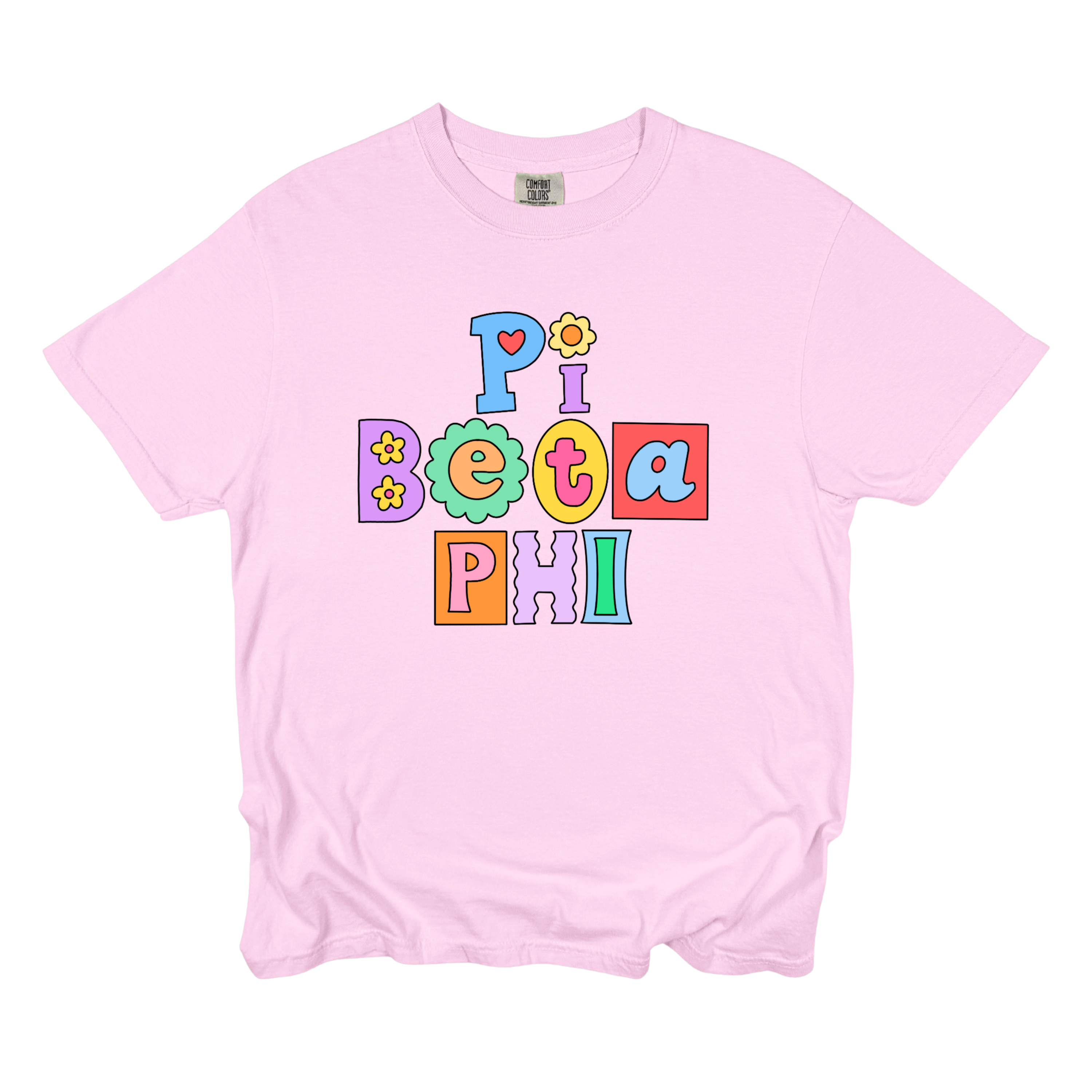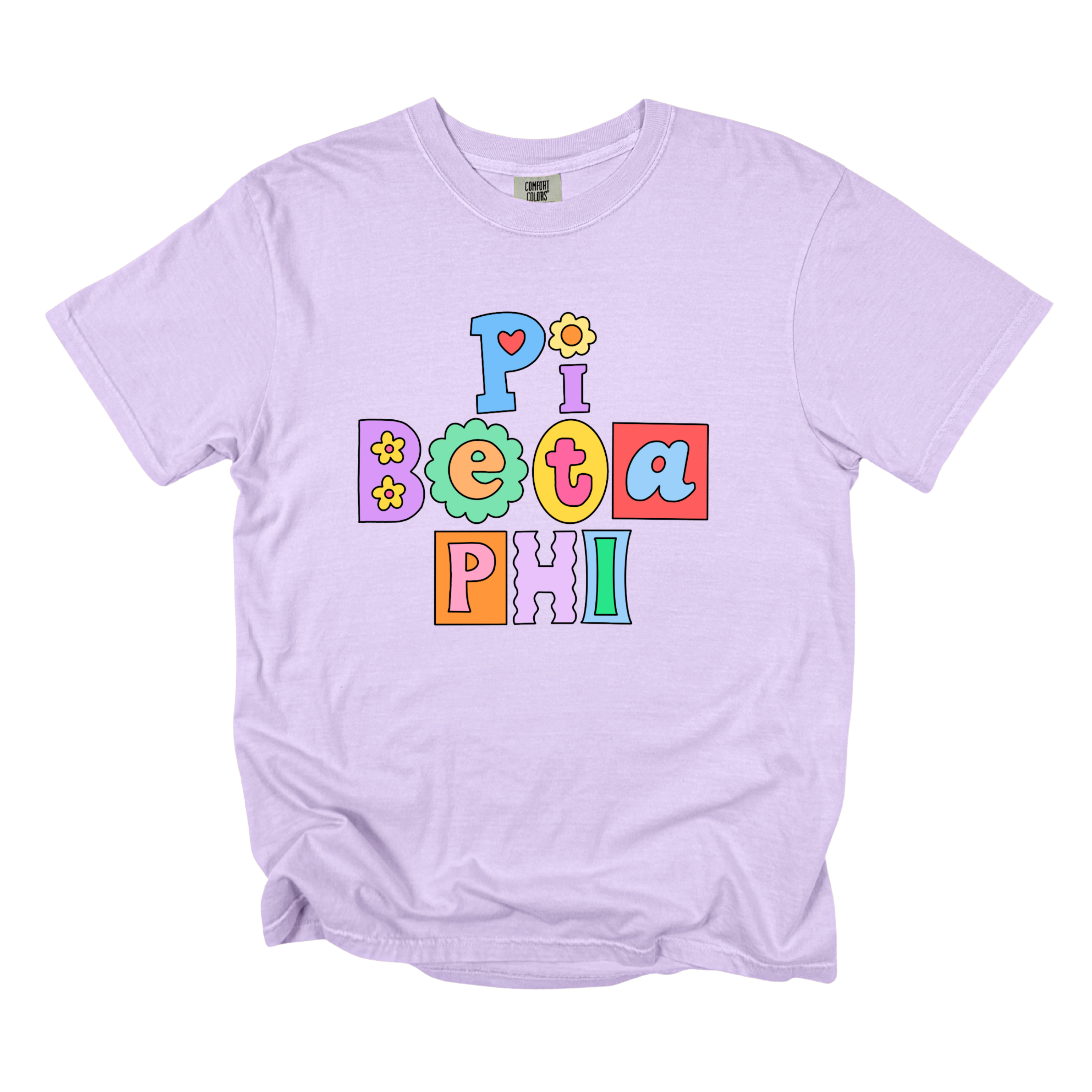 Printed on a soft Comfort Colors tee, this shirt brings together pastel and pop-art colors — lavender, yellow, coral, turquoise, and pink — that look adorable on every background. Available in White, Chambray, Blossom, Butter, and Orchid, it’s the perfect mix of trendy and timeless for any sorority event.