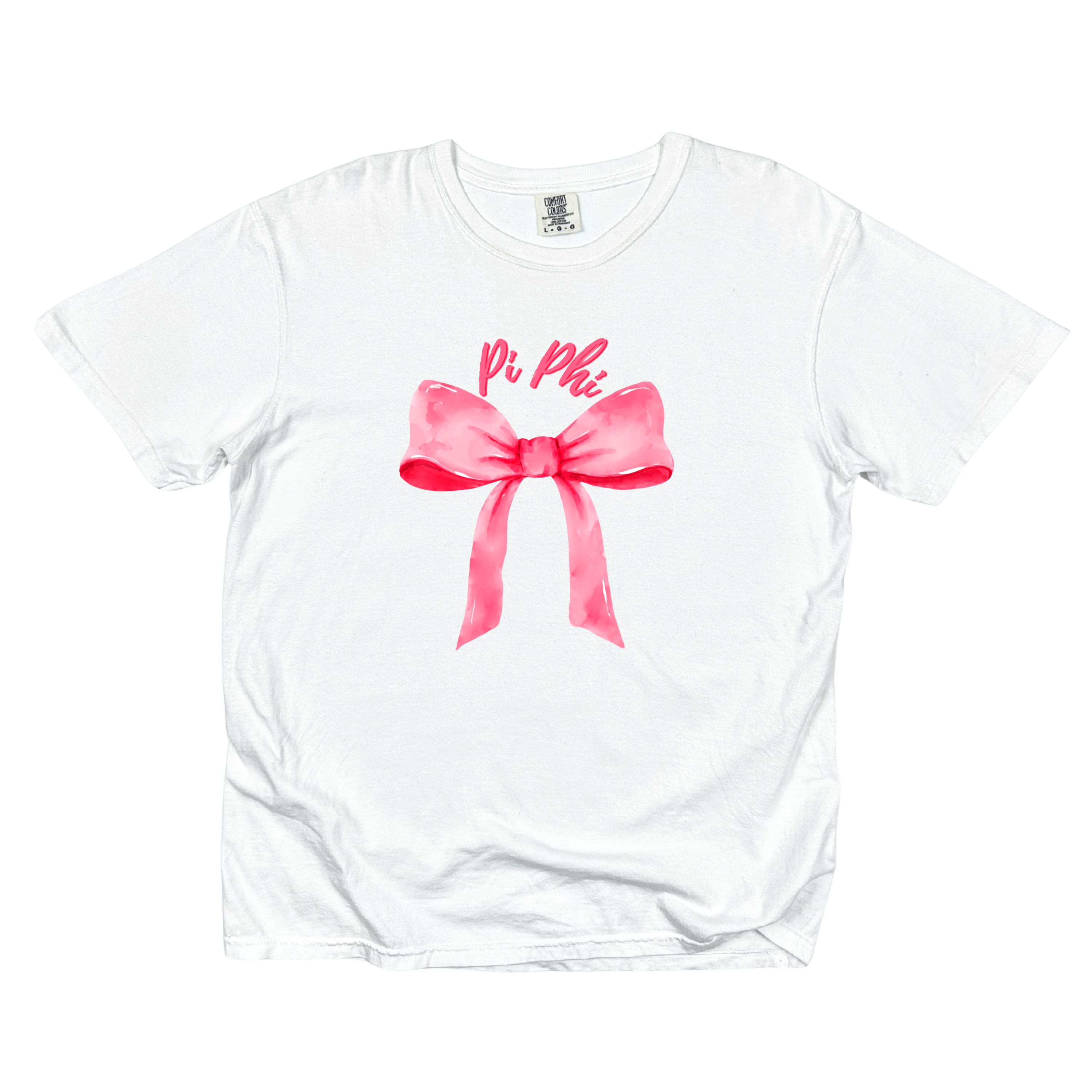 Add a touch of girly charm to your Greek-life wardrobe with our Sorority Bow Tee! Featuring a bold, watercolor bow graphic and your sorority name in a trendy handwritten font, this shirt is perfect for bid day, work week, big/little reveal, or everyday campus wear.