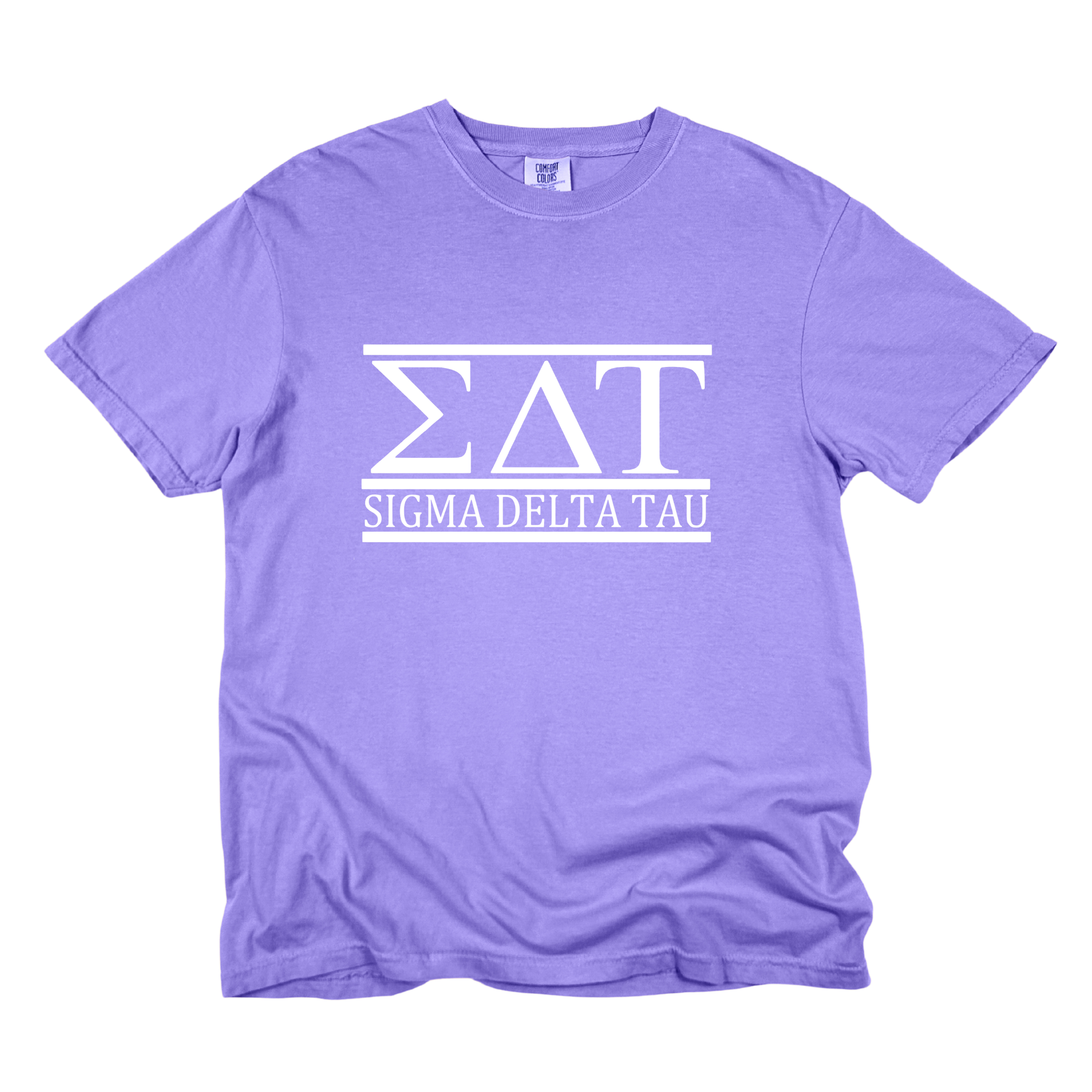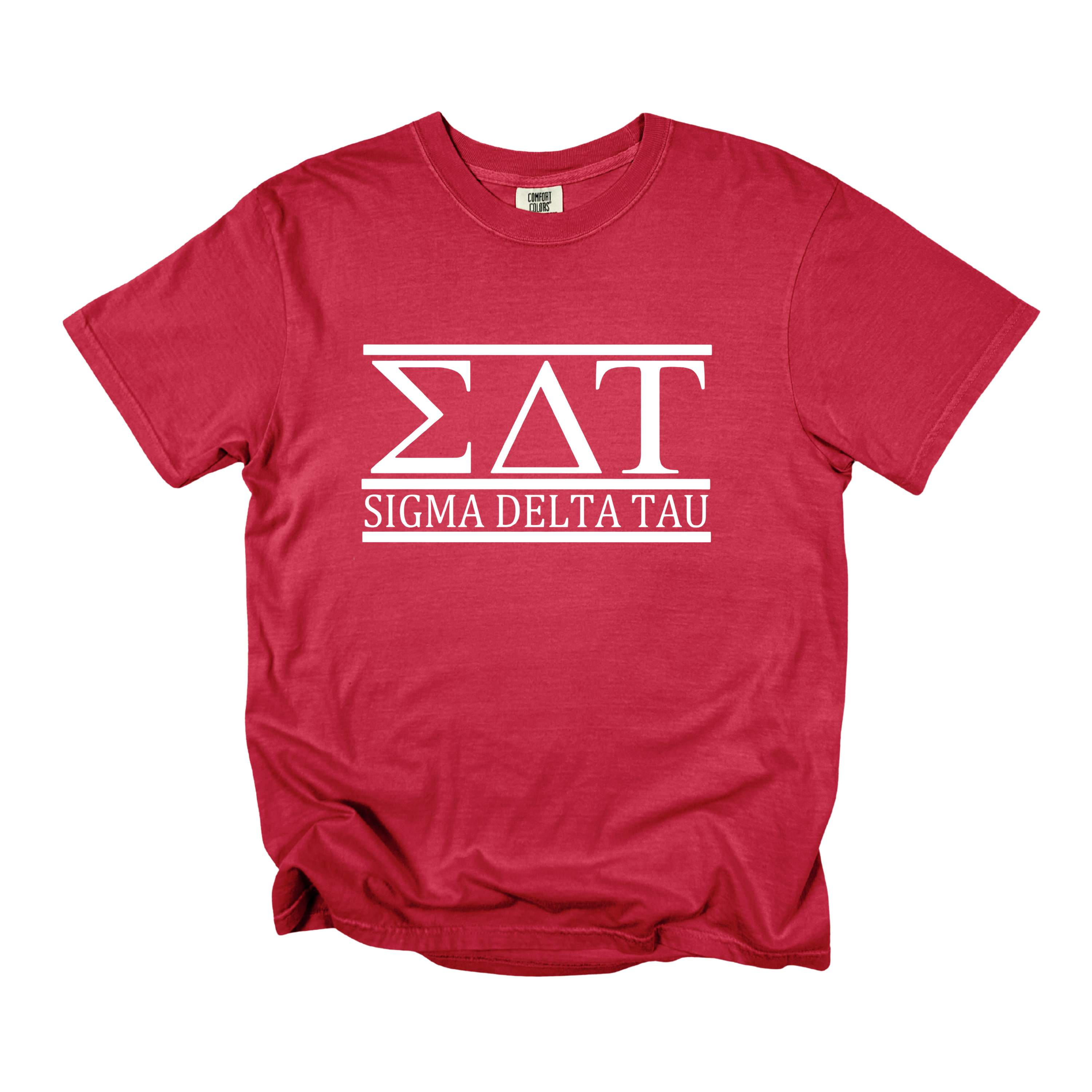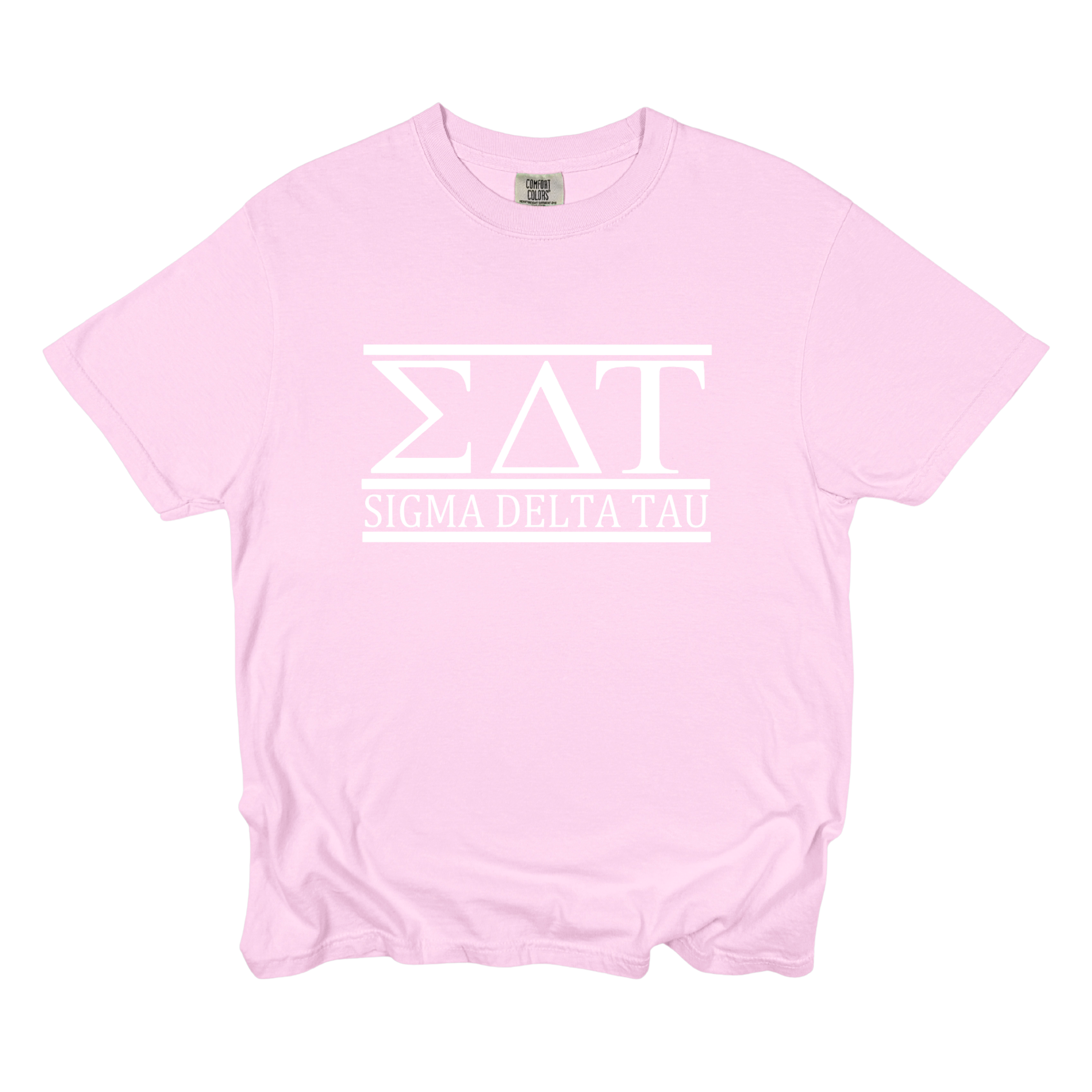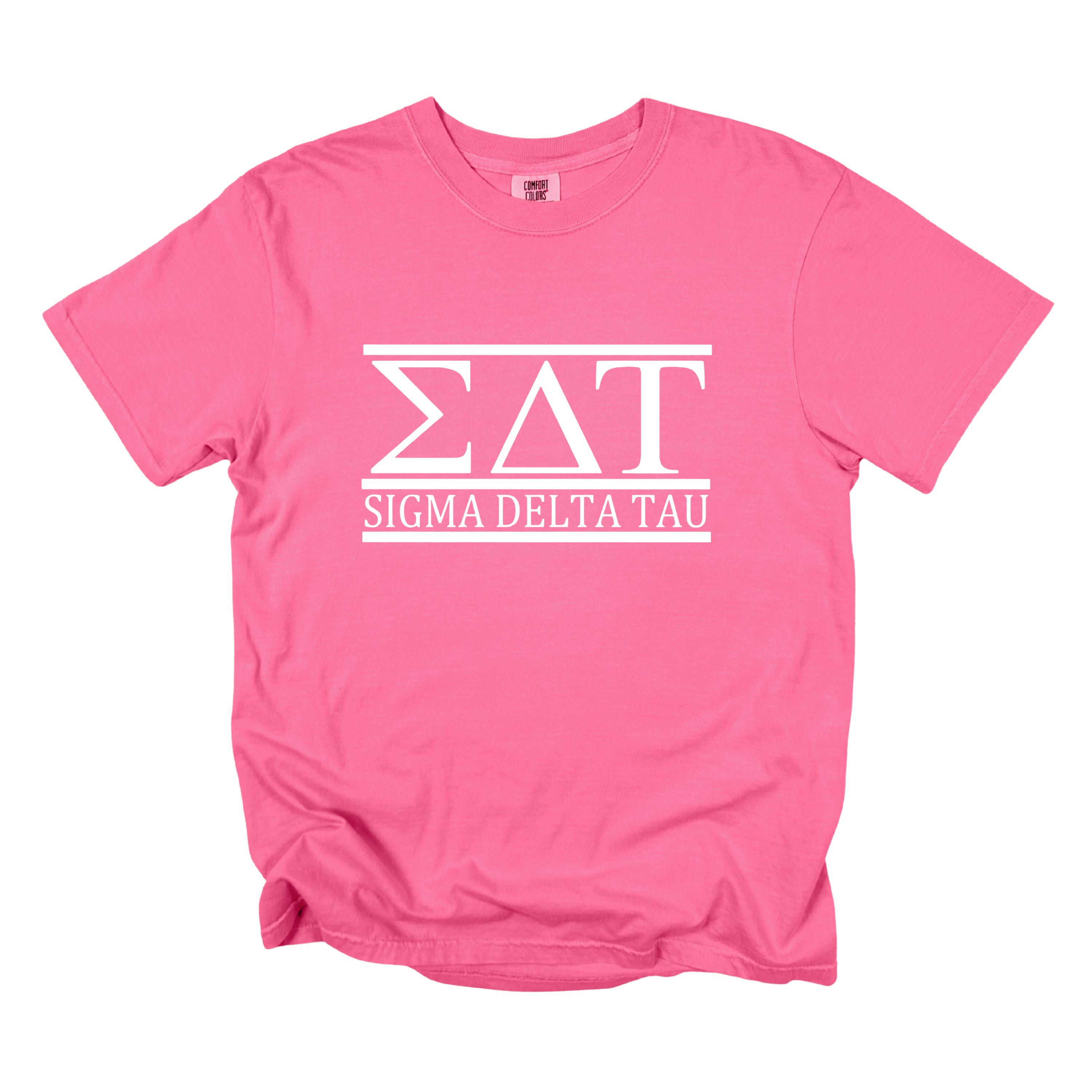 Keep it timeless with our Classic Greek Letters Sorority Tee — a clean, minimalist design that never goes out of style. Featuring bold white Greek letters and matching text framed by simple horizontal lines, this look is both elegant and effortless. Printed on a soft Comfort Colors tee in a vibrant hot pink hue, it’s the perfect balance of sorority pride and everyday wearability.