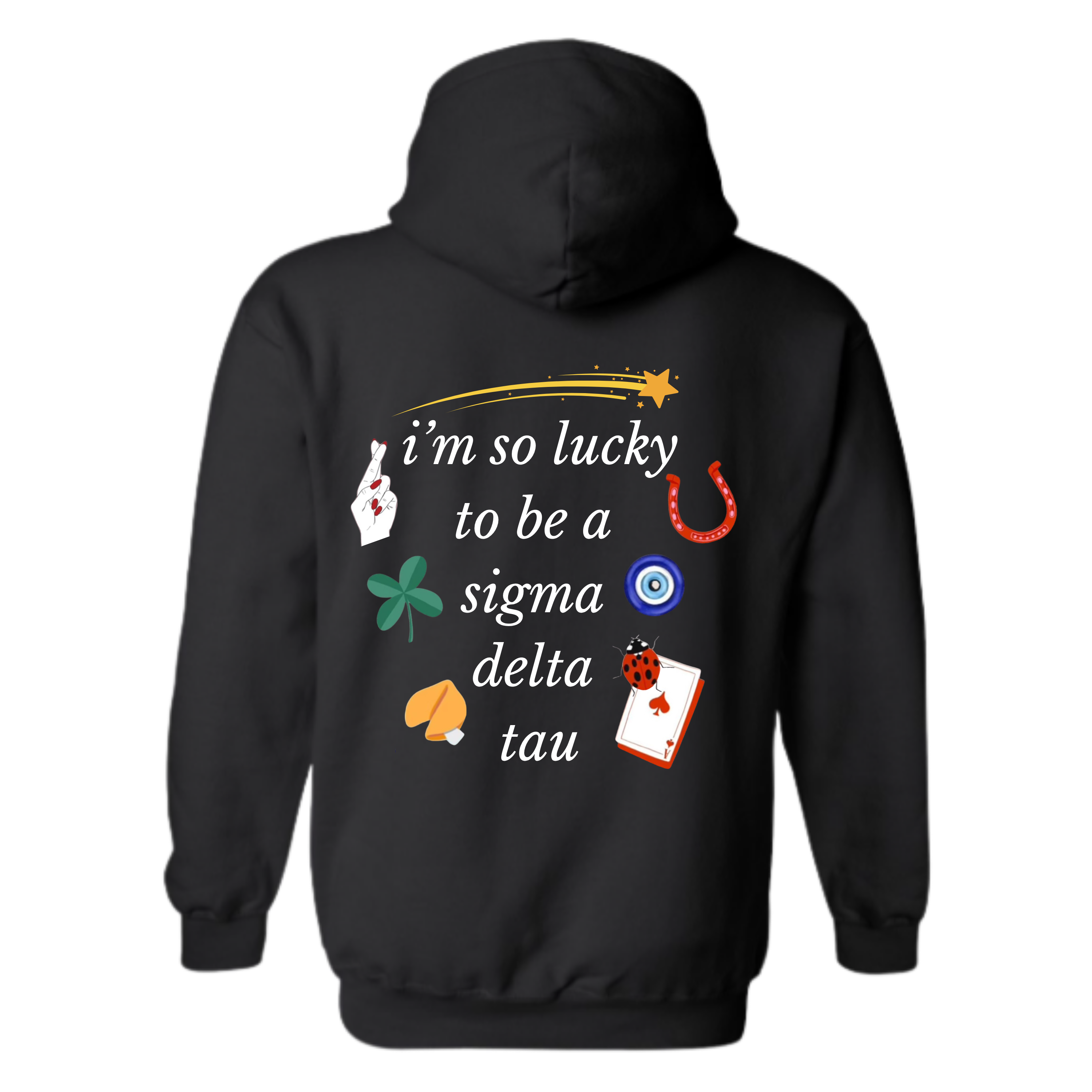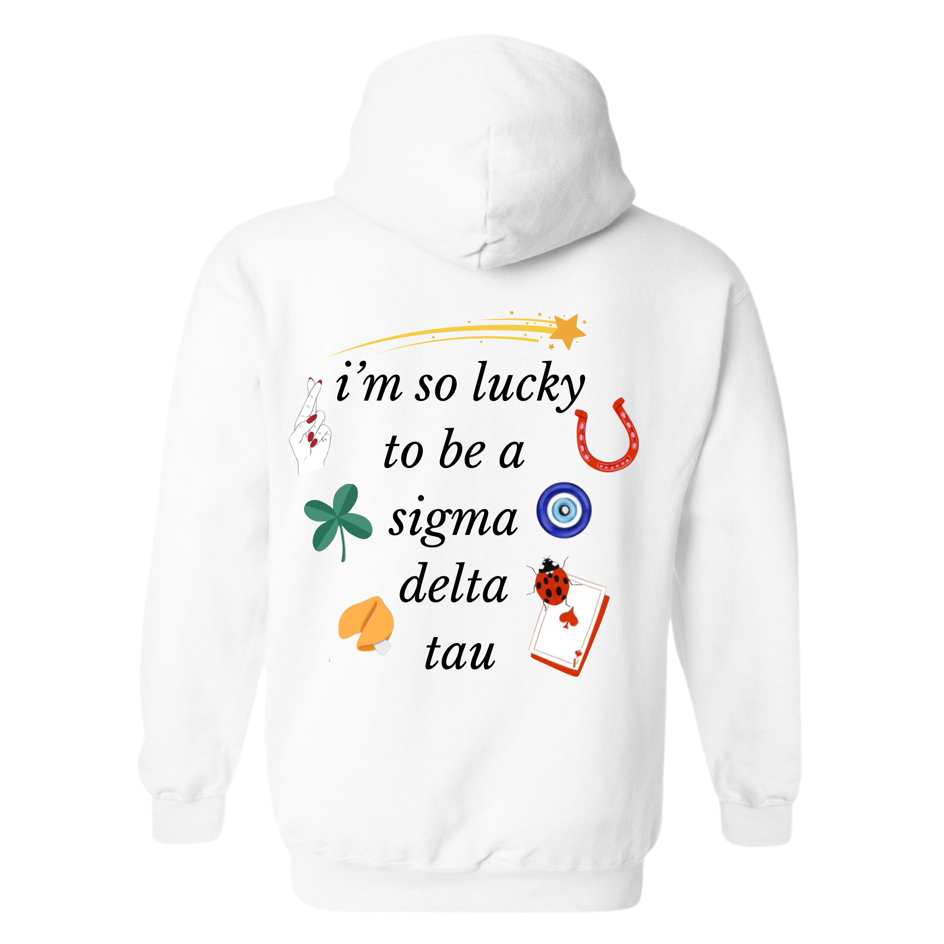 Get ready to embrace your lucky girl era with the cutest, most charm-filled sorority hoodie of the year! This cozy unisex hoodie features a playful mix of lucky symbols — shooting stars, horseshoes, clovers, evil eye, ladybug, aces, and more — wrapped around the phrase “I’m so lucky to be a [Your Sorority]”. It’s the perfect blend of trendy, girly, and sentimental for every sister.