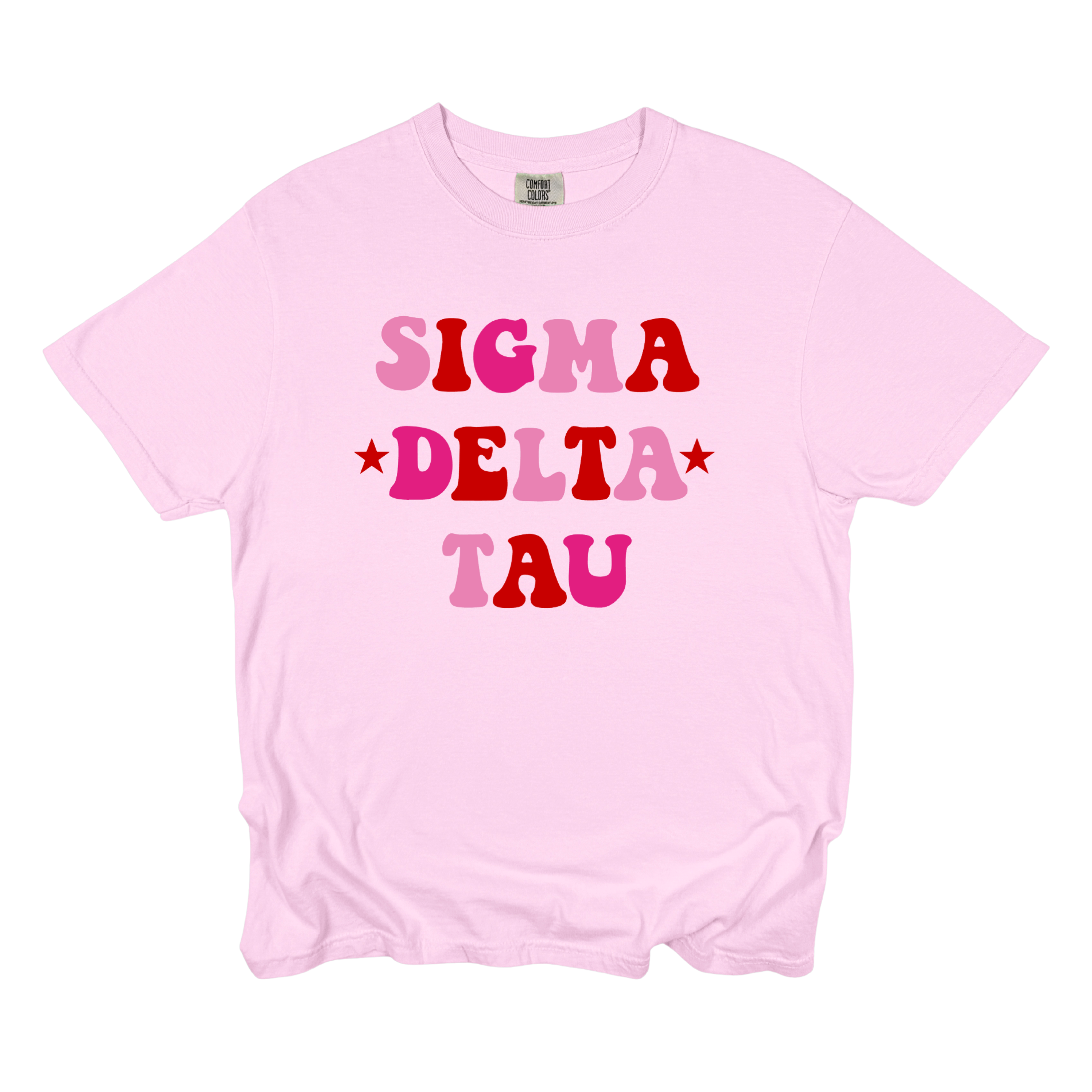 Show off your sisterhood in style with this retro pink and red sorority tee! Designed with bold, bubbly lettering in shades of cherry red, bubblegum pink, blush, and rose, this design pops beautifully against the light pastel pink Comfort Colors tee. The mix of warm, girly tones gives it a fun and nostalgic feel — perfect for bid day, big/little reveal, or everyday campus wear.