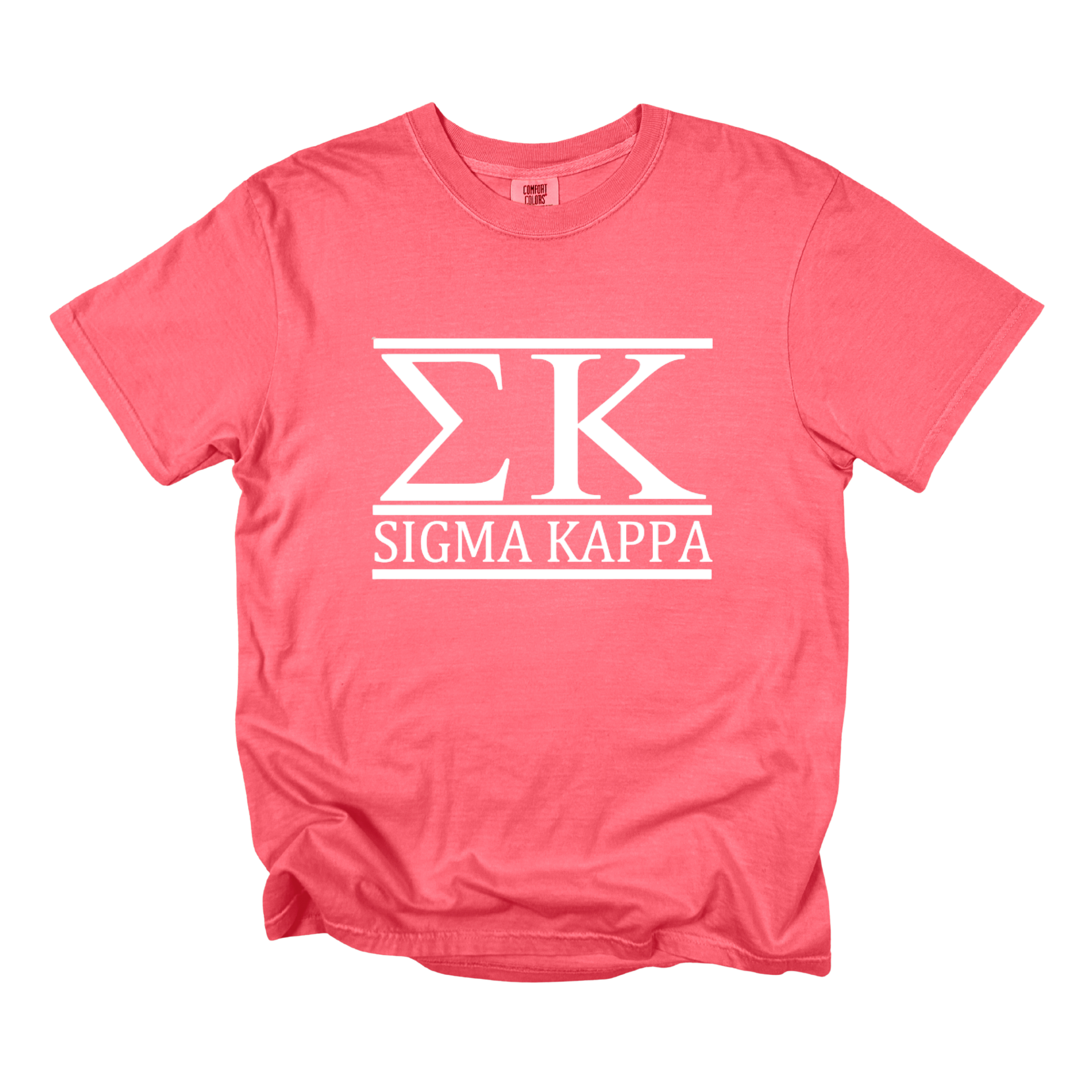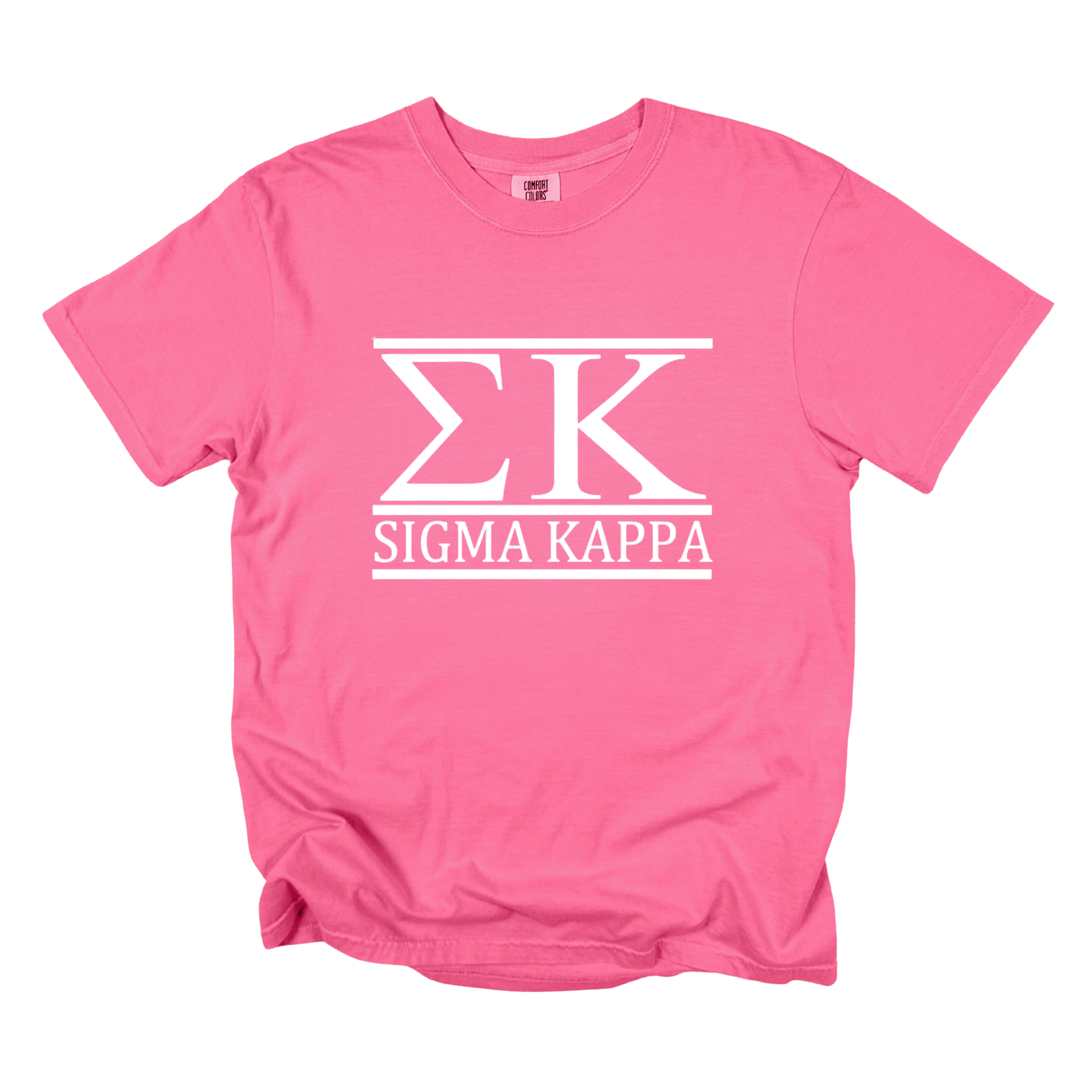 Keep it timeless with our Classic Greek Letters Sorority Tee — a clean, minimalist design that never goes out of style. Featuring bold white Greek letters and matching text framed by simple horizontal lines, this look is both elegant and effortless. Printed on a soft Comfort Colors tee in a vibrant hot pink hue, it’s the perfect balance of sorority pride and everyday wearability.