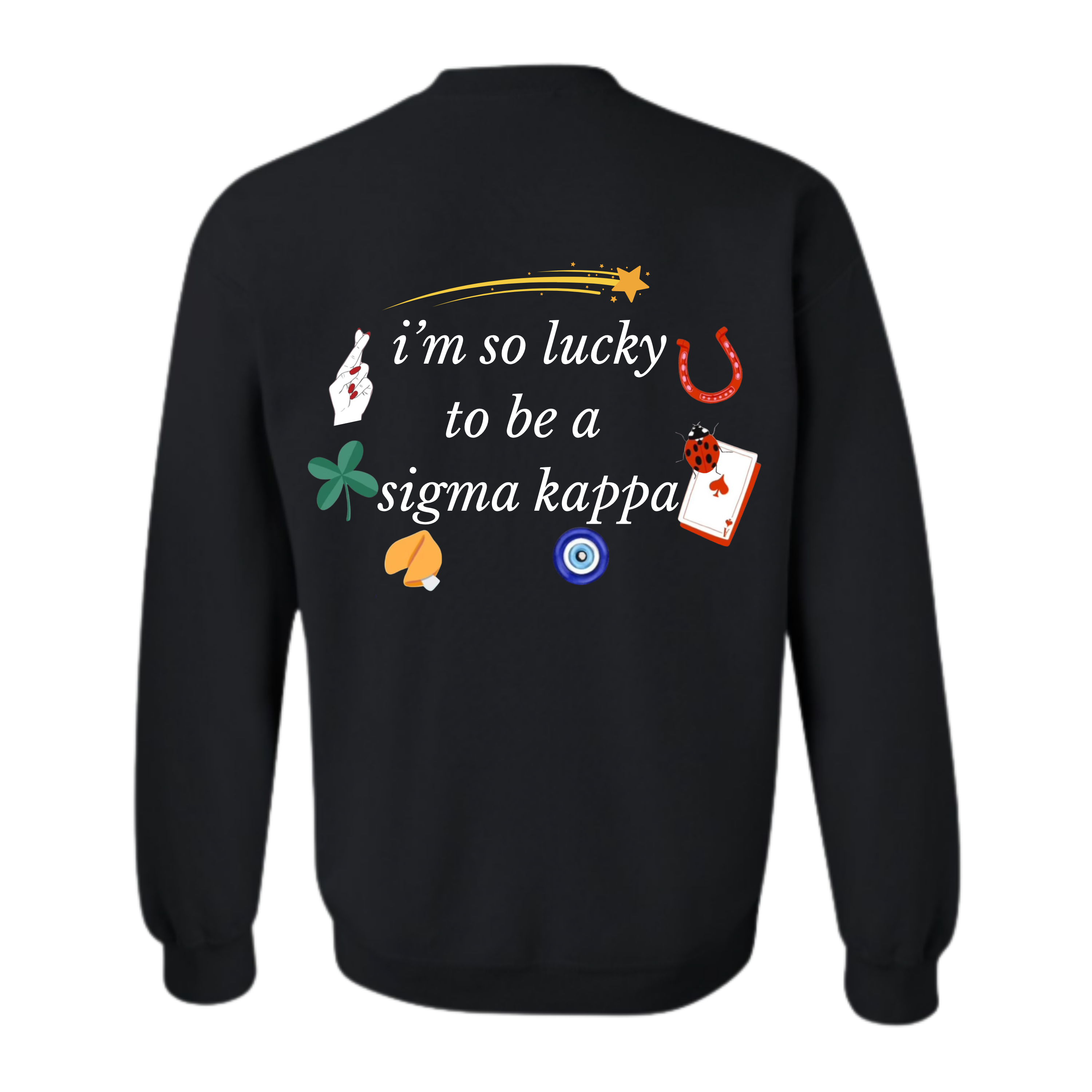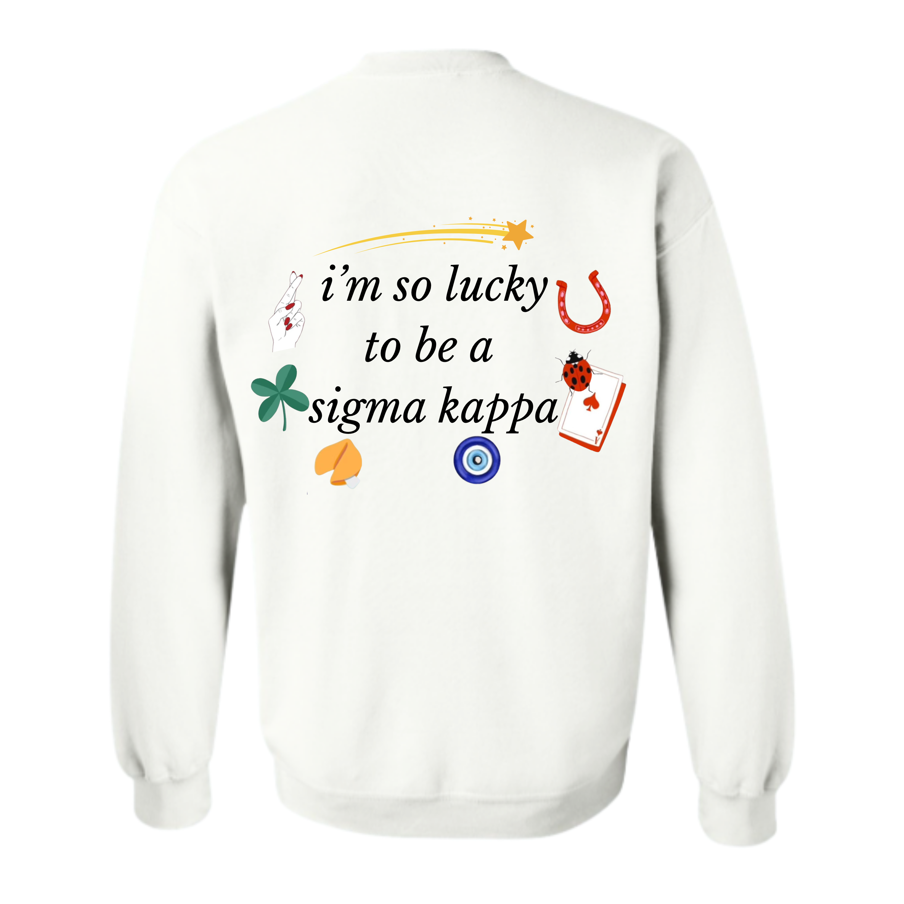 ☆ Step into your lucky girl era with the cutest, charm-inspired sorority crewneck of the season! This cozy, soft crewneck features a whimsical mix of lucky symbols — shooting stars, horseshoes, clovers, evil eye, ladybug, aces, charms, and more — all wrapped around the phrase “I’m so lucky to be a [Your Sorority]”. It’s sweet, sentimental, and instantly aesthetic for every sister.