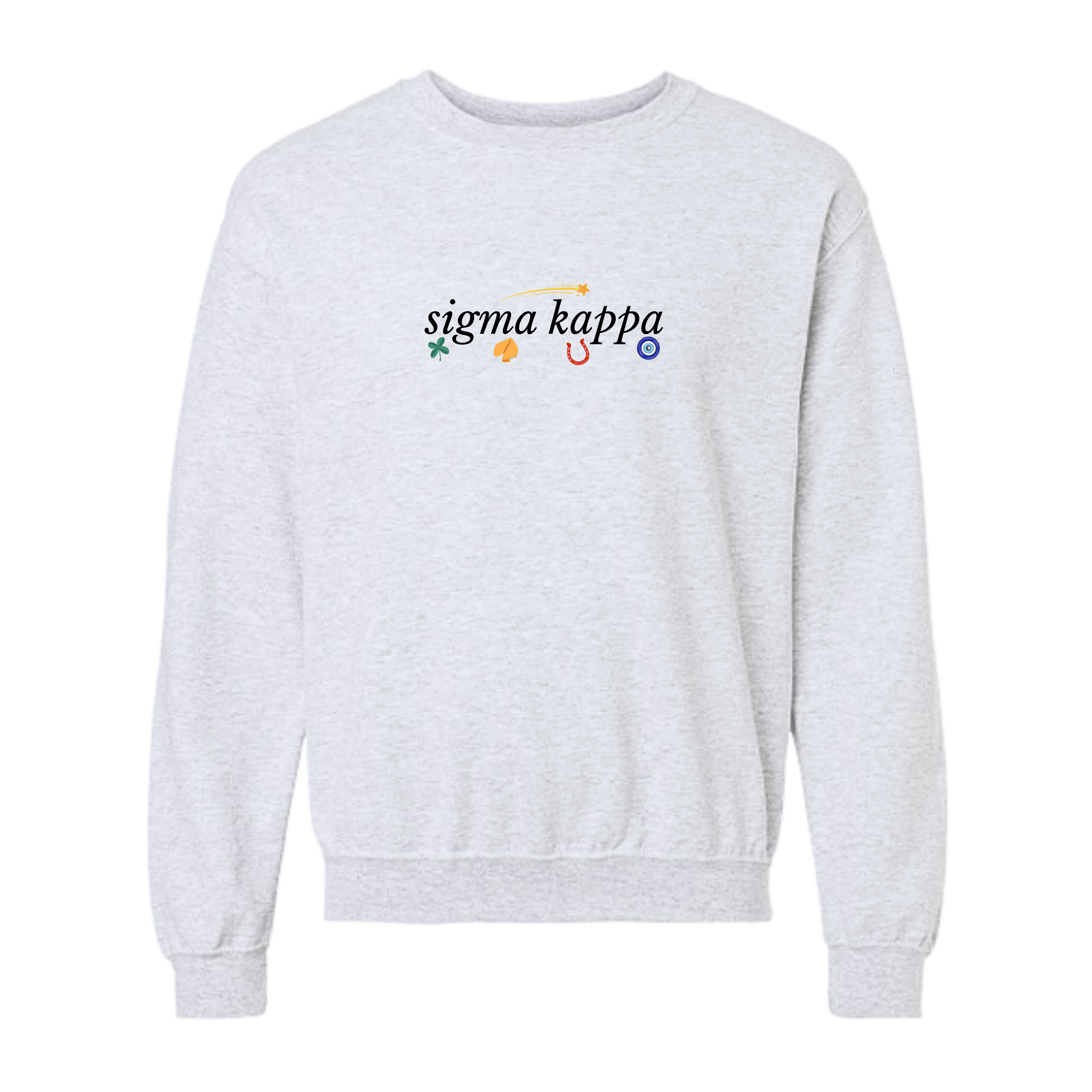 ☆ Choose your sorority and we’ll personalize the design for your chapter — Chi Omega, Zeta Tau Alpha, Alpha Phi, Kappa Delta, Delta Gamma, Phi Mu, Alpha Chi Omega, and so many more. Each crewneck also includes a matching mini charm graphic on the front chest to complete the look.