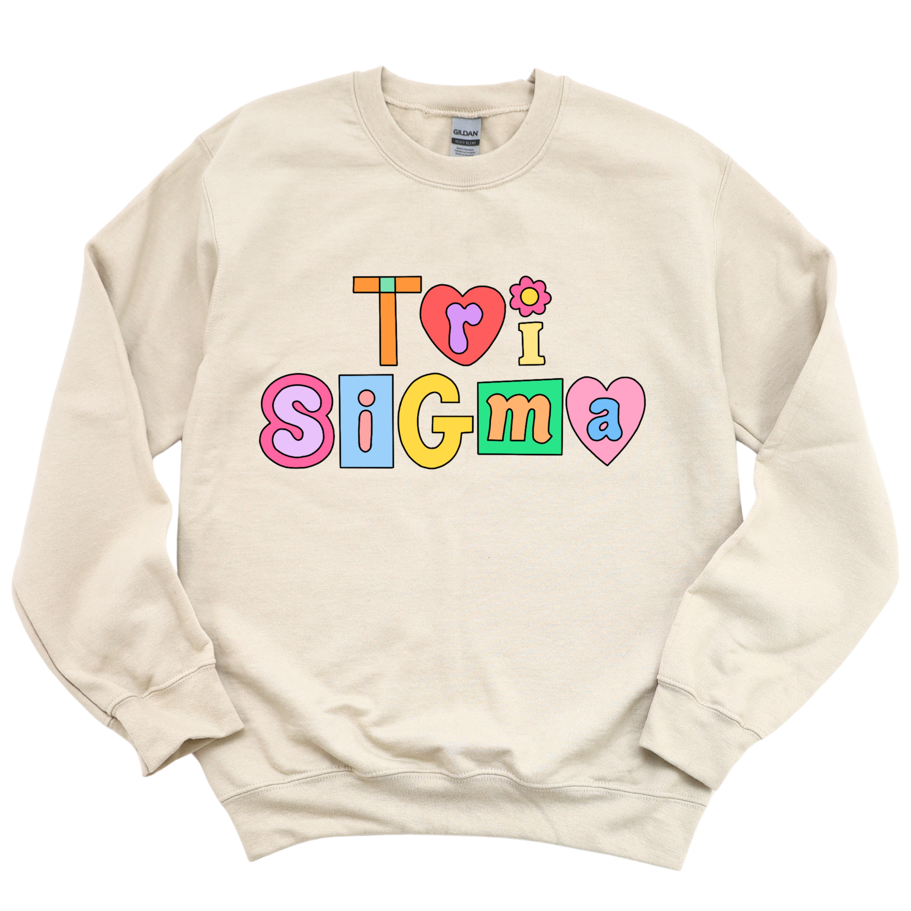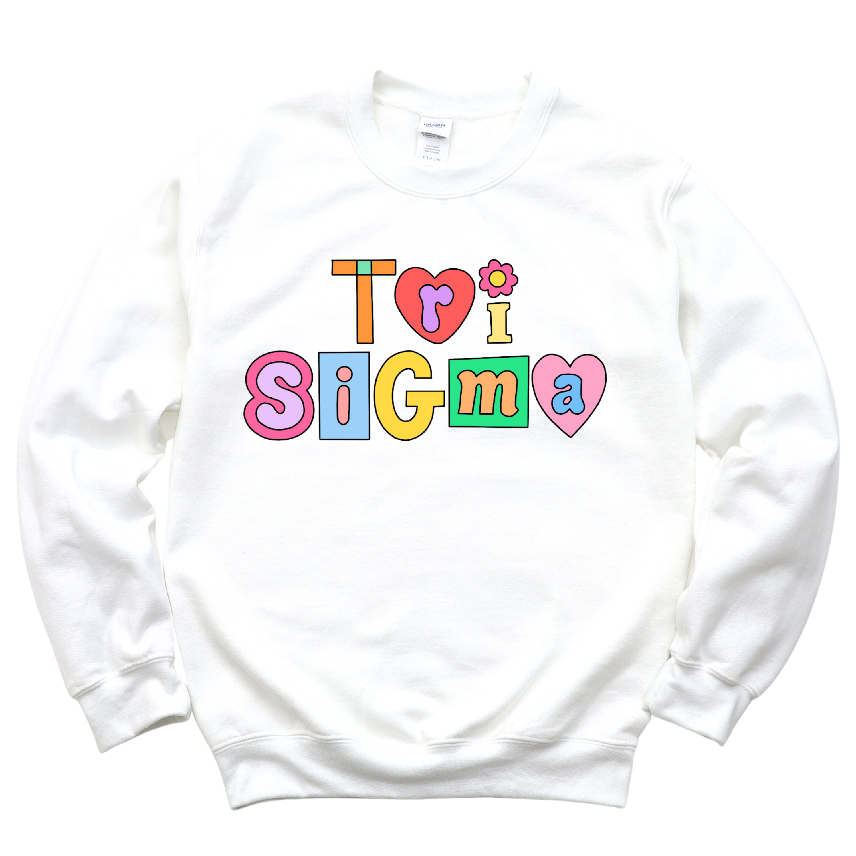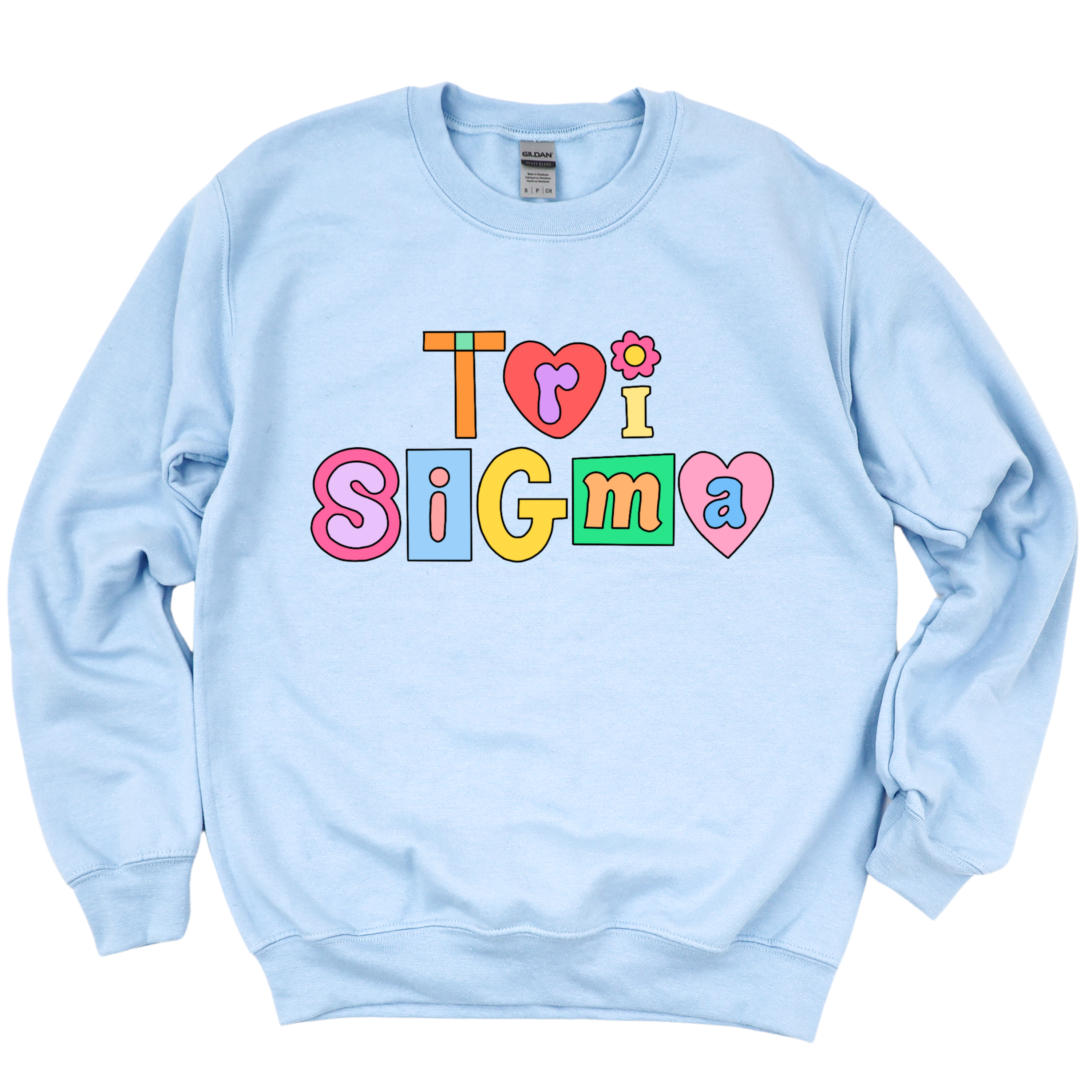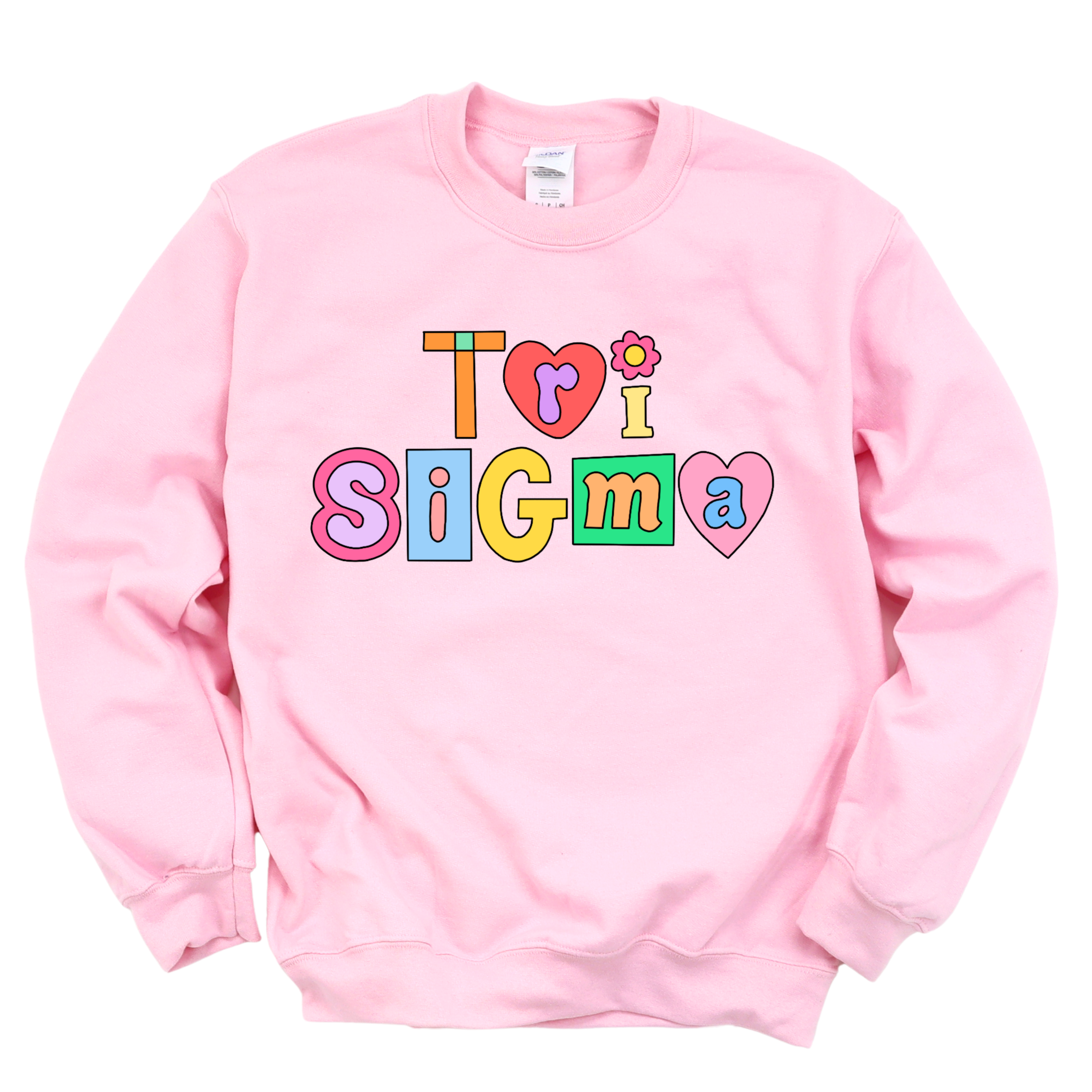 ☆ Bring some color and personality to your wardrobe with this fun block-letter crewneck sweatshirt! Featuring bold letters in vibrant shades, playful shapes, and cheerful accents like hearts and flowers, this cozy sweatshirt is perfect for anyone who loves a bright, uplifting style.