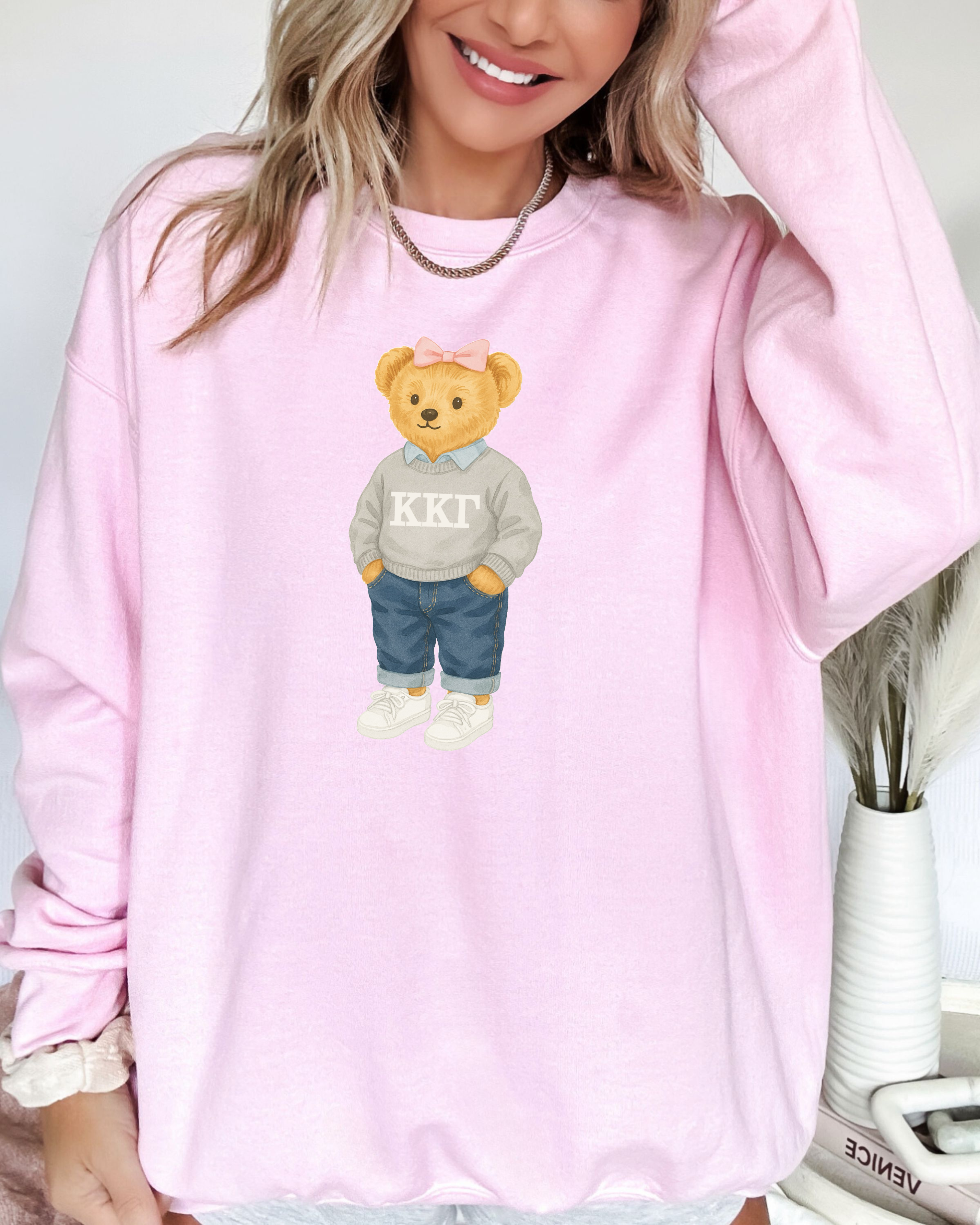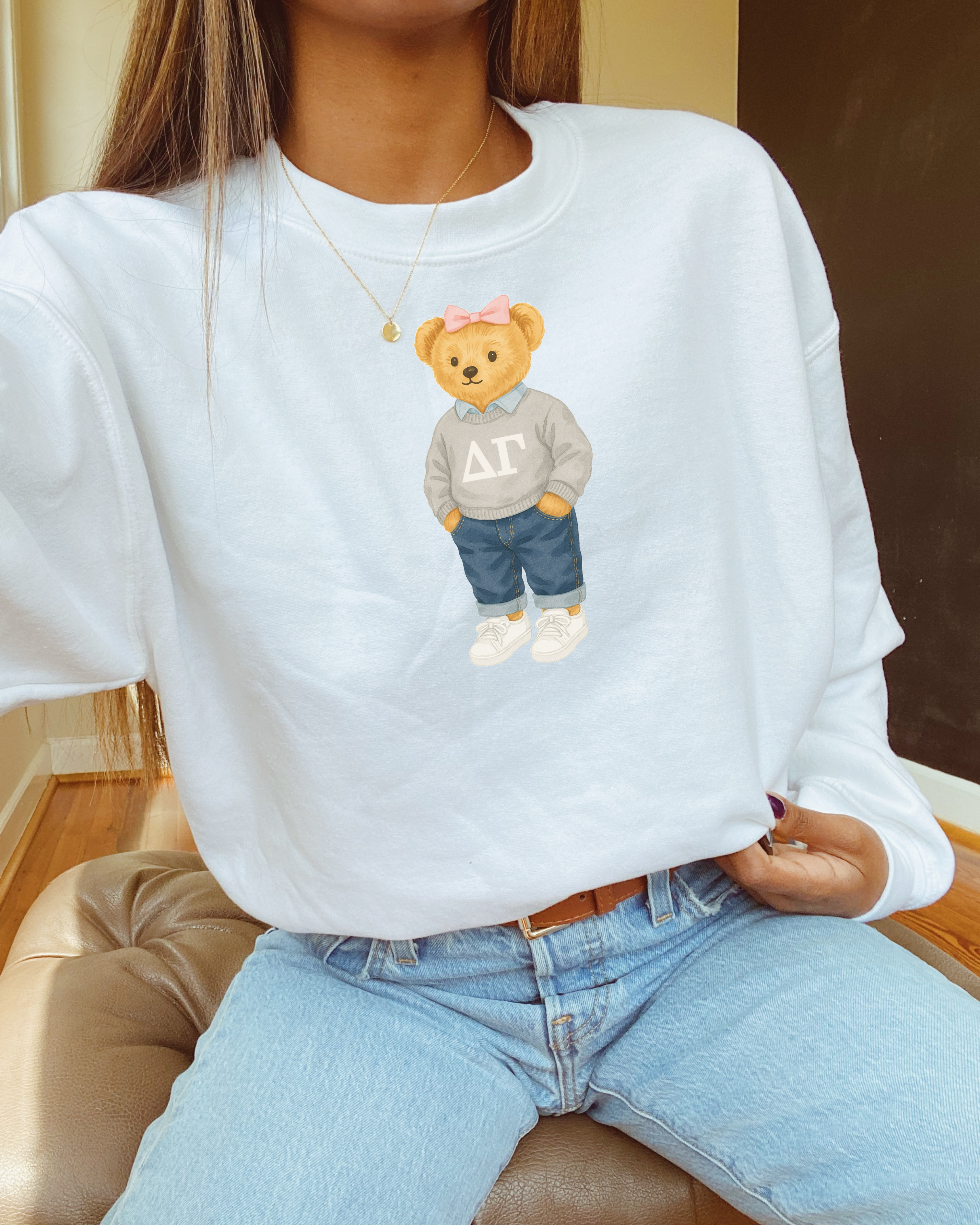 Say hello to the cutest new member of your chapter wardrobe — The Cozy Bear. This soft, oversized crewneck features an adorable, preppy bear dressed in your sorority’s letters, bringing all the warm-and-fuzzy vibes to class days, coffee runs, and sisterhood events.