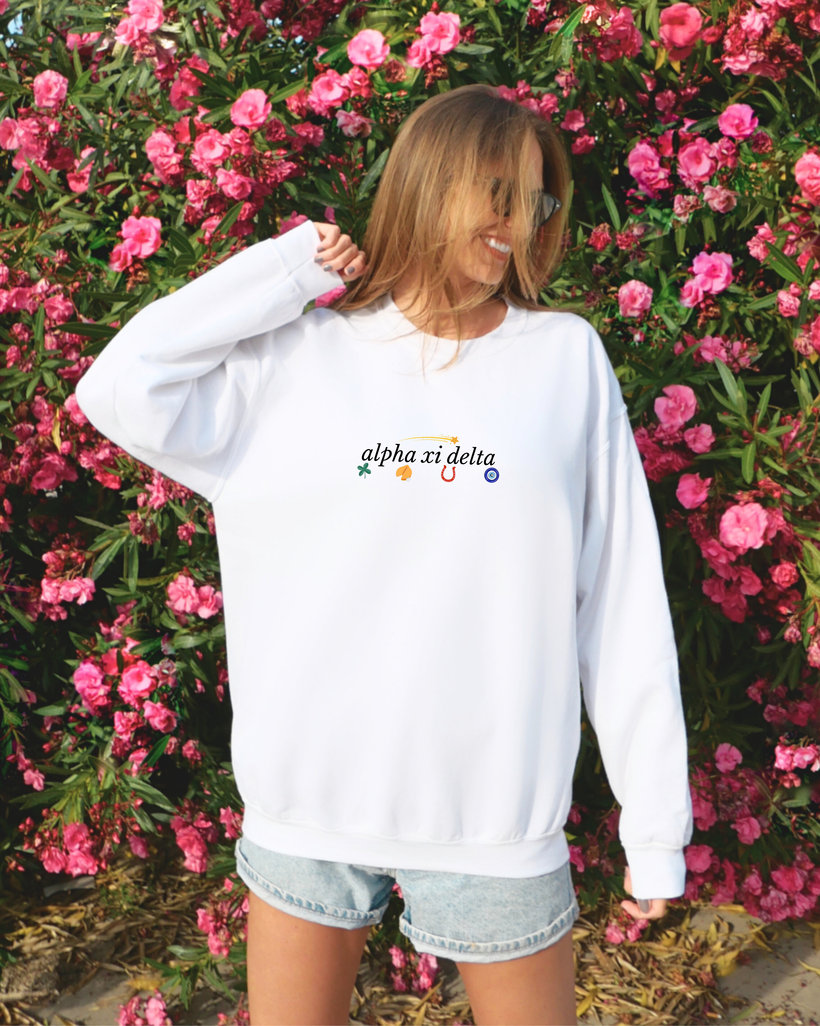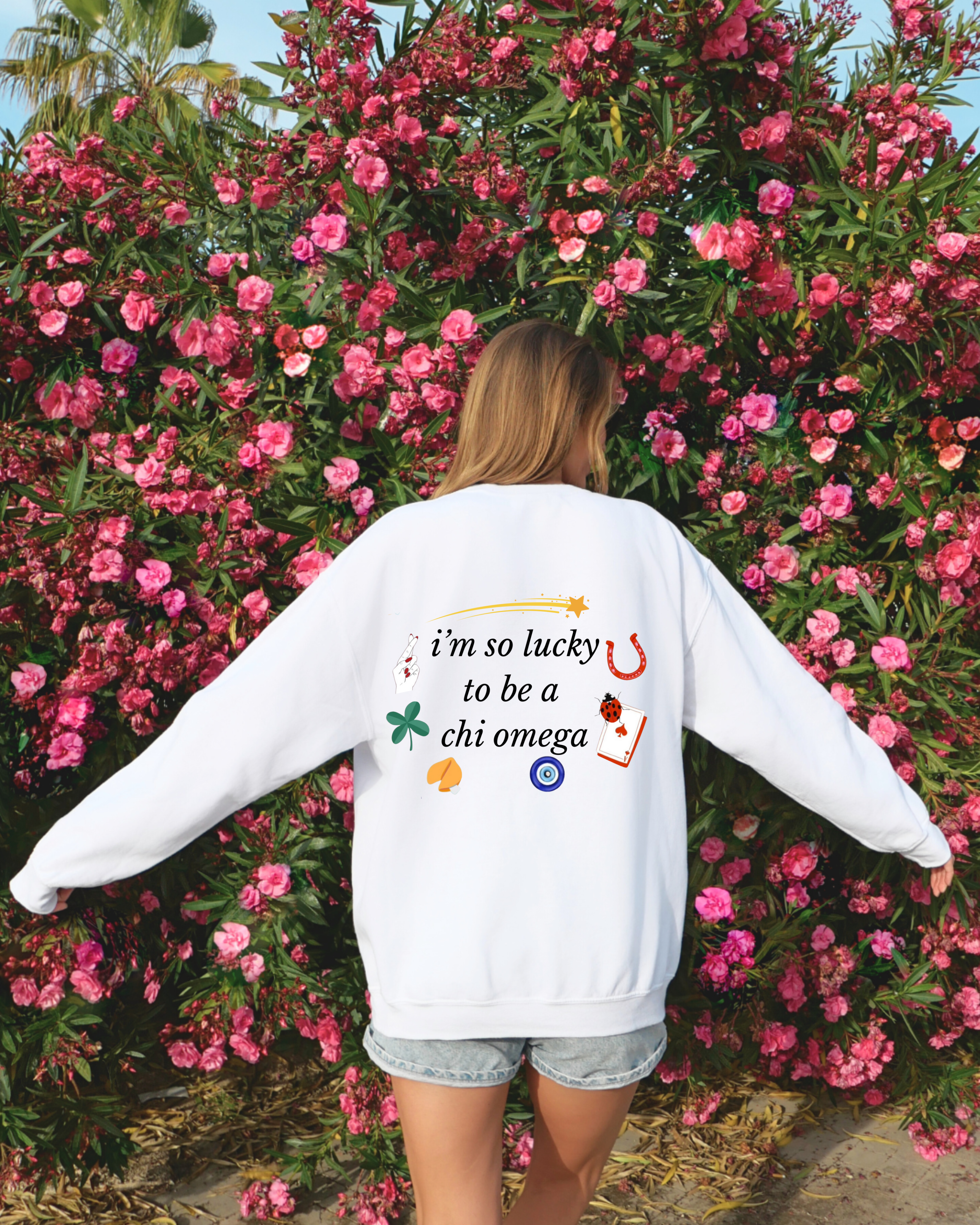 ☆ Meet your new go-to good-vibes crewneck. The Lucky Girl sweatshirt is designed for every sorority girl who believes in signs, good energy, and being exactly where she’s meant to be. Featuring a playful mix of lucky icons and a clean, modern typeface, this cozy crew instantly becomes a feel-good favorite for class days, chapter nights, and everything in between.