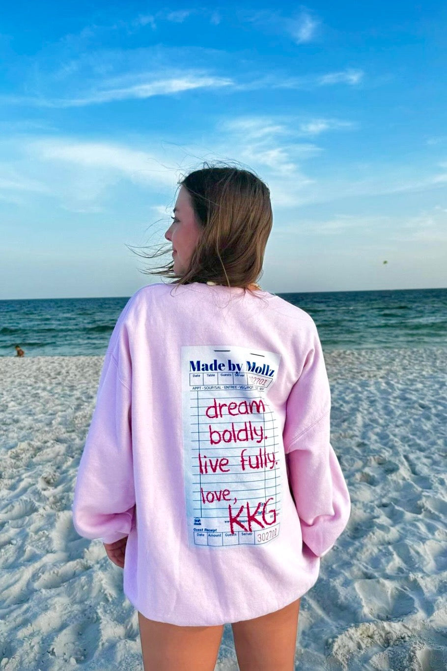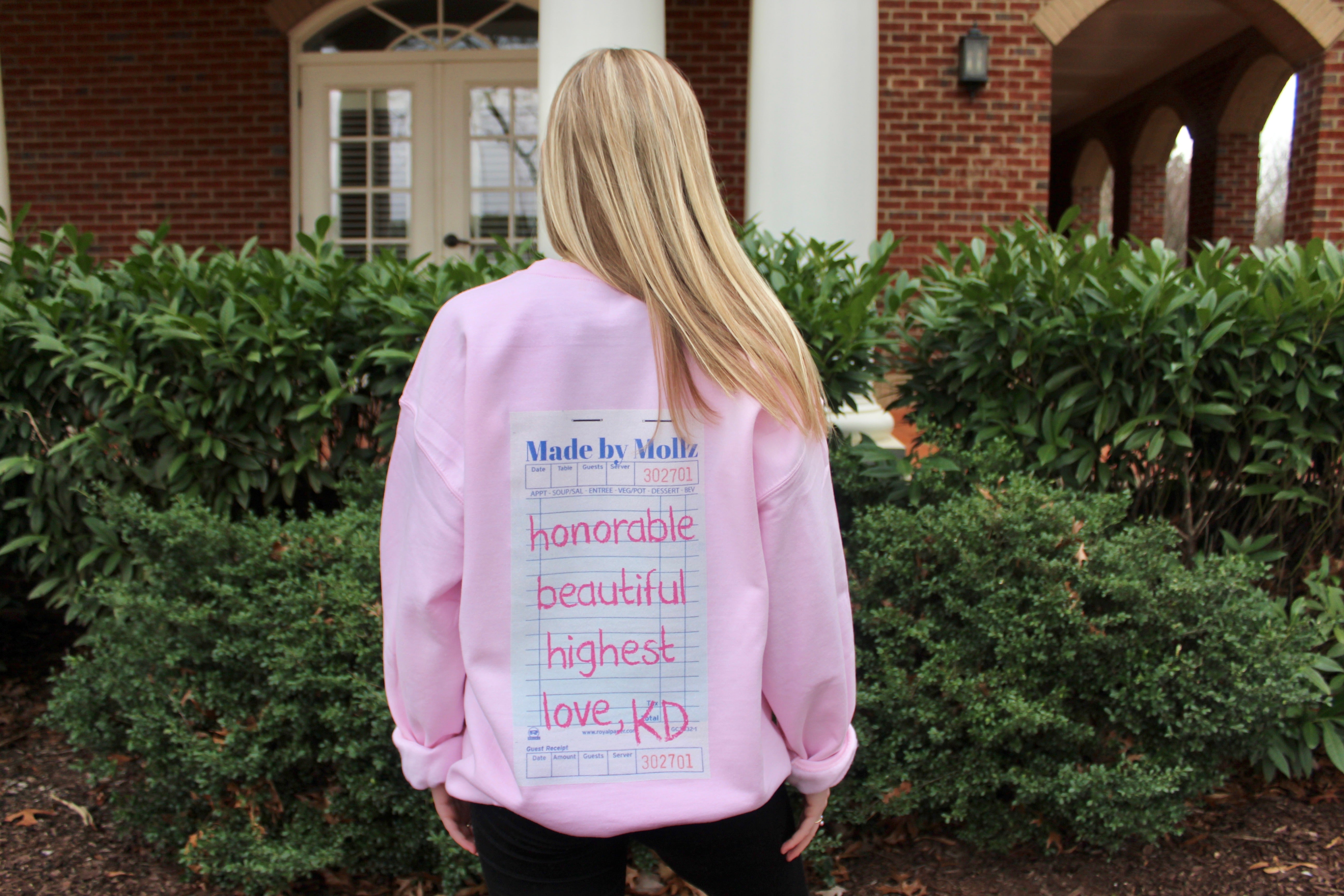 The Order Up Crewneck is the cutest, quirkiest way to rep your sorority — served fresh and straight from the “Made by Mollz” menu. Featuring a simple handwritten sorority name + heart on the front and a full diner-style notepad design on the back, this sweatshirt is playful, nostalgic, and totally unique. Every line on the notepad highlights sweet, empowering traits and ends with a sign-off that feels personal to your sisterhood.