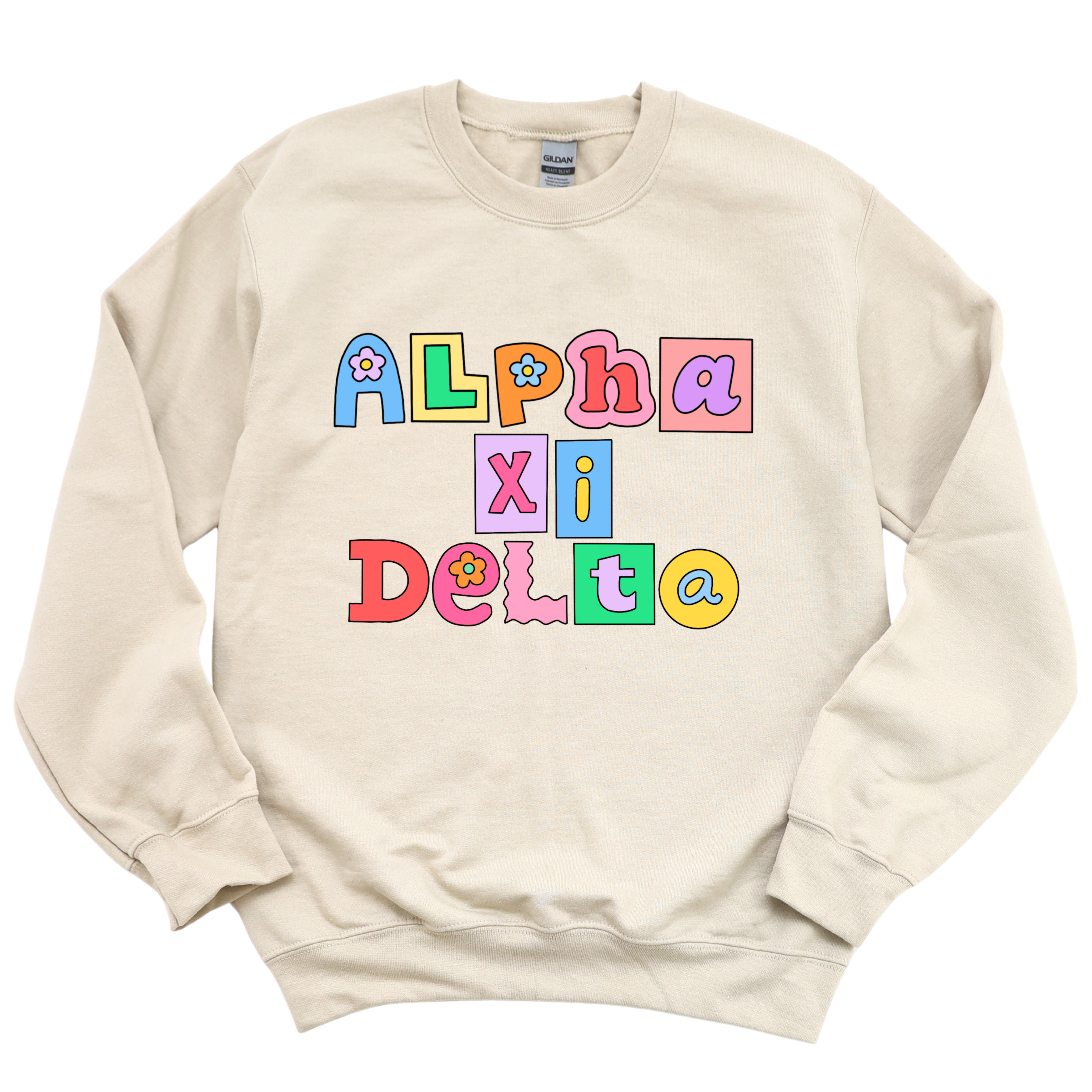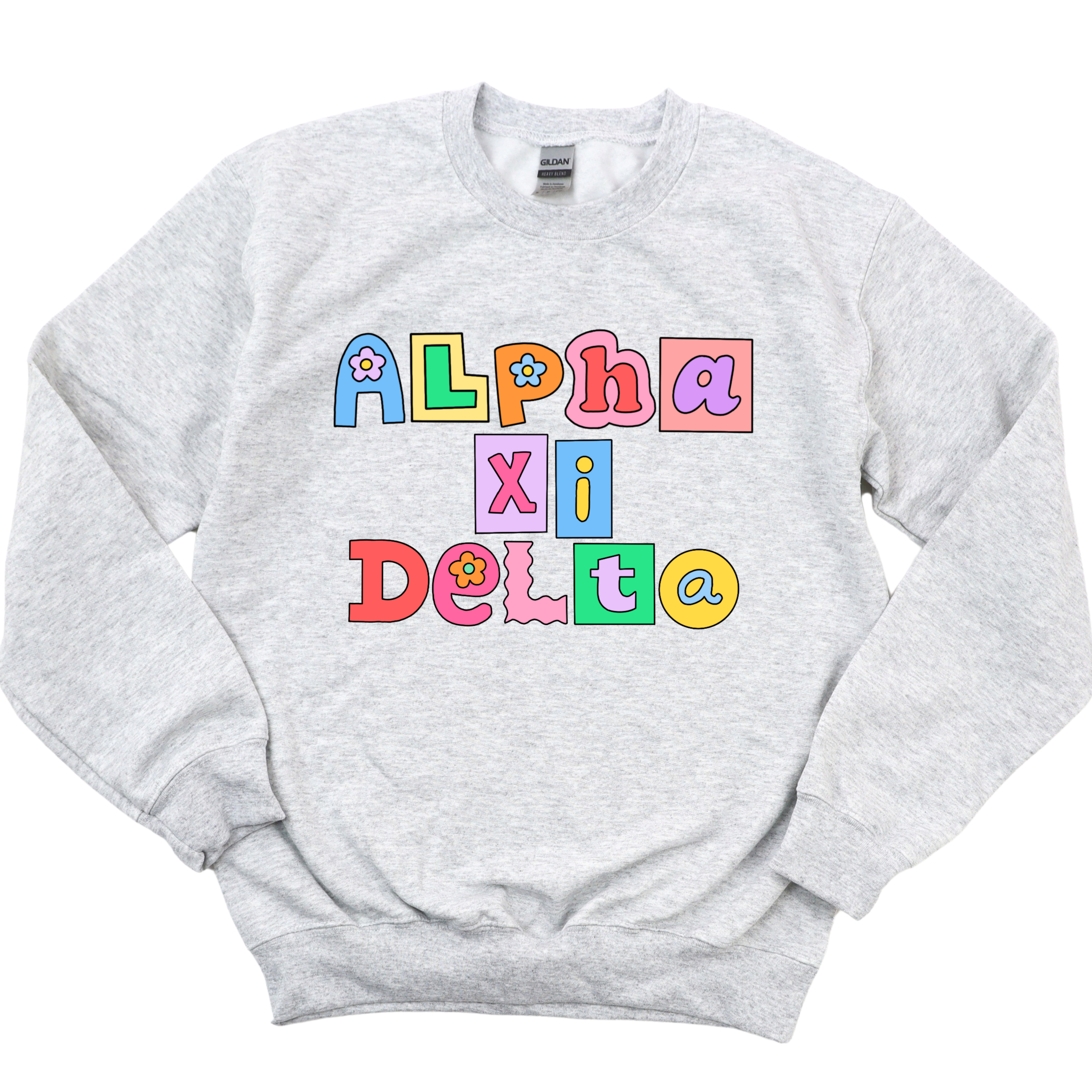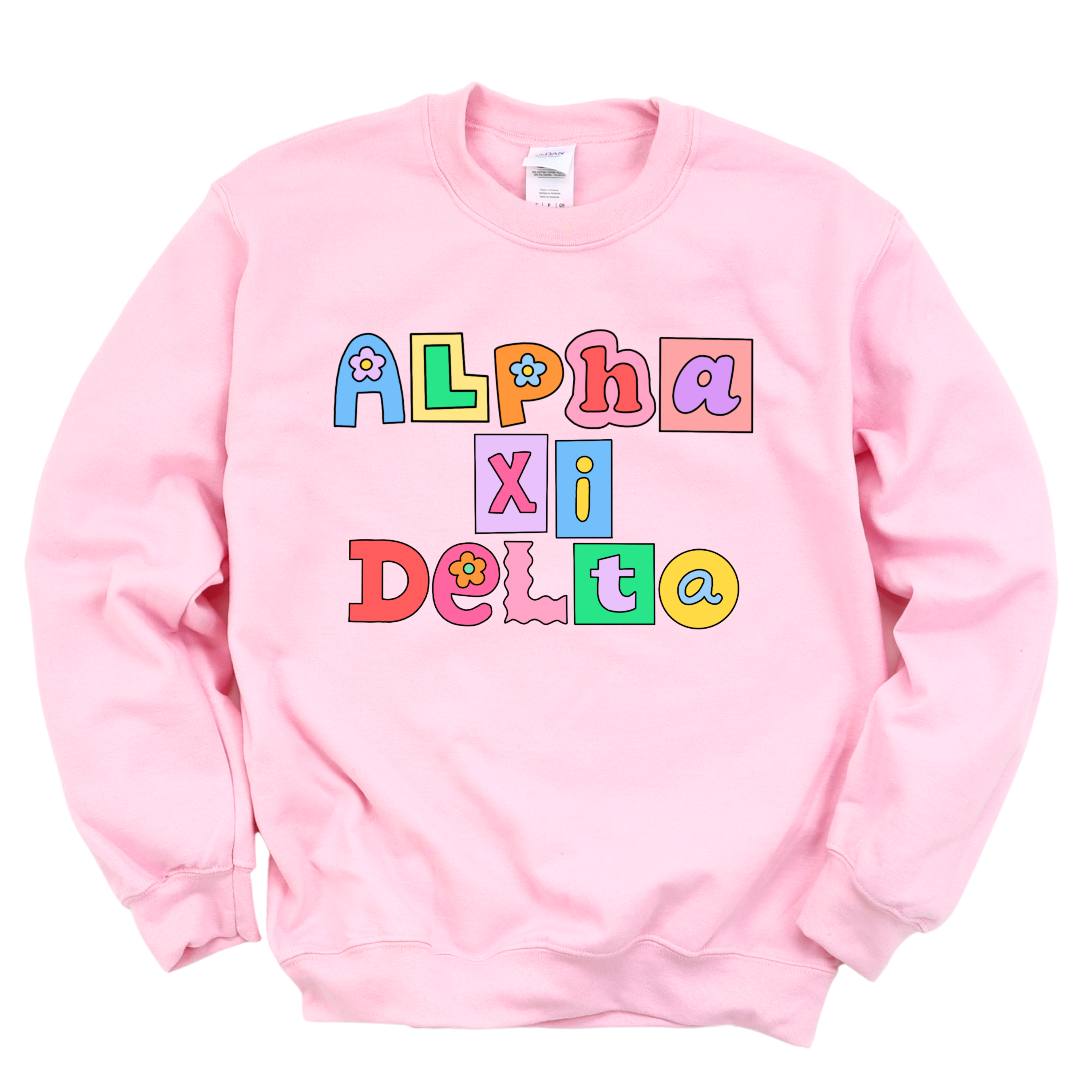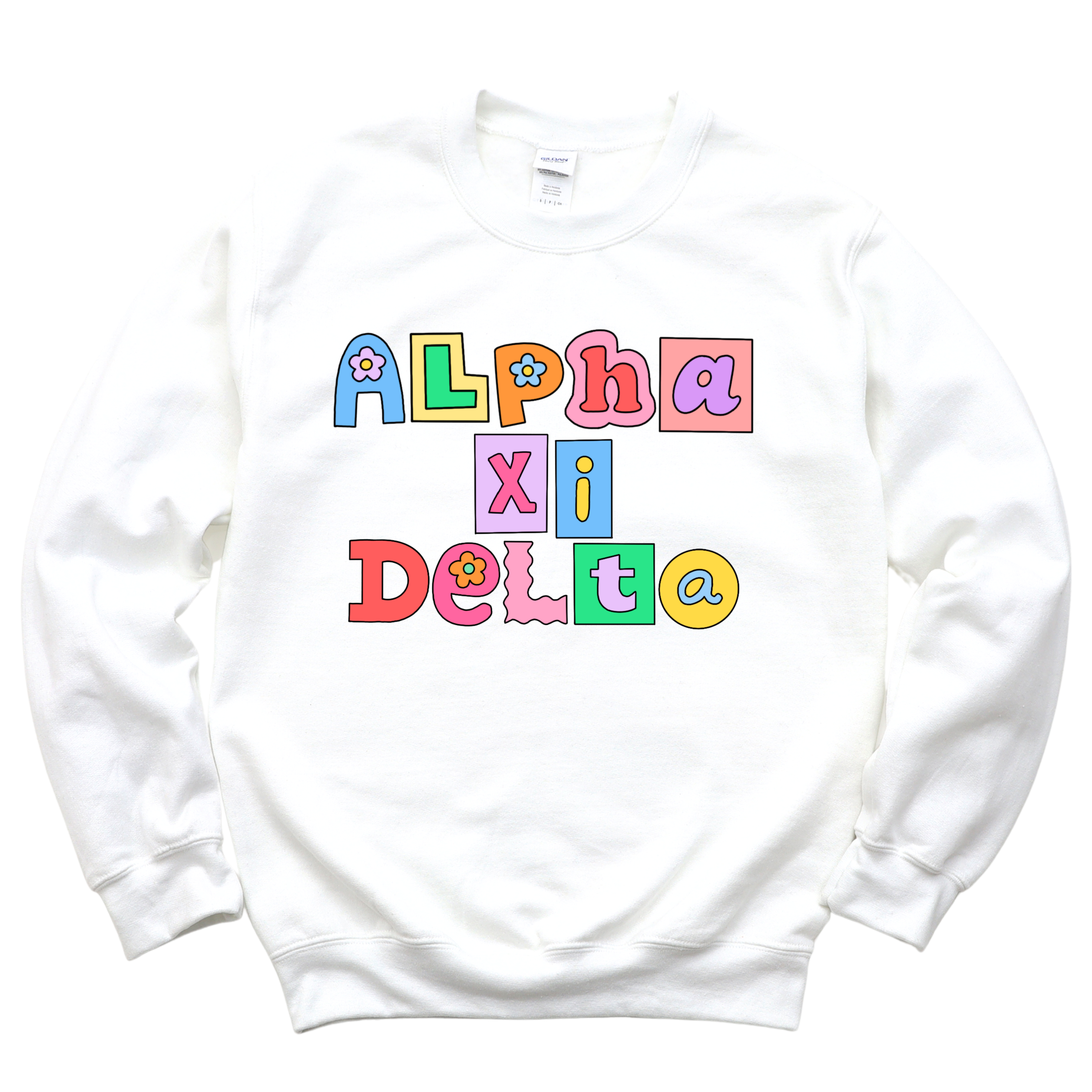 ☆ Bring some color and personality to your wardrobe with this fun block-letter crewneck sweatshirt! Featuring bold letters in vibrant shades, playful shapes, and cheerful accents like hearts and flowers, this cozy sweatshirt is perfect for anyone who loves a bright, uplifting style.