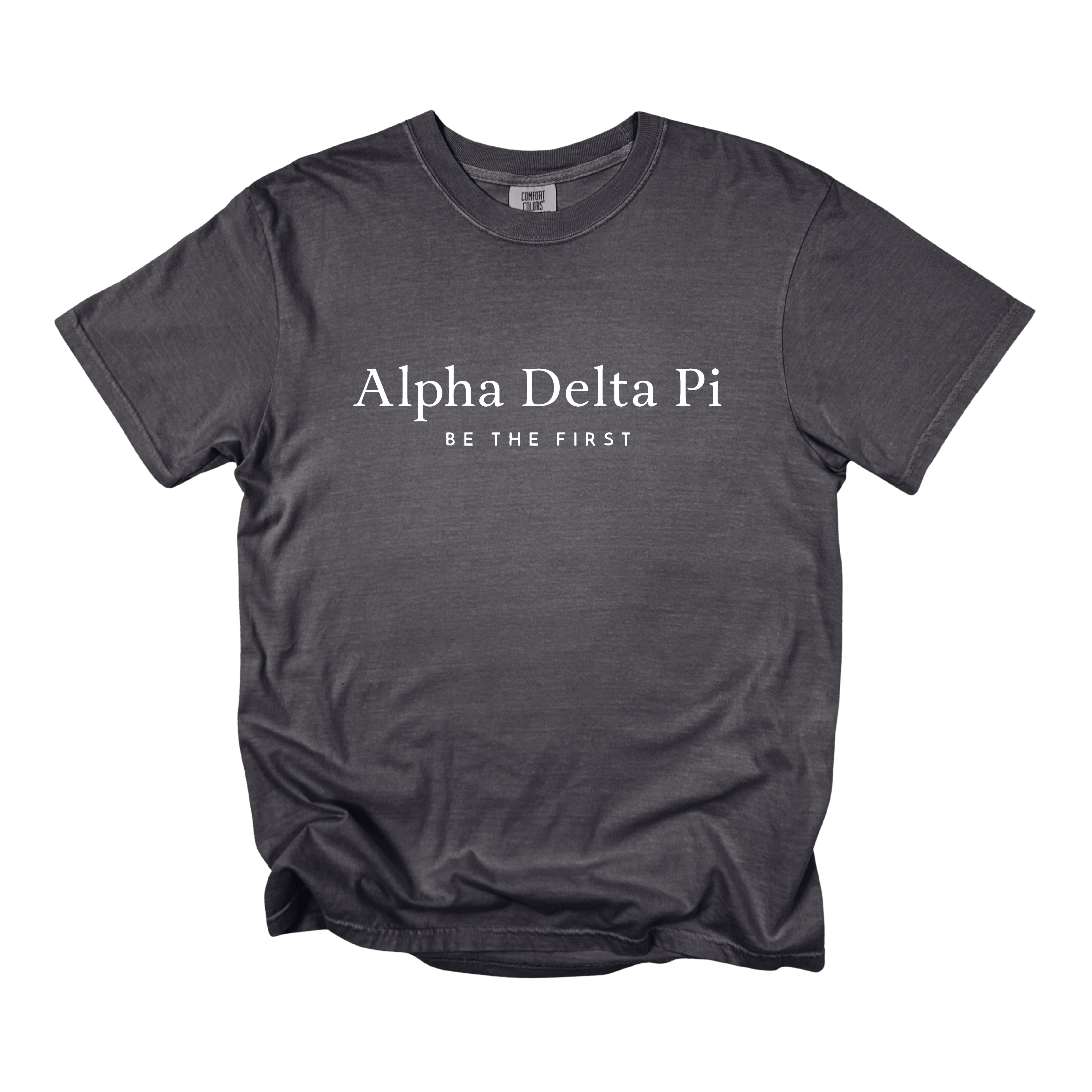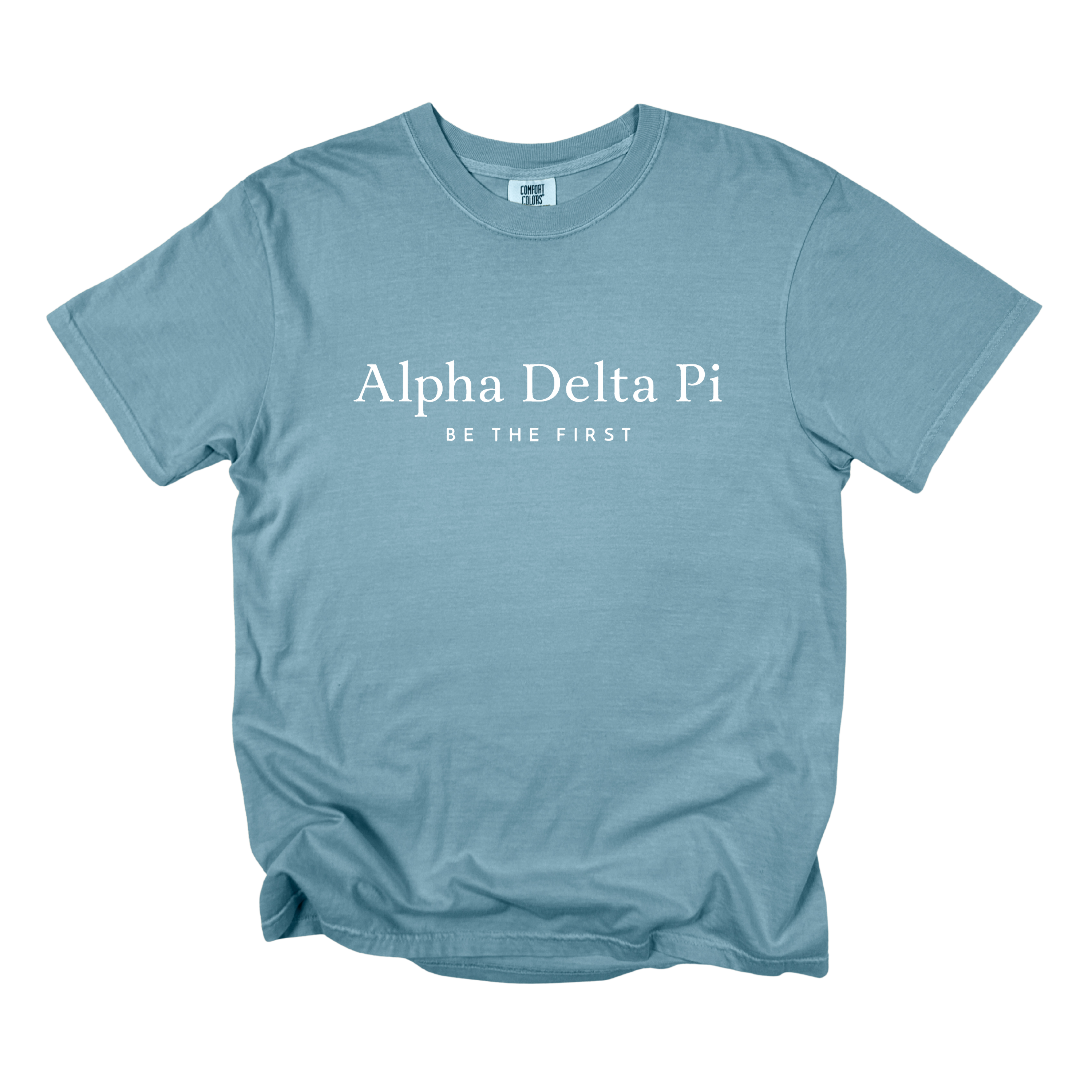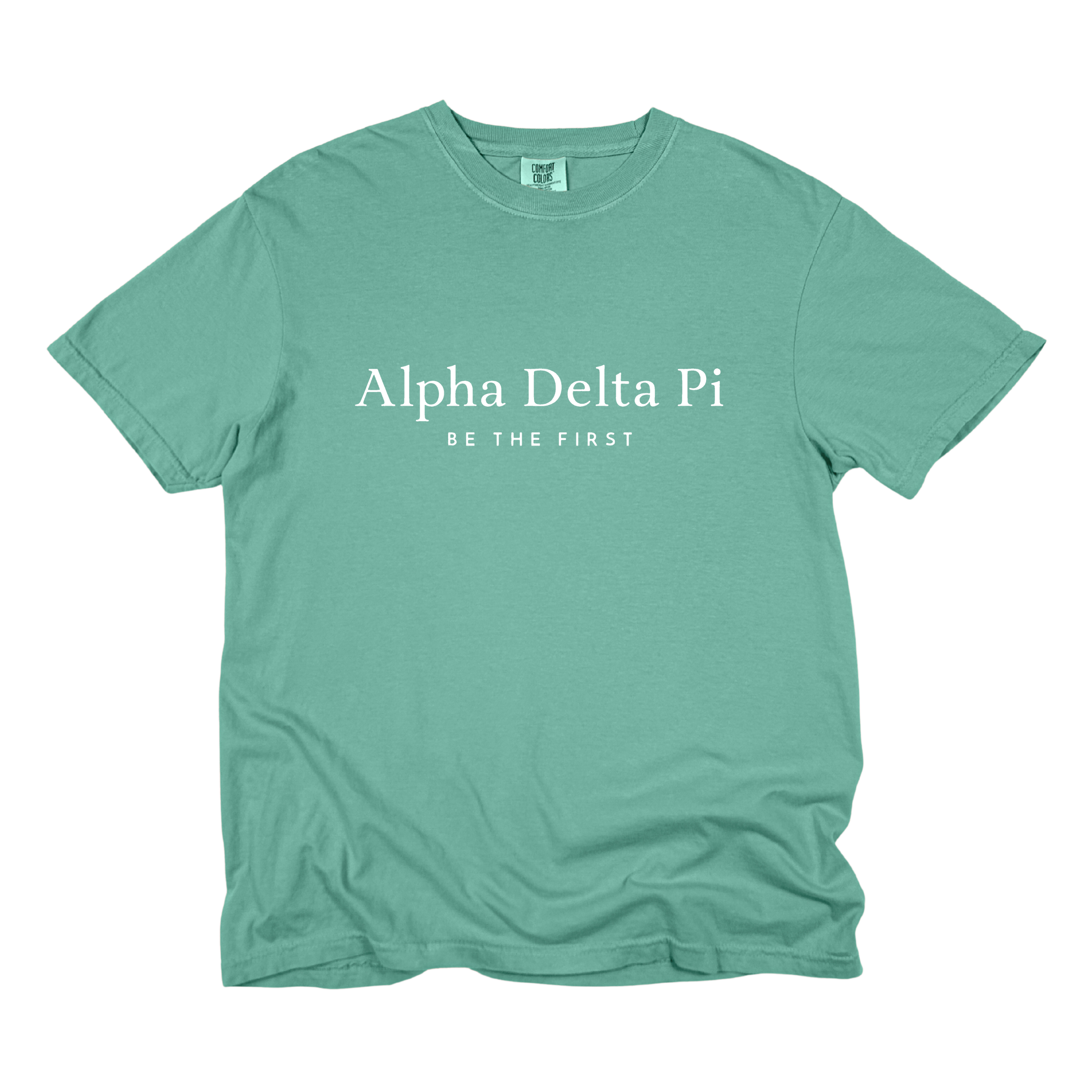Simple, timeless, and effortlessly stylish—the ADPi Minimalist Logo Tee is the perfect everyday Alpha Delta Pi essential. Featuring clean Alpha Delta Pi lettering paired with the motto “Be the First,” this design embraces understated sorority style with a modern edge.