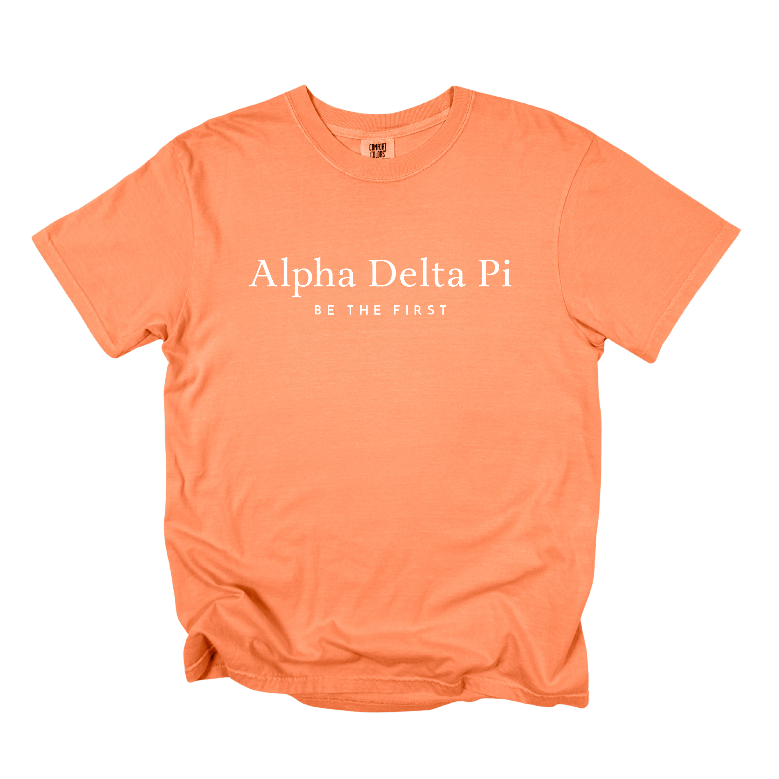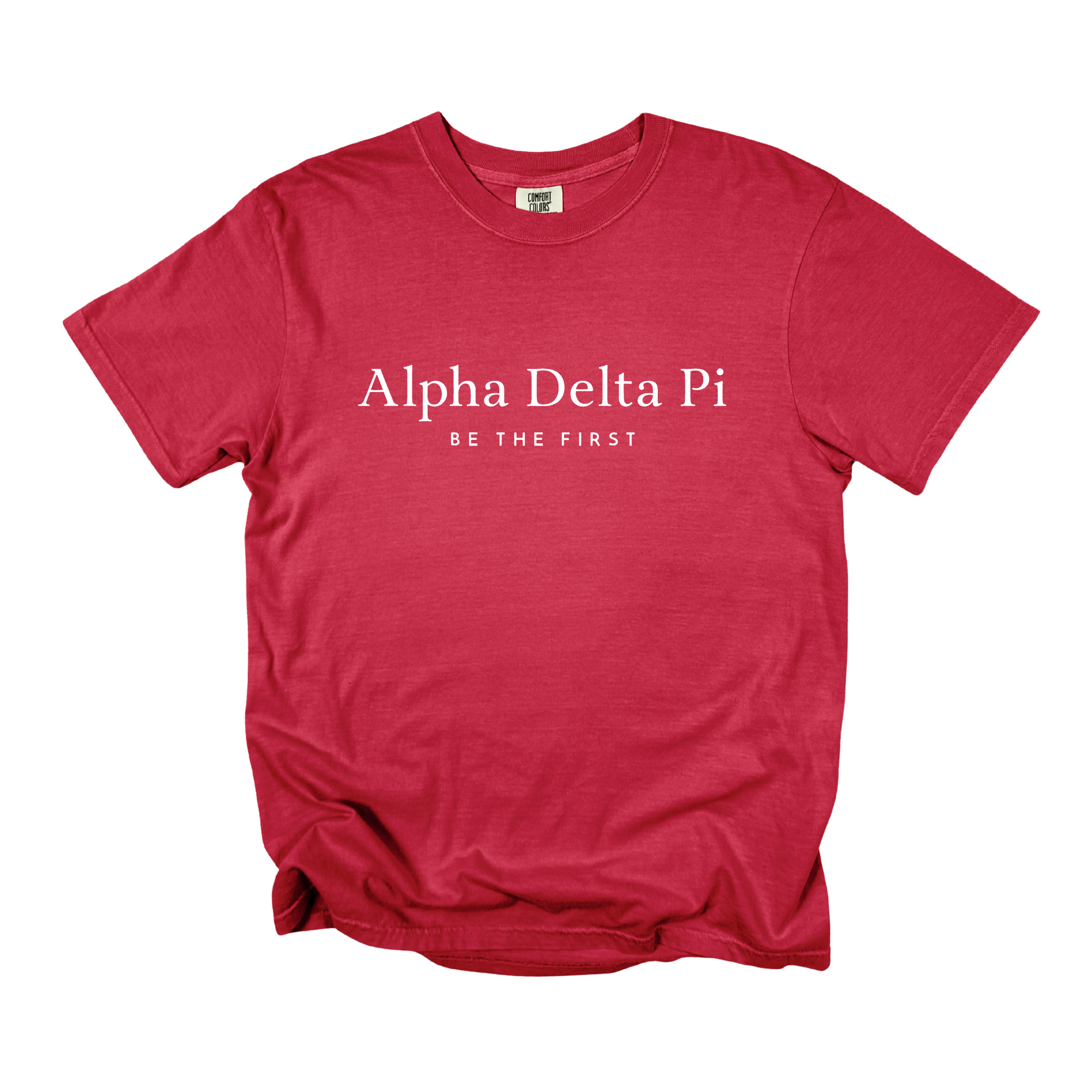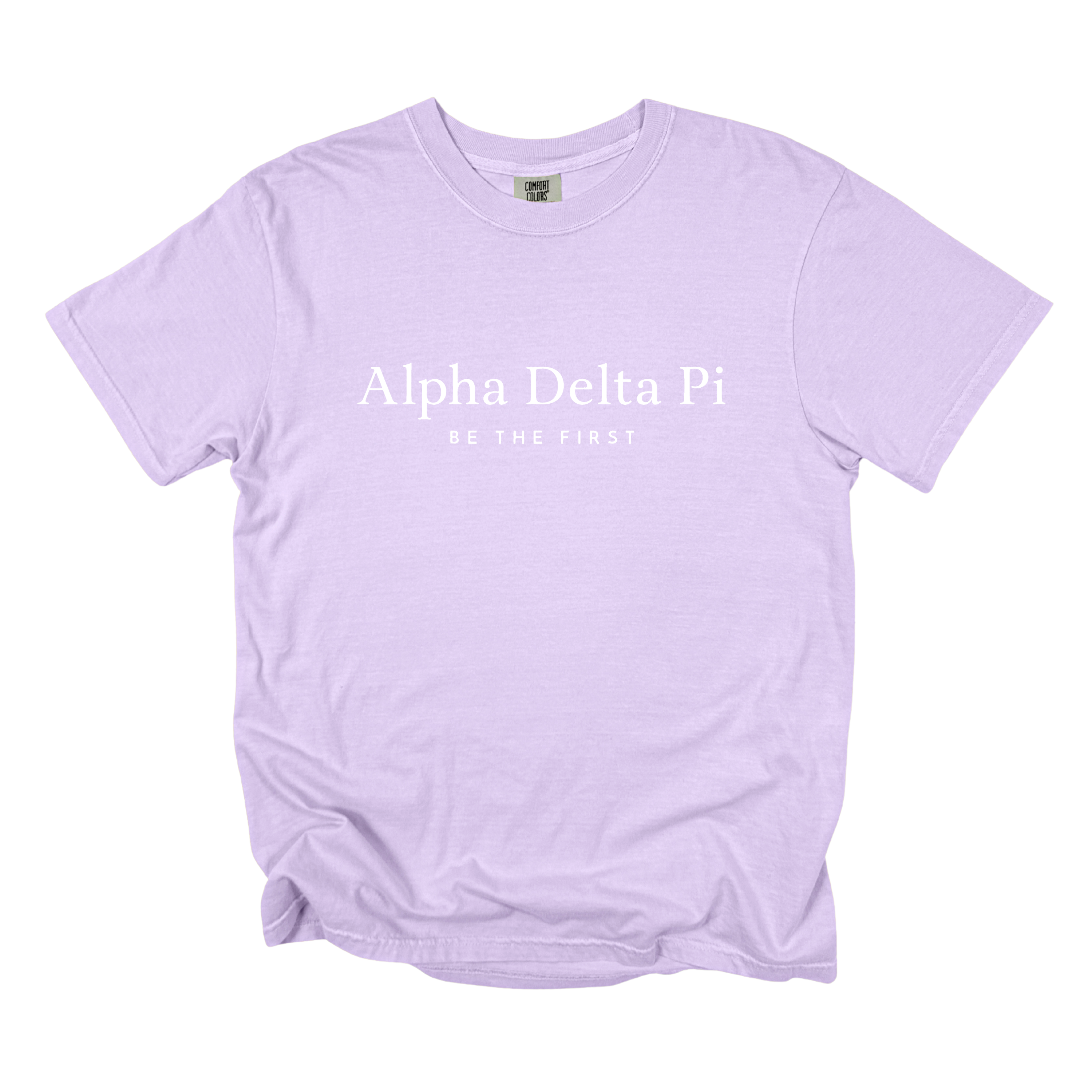 Simple, timeless, and effortlessly stylish—the ADPi Minimalist Logo Tee is the perfect everyday Alpha Delta Pi essential. Featuring clean Alpha Delta Pi lettering paired with the motto “Be the First,” this design embraces understated sorority style with a modern edge.
