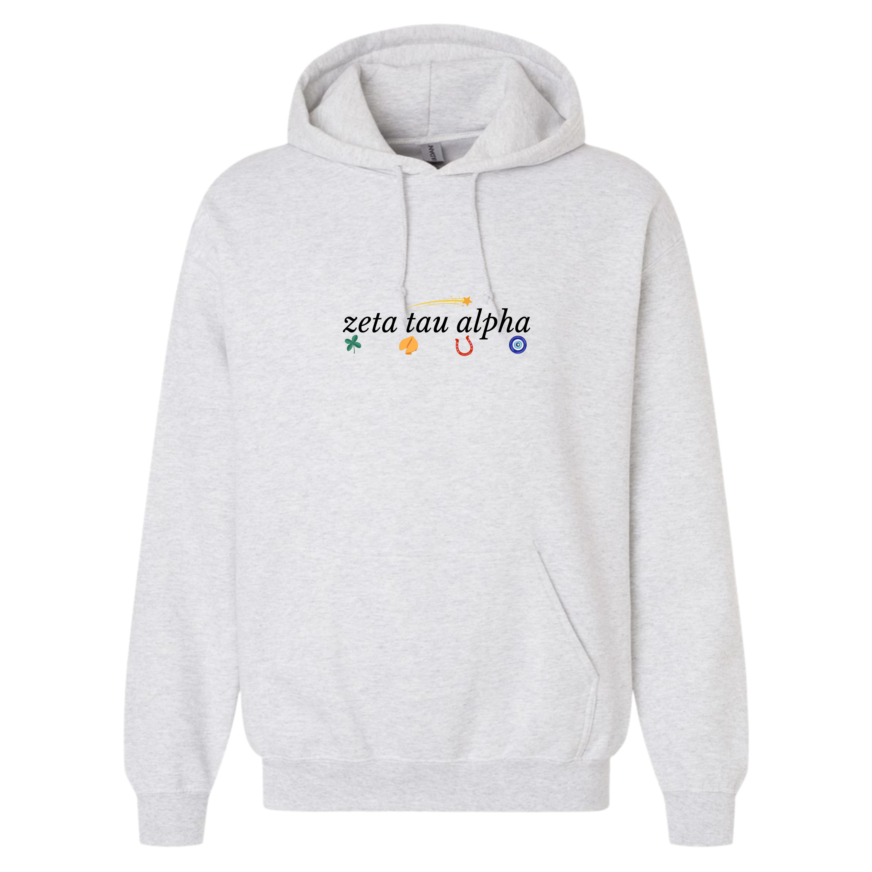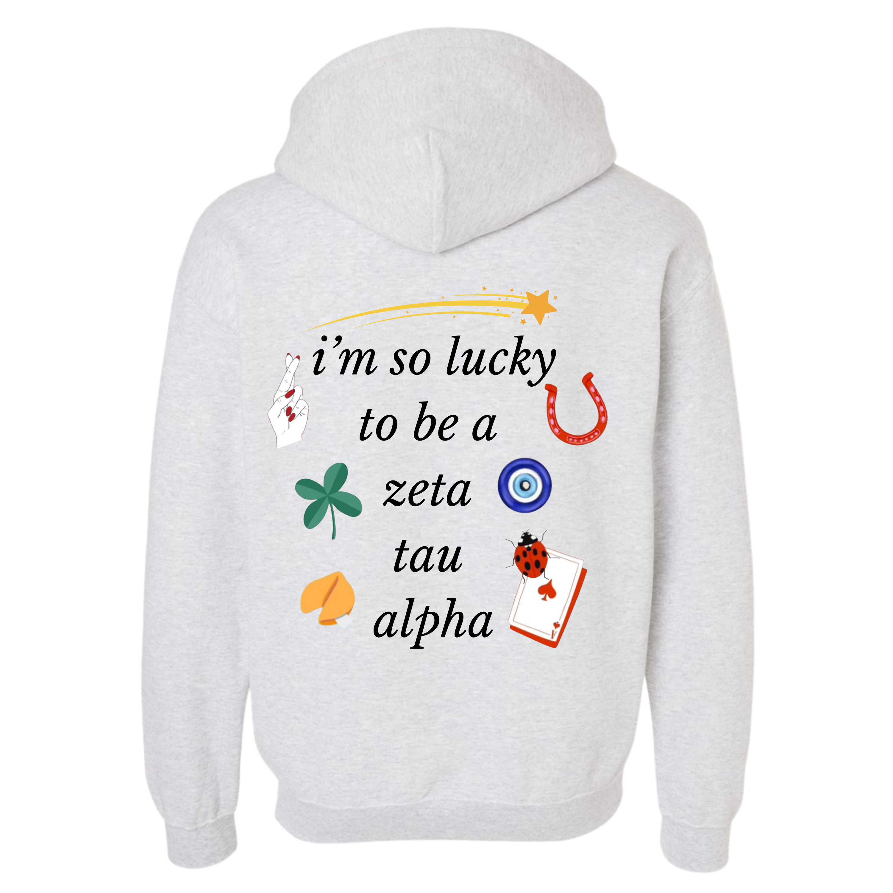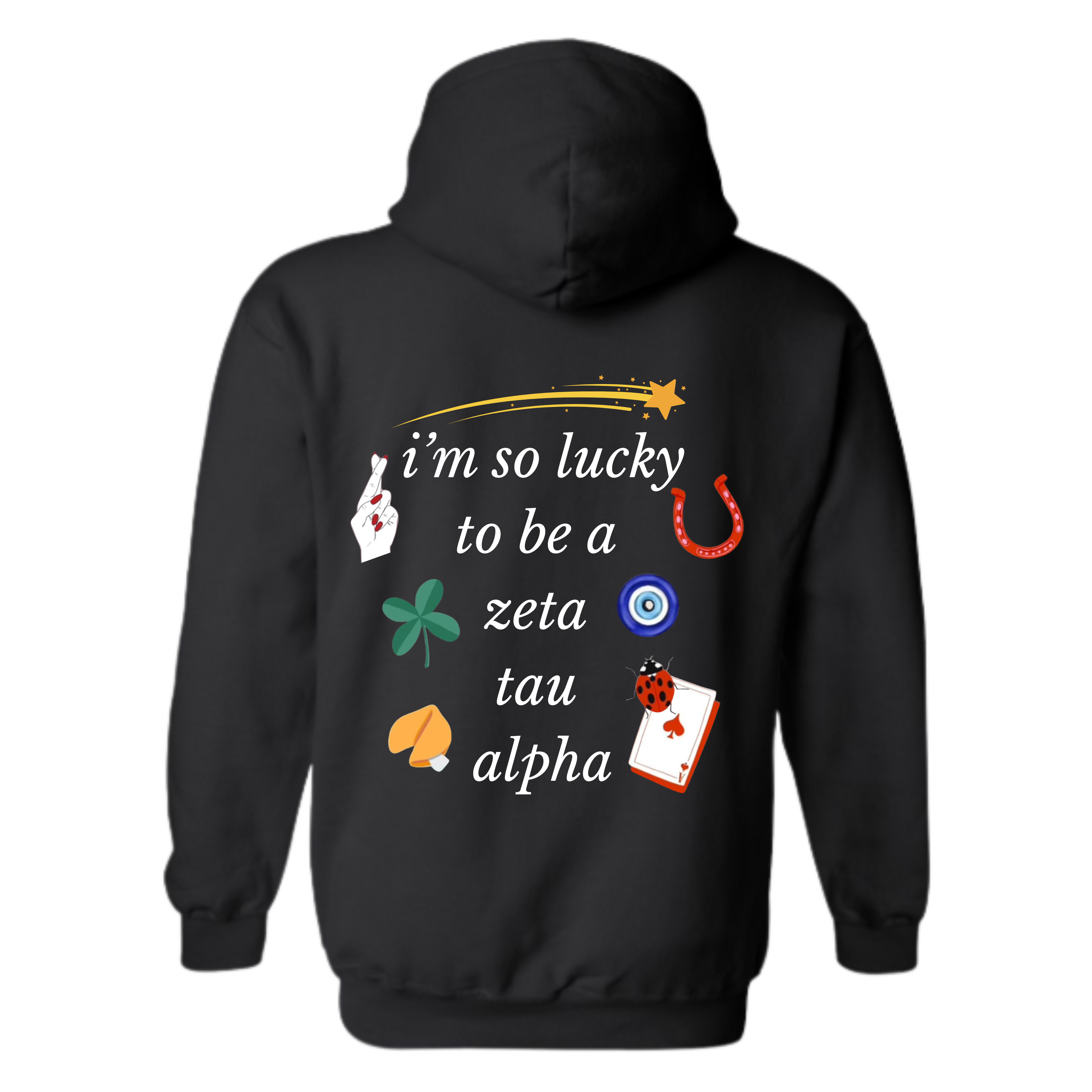 Get ready to embrace your lucky girl era with the cutest, most charm-filled sorority hoodie of the year! This cozy unisex hoodie features a playful mix of lucky symbols — shooting stars, horseshoes, clovers, evil eye, ladybug, aces, and more — wrapped around the phrase “I’m so lucky to be a [Your Sorority]”. It’s the perfect blend of trendy, girly, and sentimental for every sister.
